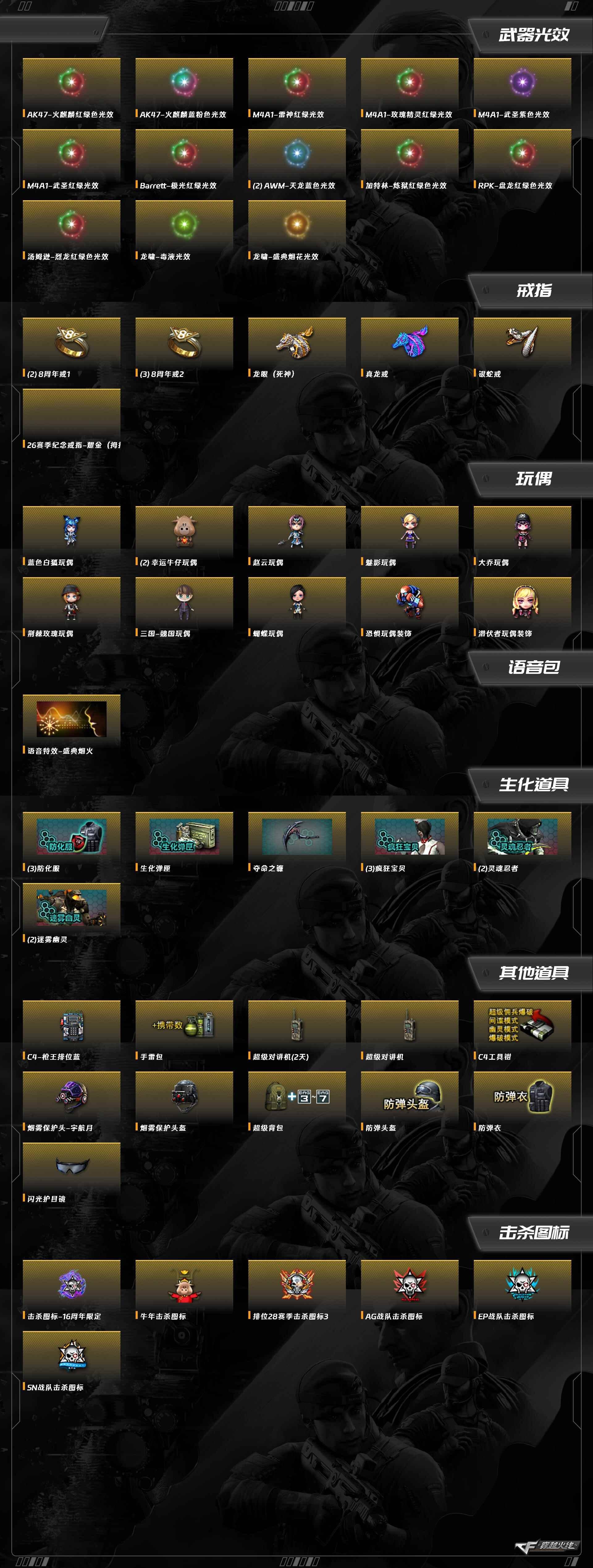 M200-幻神,白虎-电玩蓝兔,炽芒蝶刃,G36C-幻影,龙啸-烈火龙威,AK47-火麒麟,AK-47-猩红传说,M4A1-黑骑士,黑骑士-海王,Barrett-毁灭,沙鹰-修罗,擎天-竞技荣光,沙鹰-天神
