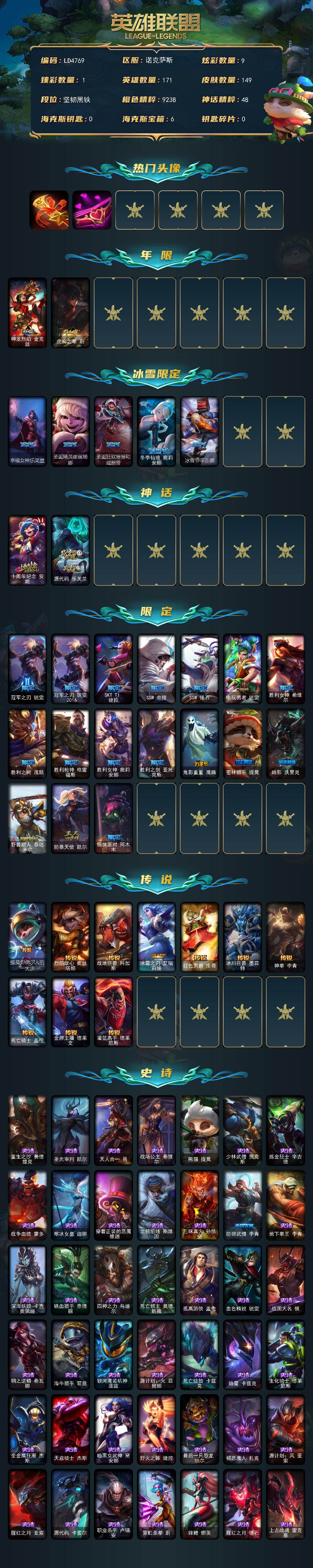 【C26931450】【LD4769】171英雄/149皮肤/2神话/24限定/1臻彩/9炫彩/10传说/42史诗/未定级/卡特琳娜的匕首/爱情之歌/冠军之刃锐雯2016凯旋圣装/神龙烈焰金克丝/虎痴之拳蔚/幸福女神乐芙兰/圣诞精灵崔丝塔娜/圣诞狂欢努努和威朗普/冬季仙境奥莉安娜/冰雪节辛吉德/十周年纪念安妮/源代码乐芙兰/冠军之刃锐雯/冠军之刃锐雯2016/SKTT1婕拉/SSW泰隆/SSW锤石/电玩勇者锐雯/胜利女神希维尔/胜利之树茂凯/胜利枪神格雷福斯/胜利女神奥莉安娜/胜利之剑亚托克斯/鬼影重重魔腾/密林猎手提莫/暗影沃里克/野兽猎人泰达米尔/防暴天使凯尔/惊悚派对阿木木/提莫约德尔人的一大步/烈焰雄心崔丝塔娜/战地巨兽科加斯/冰霜之刃艾瑞莉娅/红色男爵库奇/冰川巨兽墨菲特/神拳李青/死亡骑士盖伦/金牌主播德莱文/灌篮高手德莱厄斯/重生之沙费德提克/圣光审判凯尔/天人合一易/战场公主希维尔/熊猫提莫/少林武僧贾克斯/炼金狂士辛吉德/战争血统蒙多/寒冰女皇迦娜/穿着正装的恶魔维迦/北领前线斯维因/三昧真火孙悟空/防弹武僧李青/地下拳王李青/深海妖姬卡西奥佩娅/铁血猎手奈德丽/四神之力乌迪尔/死亡领主莫德凯撒/孤高游侠盖伦/血色精锐锐雯/战国大名慎/钢之逆鳞希瓦娜/海牛猎手菲兹/银河魔装机神菲兹/源计划火菲奥娜/死亡绽放卡兹克/暗星卡兹克/生化骑士德莱厄斯/全金属狂潮杰斯/天启骑士杰斯/暗黑女武神黛安娜/野火之藤婕拉/最后一只恐龙纳尔/邪恶魔人扎克/源计划风亚索/腥红之月亚索/源代码卡蜜尔/职业杀手卢锡安/霓虹杀拳蔚/锦鲤娜美/腥红之月锤石/上古战魂雷克塞/孤胆英豪嘉文四世/战地之王加里奥/冰河时代奥拉夫/小红帽安妮/地狱火奥拉夫/幽蓝梦魇加里奥/逍遥赌侠崔斯特/皇家守卫赵信/赵云子龙/弗拉基米尔伯爵/五杀摇滚女声主唱凯尔/金牛座阿利斯塔/部落精神瑞兹/美国大叔瑞兹/宗师级法师训练师瑞兹/瑞兹白须/原野伐木工赛恩/游击队员崔丝塔娜/荒野巨兽努努和威朗普/攻城巨兽努努和威朗普/西部牛仔厄运小姐/勇敢的心艾希/科学狂人辛吉德/黑暗女王伊芙琳/北风冻原图奇/五杀摇滚主唱卡尔萨斯/小丑工作坊萨科/健美教练蒙多/硬汉蒙多/幽灵船长普朗克/昔日霸主普朗克/樱花乱舞卡尔玛/冰壶选手维迦/垃圾场特朗德尔/擂台皇帝布里茨/珊瑚礁墨菲特/石破天惊墨菲特/赏金猎人卡特琳娜/烈焰古树茂凯/血石战神雷克顿/焰执事布兰德/摩登骇客薇恩/热带丛林兰博/荒漠之咬卡西奥佩娅/沙暴巨蝎斯卡纳/沙之守护斯卡纳/法国女仆奈德丽/乡村农夫古拉加斯/狂热球迷古拉加斯/黑桃皇牌伊泽瑞尔/龙骑士莫德凯撒/五杀摇滚吉他手莫德凯撒/五杀摇滚贝斯手约里克/奈落之炎阿卡丽/刺身之拳阿卡丽/索诺拉沙虫克格莫/主治医师慎/杀出重围格雷福斯/坚韧不屈沃利贝尔/夜魔水晶韦鲁斯/地底迷城诺提勒斯/死亡骑士瑟庄妮/德莱德莱德莱文/热血班长德莱厄斯/方块王后辛德拉/狂狮纳尔/泳池派对扎克/夺命前锋卢锡安/任性学霸艾克/源代码娜美/腥红之月卡莉丝塔