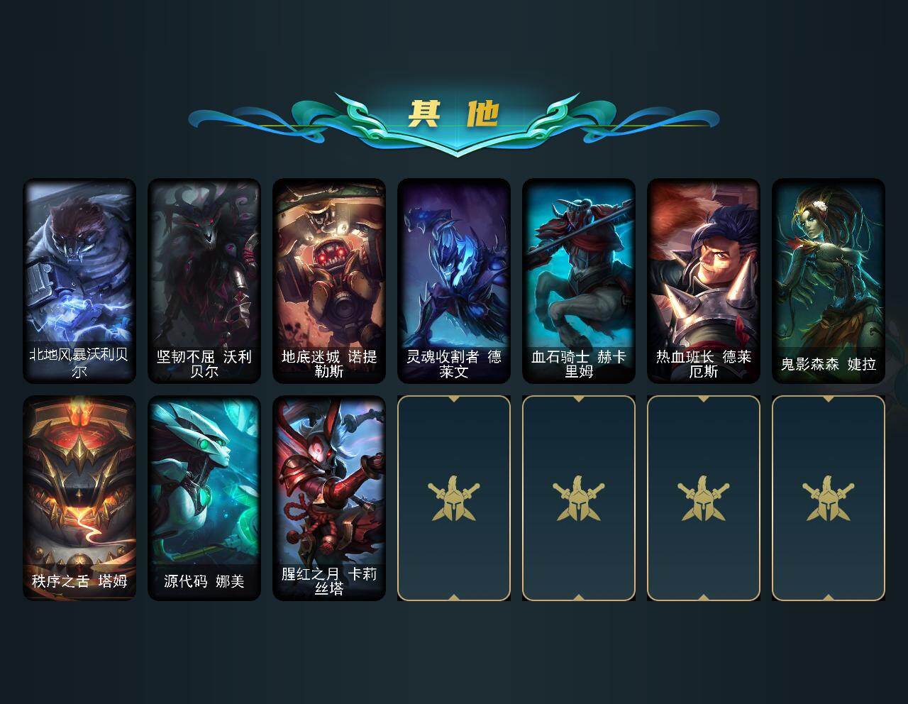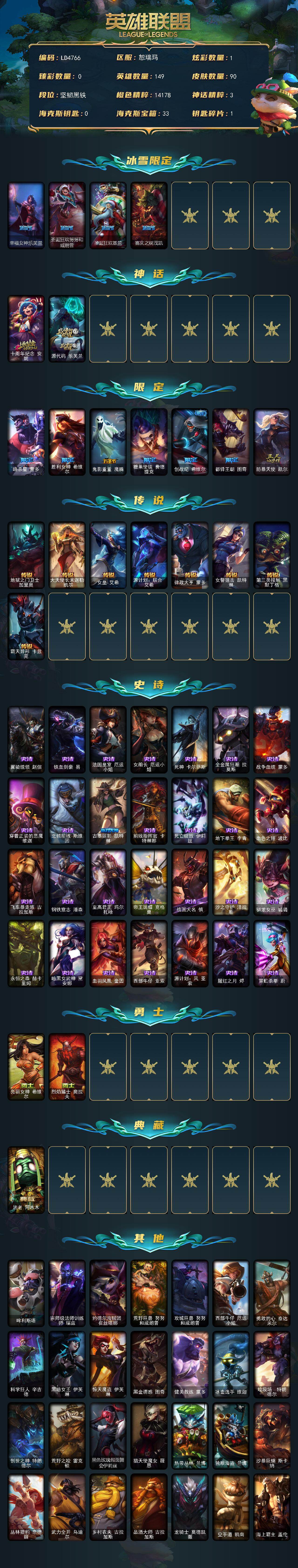 【C26952376】【LD4766】149英雄/90皮肤/2神话/11限定/1炫彩/8传说/28史诗/未定级/幸福女神乐芙兰/圣诞狂欢努努和威朗普/圣诞狂欢基兰/喜庆之树茂凯/十周年纪念安妮/源代码乐芙兰/暗杀星蒙多/胜利女神希维尔/鬼影重重魔腾/糖果使徒费德提克/创战纪希维尔/都铎王朝图奇/防暴天使凯尔/地狱之门卫士加里奥/大天使长米迦勒凯尔/女皇艾希/源计划联合艾希/律政大亨蒙多/女警狙击凯特琳/第三类接触黑默丁格/霸天异形卡兹克/翼骑统领赵信/铁血剑豪易/法国皇室厄运小姐/女船长厄运小姐/死神卡尔萨斯/全金属狂潮拉莫斯/战争血统蒙多/穿着正装的恶魔维迦/北领前线斯维因/古墓丽影凯特琳/前线指挥官卡特琳娜/死亡绽放伊莉丝/地下拳王李青/血色之锤波比/飞车暴走族古拉加斯/钢铁意志潘森/至高君王玛尔扎哈/帝王斑蝶克格莫/战国大名慎/沙之守护泽拉斯/驯龙女巫璐璐/永恒之森赫卡里姆/暗黑女武神黛安娜/血羽凤凰奎因/西部牛仔亚索/源计划风亚索/腥红之月烬/霓虹杀拳蔚/亮丽女神希维尔/烈焰猛士奥拉夫/法老阿木木/哞利斯塔/宗师级法师训练师瑞兹/约德尔海贼团崔丝塔娜/荒野巨兽努努和威朗普/攻城巨兽努努和威朗普/西部牛仔厄运小姐/勇敢的心泰达米尔/科学狂人辛吉德/黑暗女王伊芙琳/惊天魔盗伊芙琳/黑金诱惑图奇/健美教练蒙多/冰壶选手维迦/垃圾场特朗德尔/创世之神特朗德尔/荒野之咬雷克顿/黑色玫瑰假面舞会伊莉丝/猎天使魔女薇恩/热带丛林兰博/独眼海盗兰博/沙暴巨蝎斯卡纳/丛林猎豹奈德丽/武力全开乌迪尔/乡村农夫古拉加斯/品酒大师古拉加斯/龙骑士莫德凯撒/空手道凯南/海上霸主盖伦/北地风暴沃利贝尔/坚韧不屈沃利贝尔/地底迷城诺提勒斯/灵魂收割者德莱文/血石骑士赫卡里姆/热血班长德莱厄斯/鬼影森森婕拉/秩序之舌塔姆/源代码娜美/腥红之月卡莉丝塔