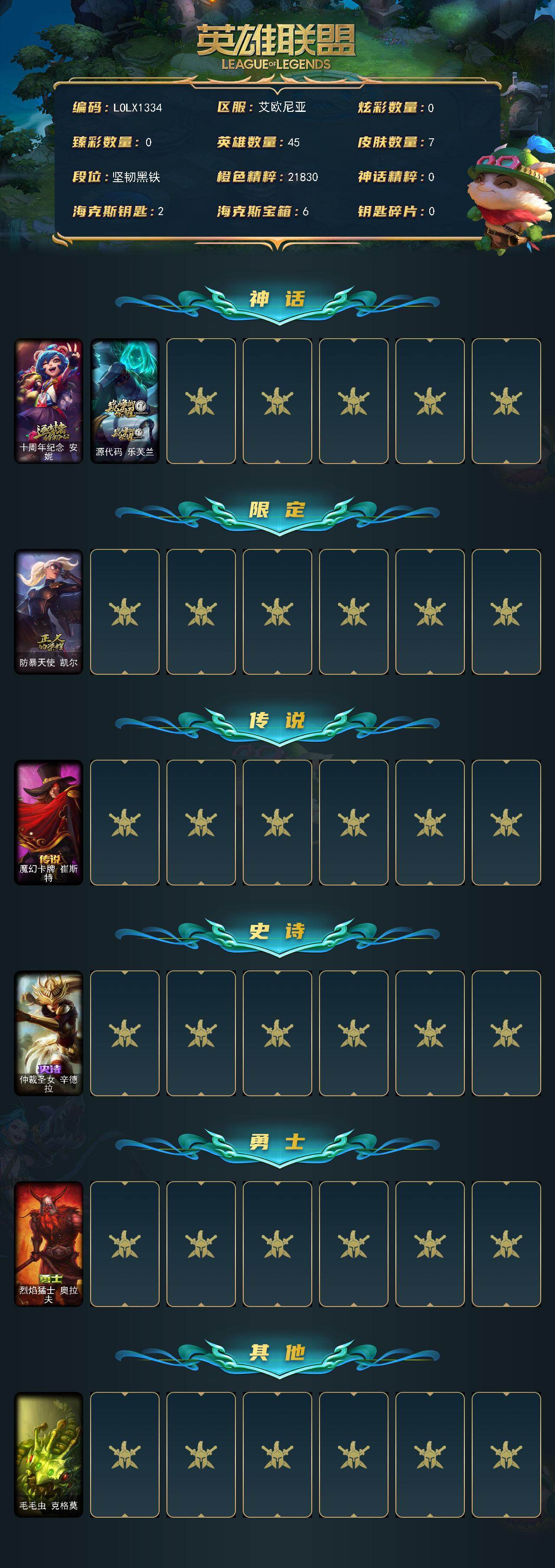 【C26906859】【LOLX1334】45英雄/7皮肤/2神话/1限定/1传说/1史诗/未定级/十周年纪念安妮/源代码乐芙兰/防暴天使凯尔/魔幻卡牌崔斯特/仲裁圣女辛德拉/烈焰猛士奥拉夫/毛毛虫克格莫