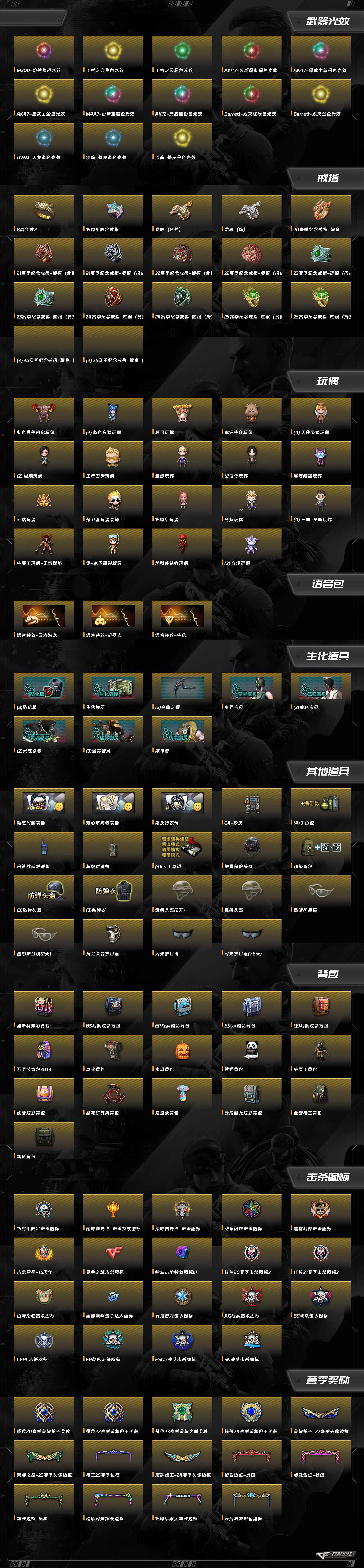加特林-炼狱,Barrett-毁灭,Barrett-朱雀,AWM-天龙,AWM-裁决,AA-12-雷霆,HK417-朱雀,QBZ03-金色蔷薇,9A91-烈火,RPK-盘龙,汤姆逊-烈龙,M4A1-堕天神,沙鹰-修罗,擎天-竞技荣光,USP-雷暴,柯尔特-竞技荣光,沙鹰-天神,屠龙,龙啸,麒麟刺,擎天,AK47-火麒麟,M200-幻神,炽芒蝶刃,传说灵眸,烈火-动感闪耀,屠龙-动感闪耀,天神-动感闪耀,龙啸-烈火龙威,Scar Light-白虎,雷神-荣耀世冠,AK47-无影,擎天-云海游龙,AK47-B-战士,AK-47-猩红传说,AK47-B-常胜将军,M4A1-雷神,M4A1-黑骑士,黑骑士-海王,M4A1-死神,M4A1-龙血,M4A1-武圣