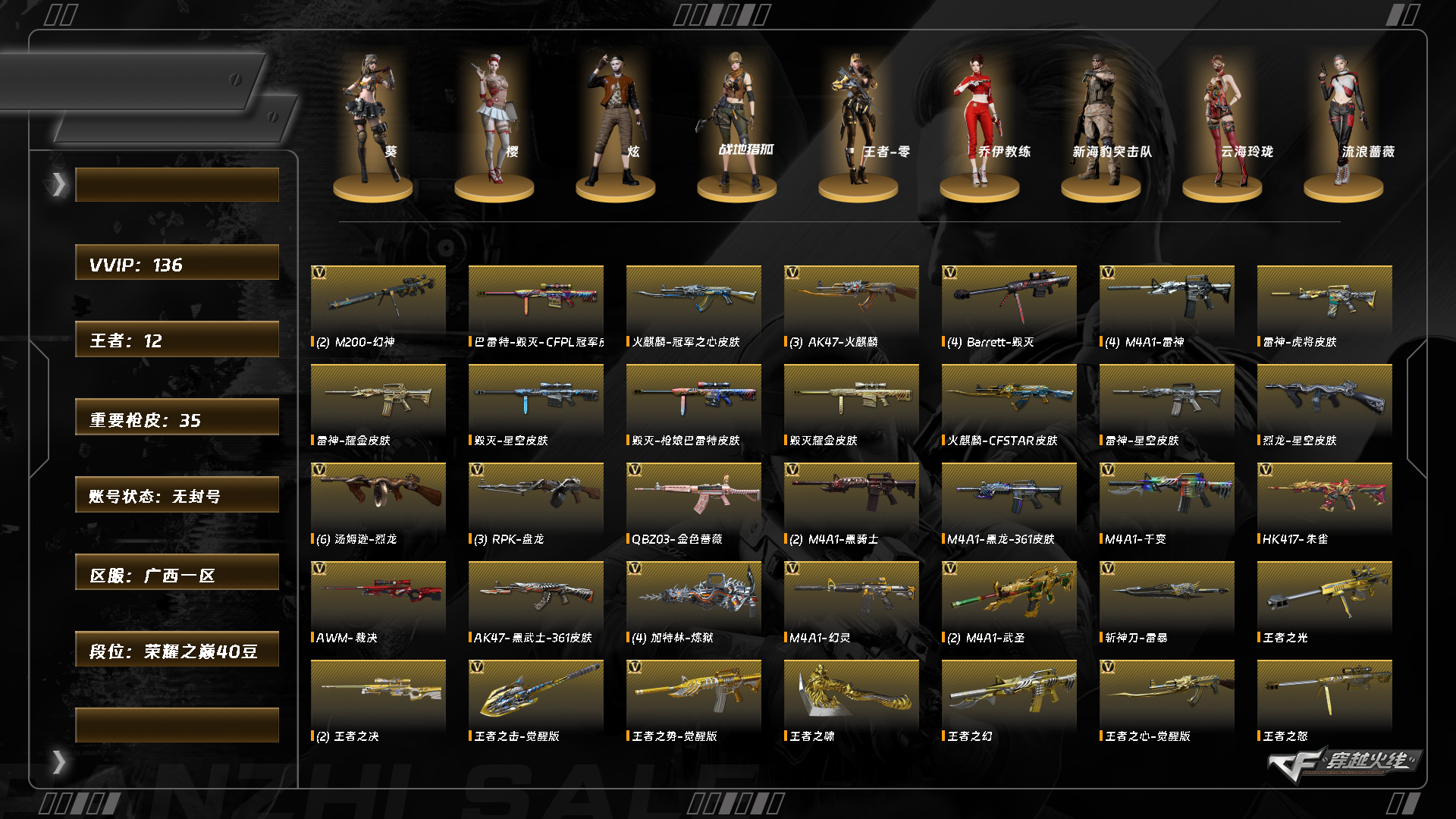 【C261085870】[15483815]ABC11099/南部/广西一区/钱包注销/可排位/可二次/掌火ID:770256006/134V/双/幻神/玄豹/裁决/6烈龙/4炼狱/朱雀/QBZ金色蔷薇/天龙/毁灭/极光/黑骑士/雷神/火麒麟/麒麟/黑龙/【角色】/零纪元/战地猎狐/乔伊教练/王者零/新海豹突击队/云海玲珑/【音效卡】/黑骑士音效卡/雷神音效卡/毁灭音效卡/永久AC/细节看图
