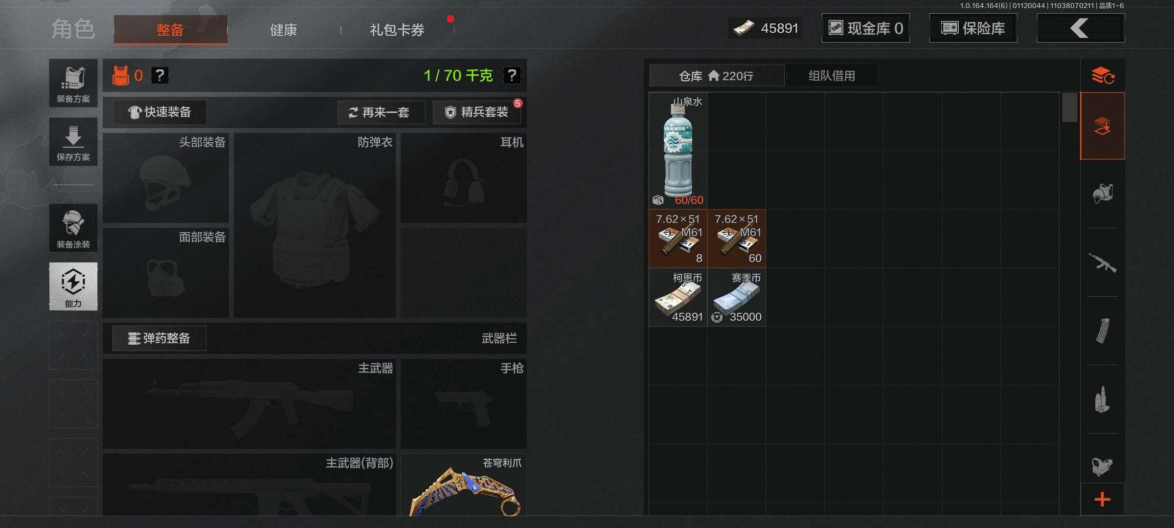 【C261101982】【AQZG954】段位:暗区传说/仓库价值(百万):0.1/柯恩币:45891/急袭弯刀/热能武器补牢/苍穹利爪/脉冲马克西姆/使徒欧瑞恩/骑士之剑VSS/旧王圣谕VSS/利齿风暴MPX/旧王圣谕QBZ191/战术大师AN94/竞技FAL