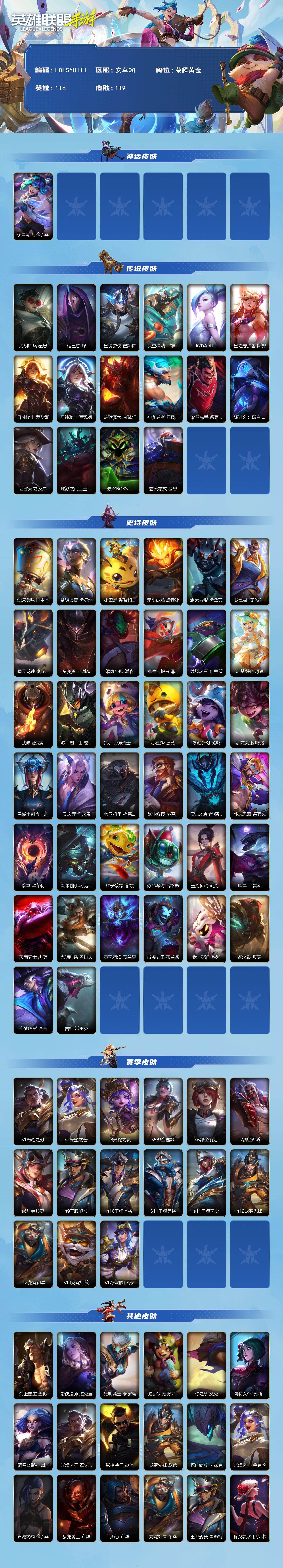 【C261138220】【LOLSYH111】116英雄/119皮肤/荣耀黄金/夜星流火 金克丝/光明哨兵薇恩/暗星尊/星域游侠卡牌/太空律动 “猫猫”布里和里茨 布里茨/K/DA ALLOUT萨勒芬妮/星之守护者阿狸/日蚀骑士蕾欧娜/月蚀骑士蕾欧娜/炼狱魔犬/神龙尊者 驭风啸龙/灌篮高手/源计划: 联合/西部天使寒冰/地狱之门卫士/最终BOSS维迦/霸天零式 赛恩/劲道美味 阿木木/黎明使者卡尔玛/小蜜蜂 努努和威朗普/无限烈焰/霸天异形螳螂/礼物选好了吗? 布隆/霸天龙神龙王/猎龙勇士潘森/清剿小队潘森/福牛守护者剑姬/战场之王机器人/幻梦甜心 阿狸/武神/源计划: 山/我,羽饰骑士 崔丝塔娜/小蜜蜂 提莫/泳池派对 璐璐/驯龙女巫/星域审判官/灵魂莲华永恩/禁卫机甲/战斗教授男枪/灵魂收割者 德莱文/斗魂无双 德莱文/暗星 墨菲特/欧米伽小队 鬼影蛙人/柚子软糖 菲兹/泳池派对炸弹人/玉剑传说 武剑仙/暗星维鲁斯/天启骑士/光明哨兵奥拉夫/灵魂烈焰/战场之王 布兰德/我,怒角/怨之砂/盗梦暗影 锤石/古神狼人/s1光耀之刃/s2光耀之芒/s3光耀之灵/s5绯金魅影/s6绯金丽刃/s7绯金战斧/s8绯金皎灵/s9王牌舰长/s10王牌上将/S11王牌勇将/s11王牌司令/s12龙冕先锋/s13龙冕御盾/s14龙冕神策/s17冠翎御风使/海上霸主/游侠法师/光明骑士卡尔玛/脏兮兮/时之砂/哥特女仆/暗黑女武神皎月/光耀之刃蛮王/秘密特工/龙冕先锋 赵信/死亡绽放/光耀之芒金克斯/双城之战金克斯/猎龙勇士布隆/狮心 布隆/龙冕御盾 布隆/王牌舰长/探戈灵魂寡妇/绯金魅影 (可升级)/银色之牙/皇家守卫/绯金丽刃(可升级)/小红帽/“你看见过我的熊猫吗?” 安妮/西部牛仔亚索/腥红之月亚索/偶像歌手/末世天使/五连摇滚键盘手/光耀之灵/黯黑魔龙龙女/女警官/双城之战蔚/双城之战:破枷 蔚/王牌上将 嘉文四世/海牛骑士/刺客信条/超武乾坤:电弧/创世魔神/单身贵族/西部牛仔女枪/女帝/热血班长/暴风女神/冠翎御风使 迦娜/绯金战斧 (可升级)/极地女神/王牌司令 艾希/哞利斯塔/无畏号/科学狂人/龙冕神策 吉格斯/鲛妮座人 娜美/绯金鲛灵(可升级)/莲花之令刀妹/海贼魅影/蕉泥座人/蔷薇绅士 杰斯/王牌勇将 奥拉夫/铁血狙击手/鳄霸/战争机器/腥红之月锤石/南瓜头 费德提克