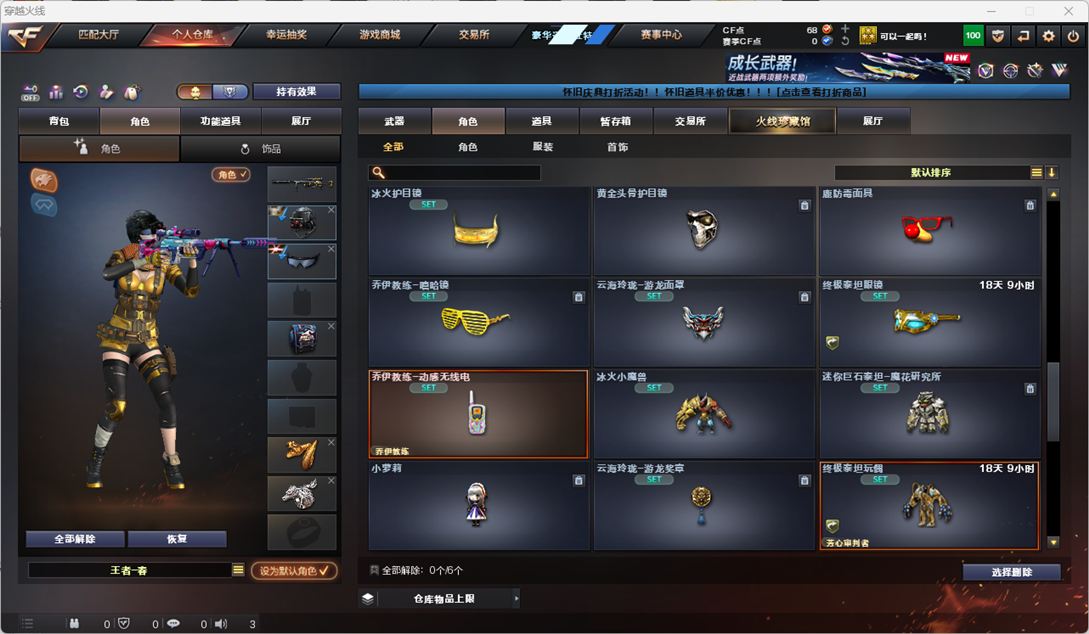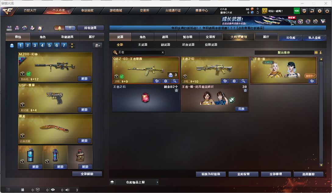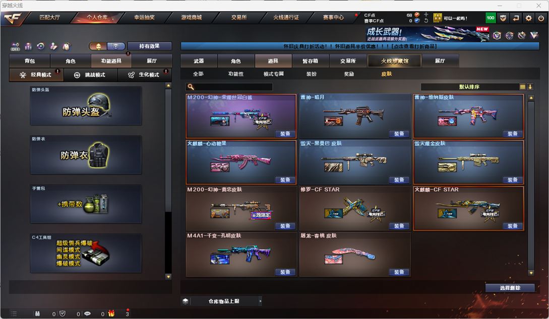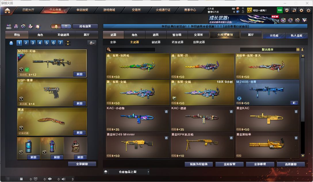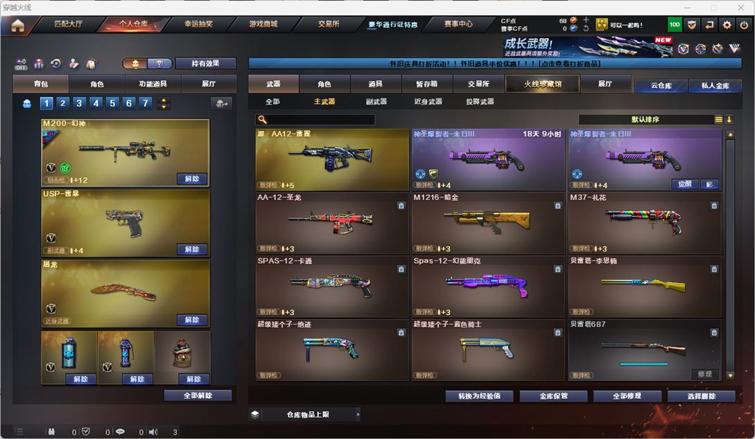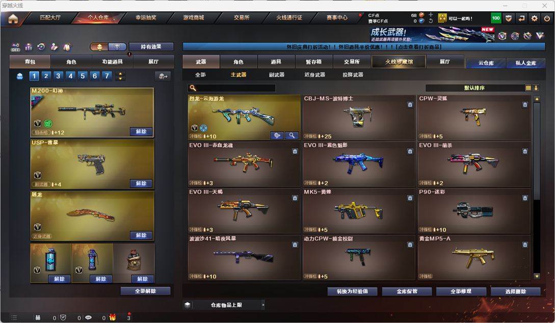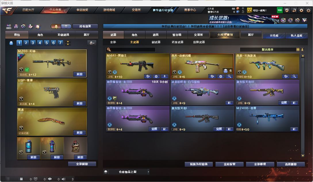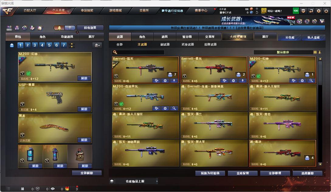 擎天-云海游龙,M200-幻神,烈火-动感闪耀,屠龙-动感闪耀,天神-动感闪耀,龙啸-烈火龙威,M200-竞技荣光,AK47-火麒麟,M4A1-雷神,M4A1-黑骑士,Barrett-毁灭,Barrett-极光,擎天-竞技荣光,USP-雷暴,柯尔特-竞技荣光,屠龙