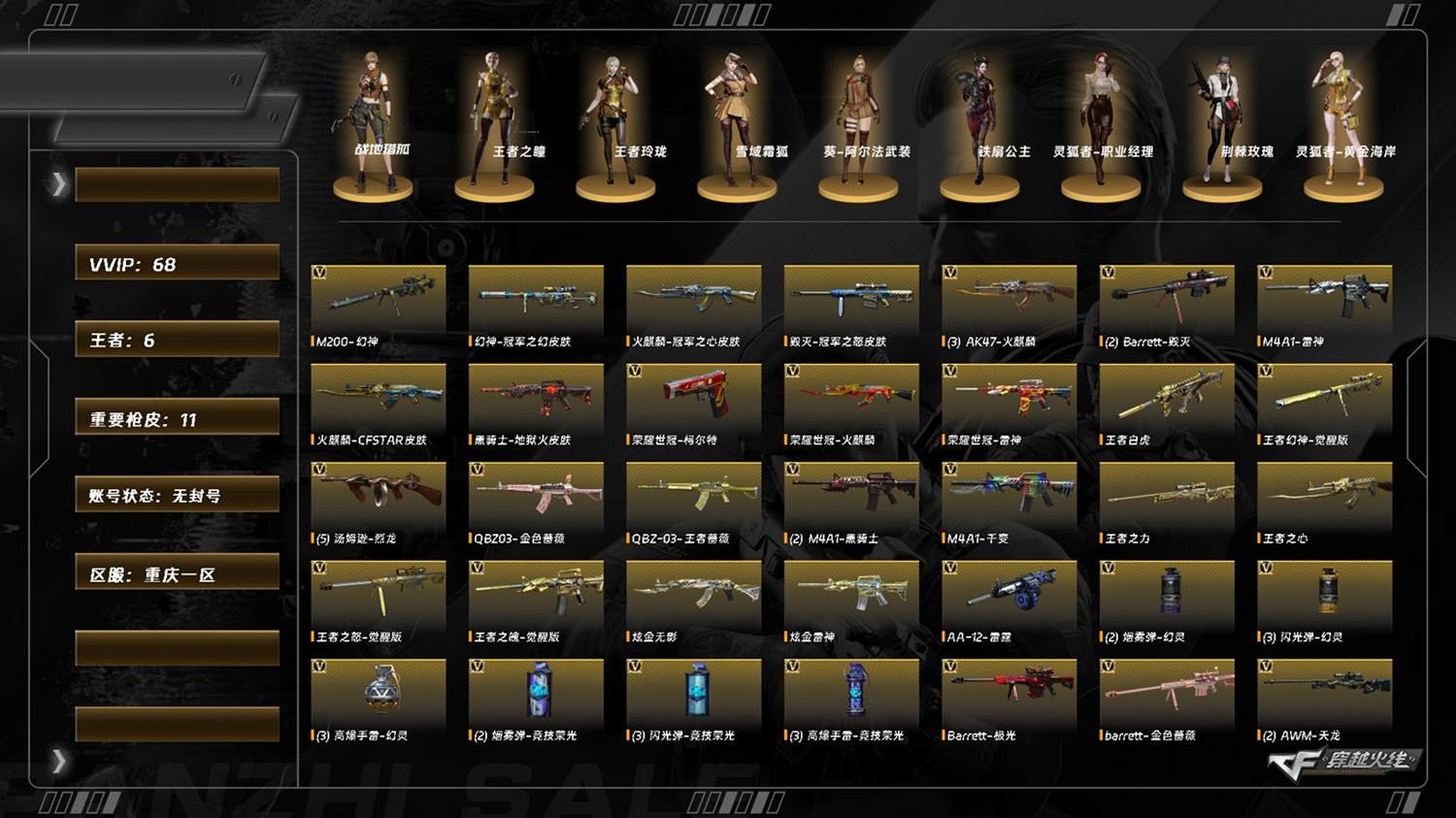 【C261471907】[15647935]LC7220/西部/重庆一区/可排位/67v/幻神/幻神冠军之幻/王者幻神/觉醒版/白虎电玩蓝兔/QBZ金色蔷薇/荣耀世冠火麒麟/荣耀世冠雷神/荣耀世冠柯尔特/【角色】/战地猎狐/葵阿尔法武装/王者玲珑/王者之瞳/雪域霜狐/【音效卡/昌龙怀旧音效卡/炼狱百战金芒庆典舞曲音效卡/麒麟刺百战金芒盛典武器音效卡/毁灭音效卡/死神雪域霜狐怀旧音效卡/】/【枪皮】/毁灭虹光风暴/黑骑士地狱火/雷神维纳斯/火麒麟冠军之心/毁灭冠军之怒/王者武器/王者之心/QBZ王者蔷薇/王者白虎/王者火魄/王者之魄/王者之力/王者之怒/炫金武器/炫金无影/炫金雷神/【小人枪/KAC锯式机枪黑桃战神/】/永久AC/有过十年记录/找回包赔