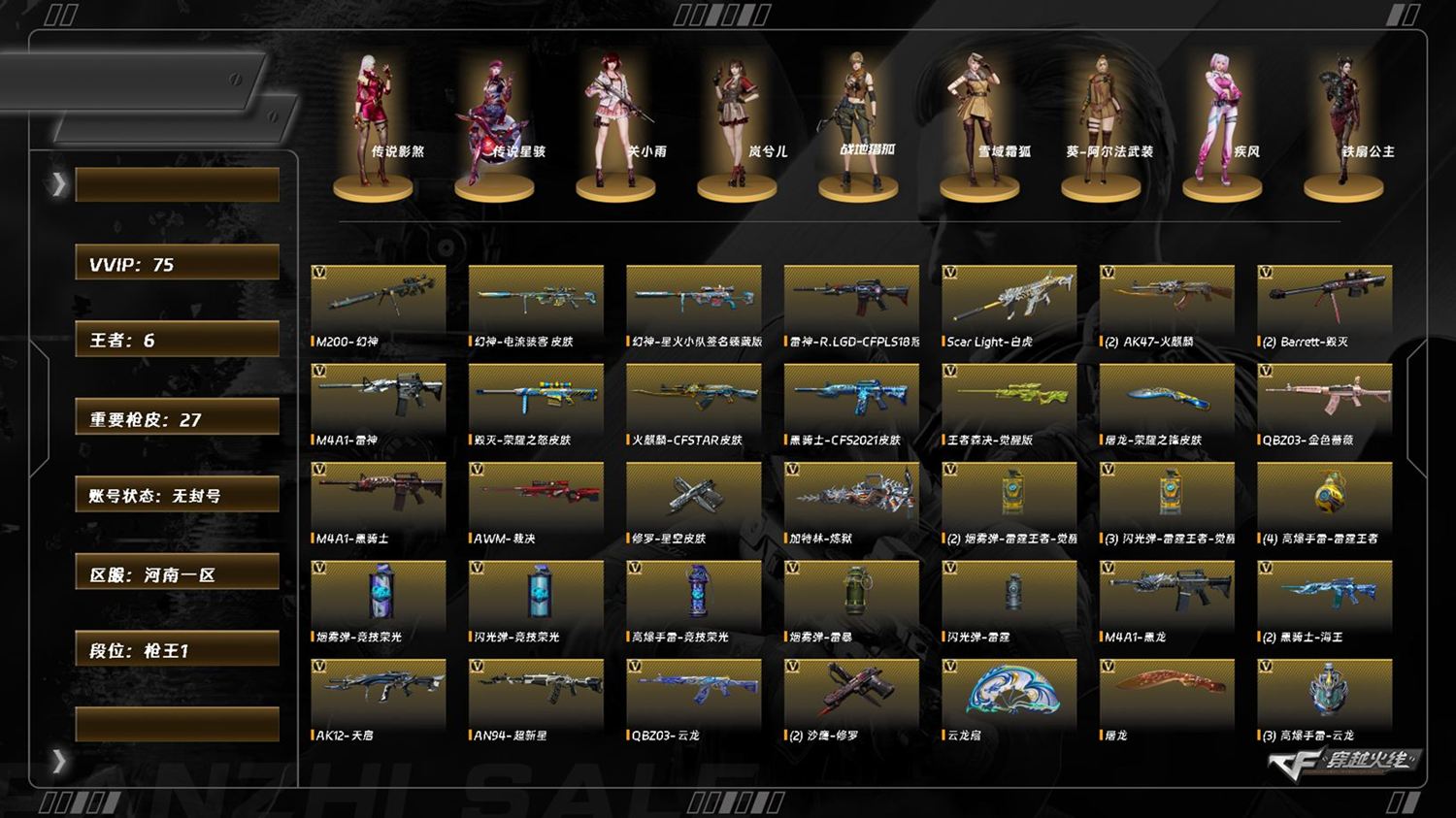 【C261435394】[15648014]LC7239/北部/河南一区/可排位/78v/2传说/【四防传说角色/传说影煞/】/【三防传说角色/传说星骇/】/幻神/幻神星火小队签名臻藏版/幻神电流骇客/王者星霆/觉醒版/【白虎三件套/白虎/白虎暗星/白虎盛典舞曲音效卡/】/QBZ金色蔷薇/金色蔷薇破浪逐光/QBZ云龙/【裁决三件套/裁决/裁决运输船/裁决叶芒苍灵/裁决音效卡/】/柯尔特荣耀世冠白鲨2023/【角色】/关小雨/岚兮儿/零纪元/战地猎狐/葵阿尔法武装/奇洋探员/蛇隐宗/雪域霜狐/云海玲珑/【音效卡/超新星热带奇洋音效卡/昌龙怀旧音效卡/炼狱百战金芒庆典舞曲音效卡/毁灭音效卡/黑骑士音效卡/碧霄极光音效卡/死神雪域霜狐怀旧音效卡/】/【枪皮】/加特林炼狱钟馗/擎天傲竹金蛇/雷神脉冲核心/龙啸蛇姬/雷神宇航兔/黑骑士CFS2021/雷神老干爹/雷神源计划/王者武器/王者森决/王者岩刺/【小人枪/朱雀蛇隐宗/白虎枪娘安妮/火麒麟零纪元/*2/炼狱枪娘掣电/COP白鲨/KAC锯式机枪黑桃战神/】/永久AC/找回包赔