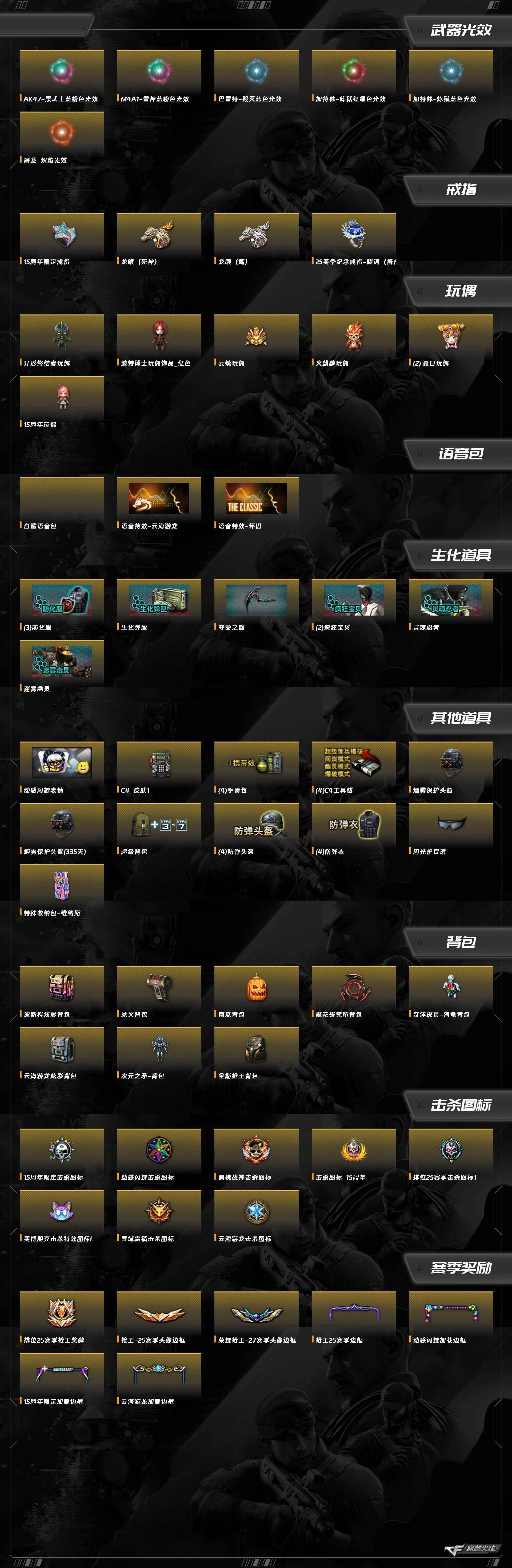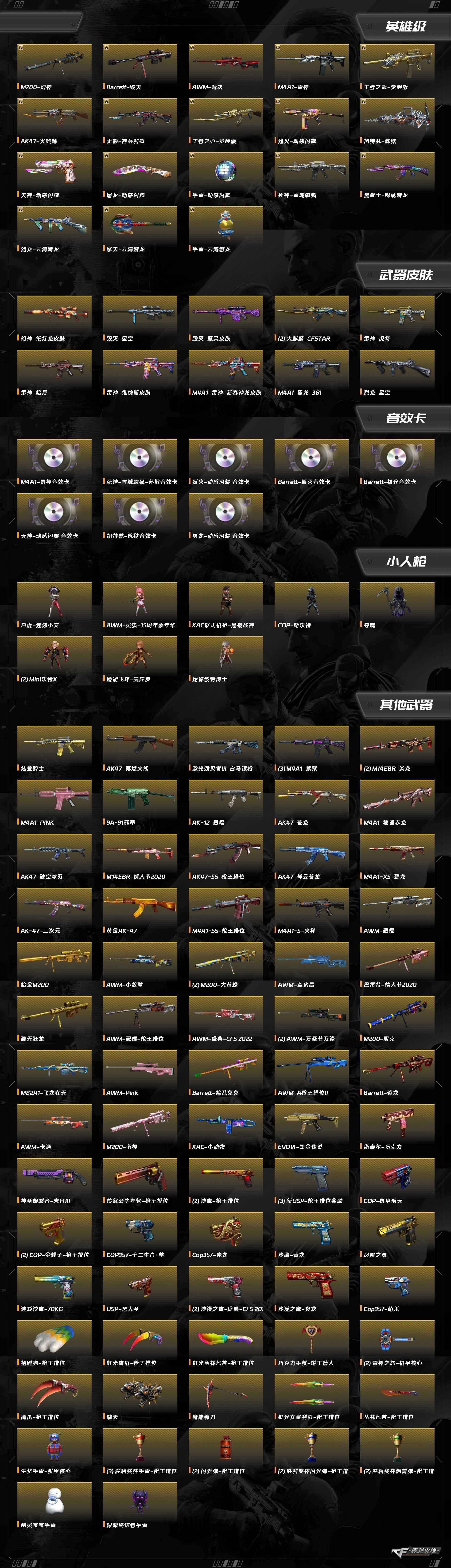 擎天-云海游龙,M200-幻神,烈火-动感闪耀,屠龙-动感闪耀,天神-动感闪耀,AK47-火麒麟,M4A1-雷神,Barrett-毁灭,AWM-裁决,加特林-炼狱