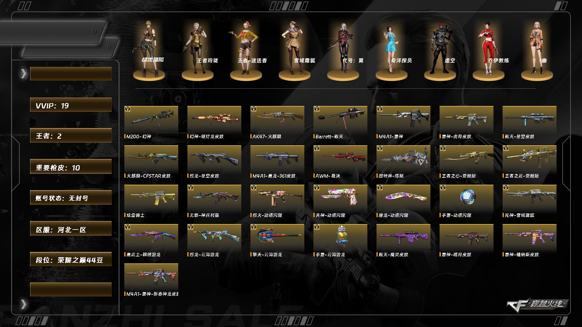 【C261528845】[15658790]XH9863/北部/河北一区/【荣耀之巅44豆】/Lv.93 中将6/VIP6/19V/幻神/幻神纸灯龙/动感闪耀套/毁灭/裁决/雷神/火麒麟/王者之心/王者之武/炼狱/【音效卡】/白鲨语音包/雷神音效卡/死神雪域霜狐怀旧音效卡/烈火动感闪耀音效卡/毁灭音效卡/极光音效卡/天神动感闪耀音效卡/炼狱音效卡/屠龙动感闪耀音效卡/【枪皮】/毁灭魔灵/雷神维纳斯/雷神新春神龙/【角色】/战地猎狐/王者玲珑/王者迷迭香/雪域霜狐/奇洋探员/乔伊教练/幽/云海玲珑/电竞少女/荆棘玫瑰/【小人枪】/白虎迷你小艾/【道具】/永久烟雾头/护目镜/超级背包/各种戒指/各种光效/各种玩偶/永久AC/永久雷包/细节看图/【此账号封十年已解】