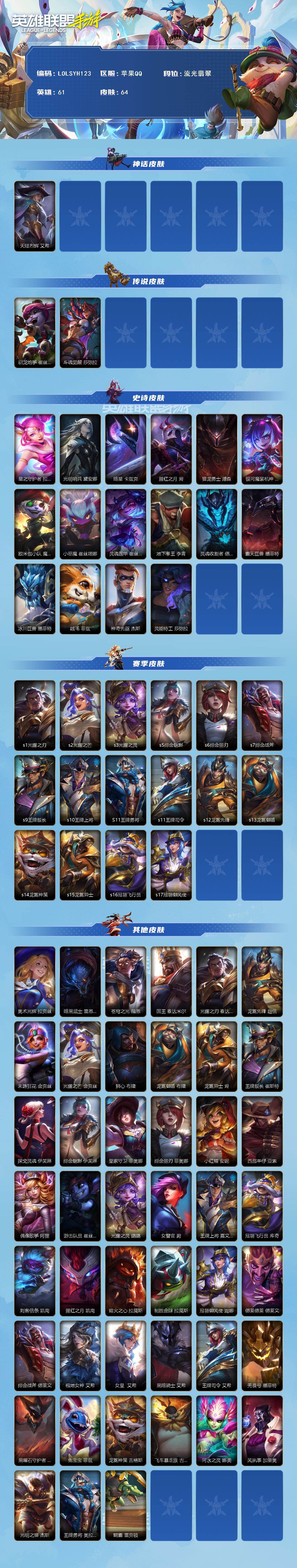 【C261566362】【LOLSYH123】61英雄/64皮肤/流光翡翠/天陨烈辉 艾希/驯龙炮手/斗魂觉醒 莎弥拉/星之守护者拉克丝/光明哨兵戴安娜/暗星螳螂/腥红之月烬/猎龙勇士潘森/银河魔装机神安妮/欧米伽小队 魔鬼伞兵/小恶魔/灵魂莲华 崔丝塔娜/地下拳王/灵魂收割者 德莱文/霸天巨兽石头人/冰川巨兽石头人/绒毛/神奇先驱杰斯/灵能特工莎弥拉/s1光耀之刃/s2光耀之芒/s3光耀之灵/s5绯金魅影/s6绯金丽刃/s7绯金战斧/s9王牌舰长/s10王牌上将/S11王牌勇将/s11王牌司令/s12龙冕先锋/s13龙冕御盾/s14龙冕神策/s15龙冕异士/s16冠翎飞行员/s17冠翎御风使/奥术光辉/暗黑武土狮子狗/苍穹之光薇恩/国王/光耀之刃蛮王/龙冕先锋 赵信/末路狂花/光耀之芒金克斯/狮心 布隆/龙冕御盾 布隆/龙冕异士 烬/王牌舰长/探戈灵魂寡妇/绯金魅影 (可升级)/皇家守卫/绯金丽刃(可升级)/小红帽/西部牛仔亚索/偶像歌手/游击队员/光耀之灵/女警官/王牌上将 嘉文四世/冠翎飞行员 库奇/刺客信条/腥红之月凯南/熔火之心/制胜金球/冠翎御风使 迦娜/德莱德莱/绯金战斧 (可升级)/极地女神/女皇/黑暗骑士 艾希/王牌司令 艾希/无畏号/黑曜石守护者/免宝宝菲兹/龙冕神策 吉格斯/飞车暴走族/河水之灵/风执事/光明之锤杰斯/王牌勇将 奥拉夫/鳄霸