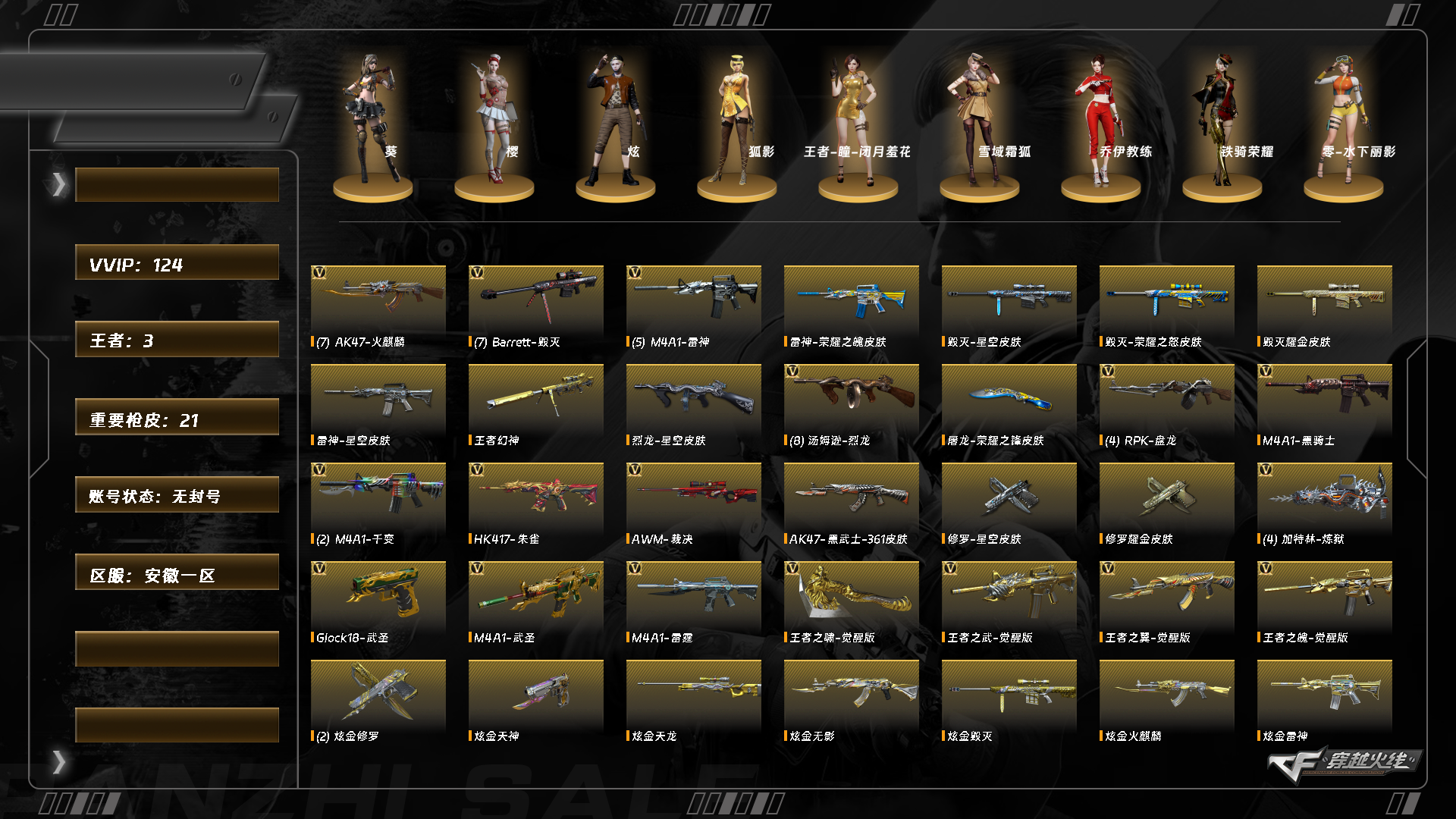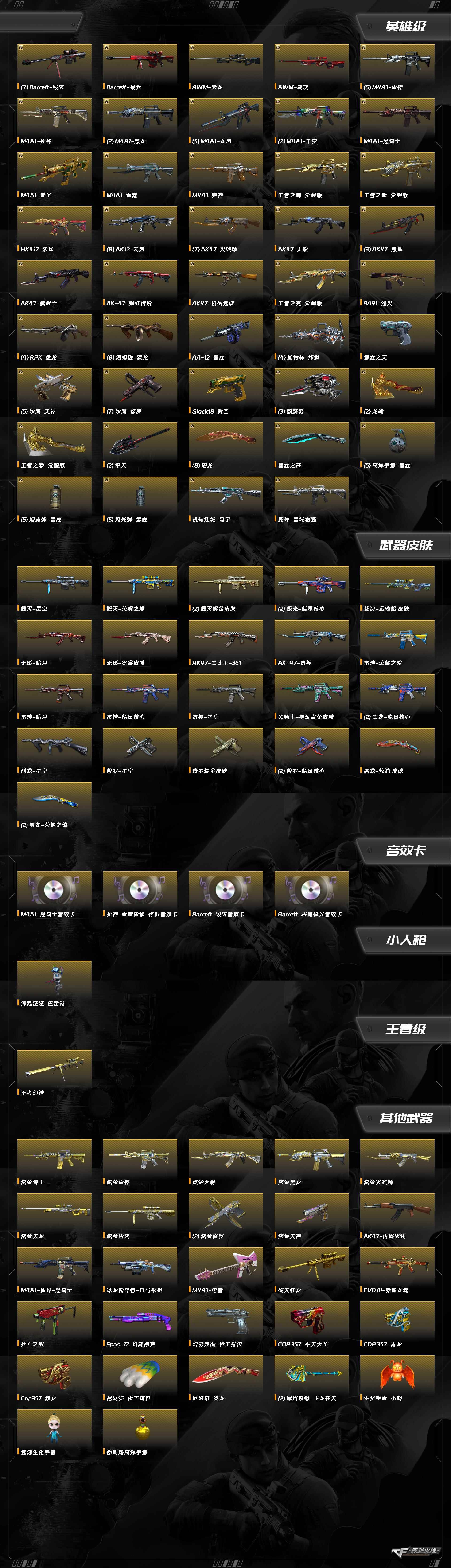 Barrett-极光,擎天,麒麟刺,龙啸,屠龙,沙鹰-天神,沙鹰-修罗,加特林-炼狱,汤姆逊-烈龙,RPK-盘龙,9A91-烈火,HK417-朱雀,AK12-天启,AA-12-雷霆,AWM-裁决,AWM-天龙,AK47-无影,Barrett-毁灭,M4A1-猎神,M4A1-千变,M4A1-武圣,M4A1-龙血,M4A1-黑龙,M4A1-雷霆,M4A1-死神,M4A1-黑骑士,M4A1-雷神,AK-47-猩红传说,AK47-机械迷城,AK47-黑武士,AK47-黑鲨,AK47-火麒麟