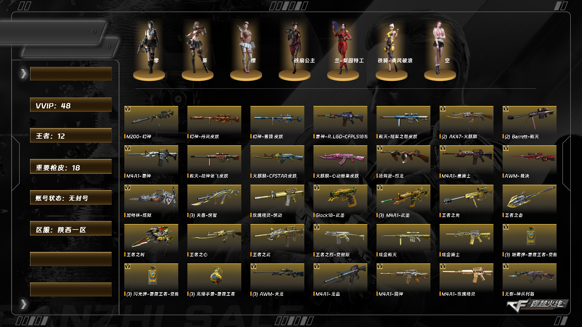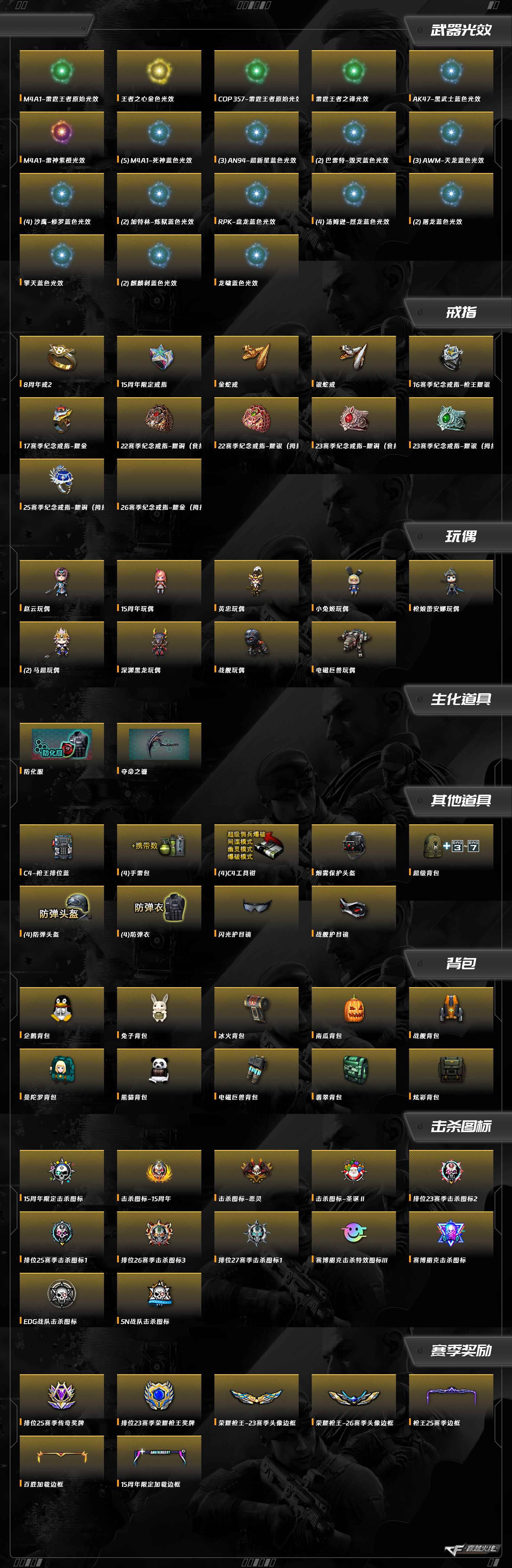 AWM-天龙,擎天,麒麟刺,龙啸,屠龙,沙鹰-天神,沙鹰-修罗,加特林-炼狱,汤姆逊-烈龙,AN94-超新星,AWM-裁决,M200-幻神,Barrett-毁灭,M4A1-玫瑰精灵,M4A1-猎神,M4A1-武圣,M4A1-龙血,M4A1-黑骑士,M4A1-雷神,AK47-黑鲨,AK47-火麒麟,修罗-云海游龙