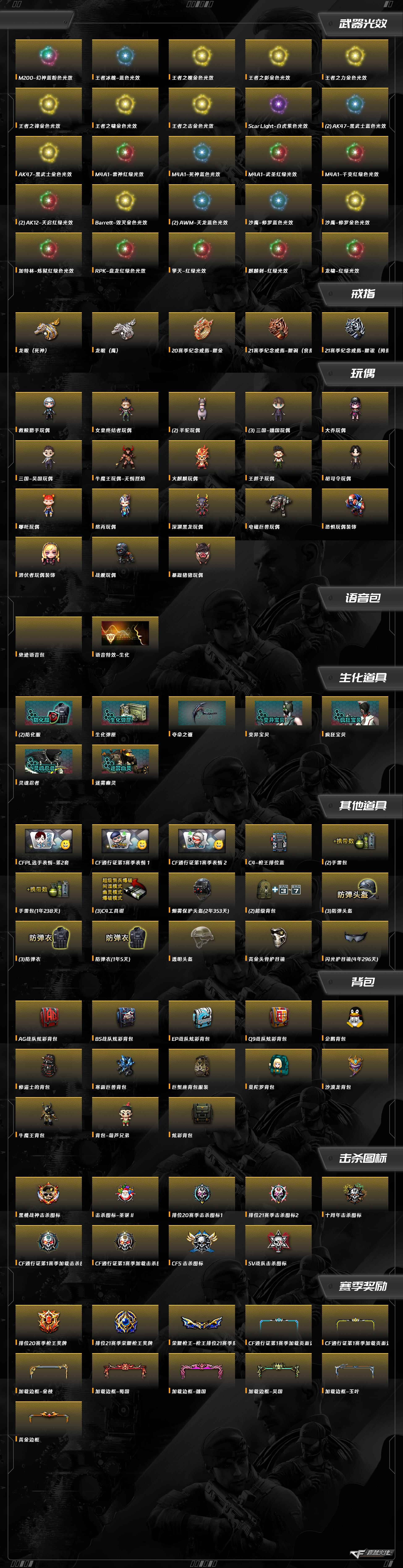 加特林-炼狱,Barrett-朱雀,Barrett-暗月传说,AWM-天龙,AWM-裁决,AA-12-雷霆,HK417-朱雀,QBZ03-金色蔷薇,9A91-烈火,RPK-盘龙,汤姆逊-烈龙,Barrett-毁灭,沙鹰-修罗,擎天-竞技荣光,USP-雷暴,柯尔特-竞技荣光,屠龙,龙啸,麒麟刺,擎天,幻灵之锋,AK47-B-常胜将军,传说圣灵,传说梦魇,M200-竞技荣光,Scar Light-白虎,AK47-火麒麟,AK47-黑武士,AK47-B-战士,AK47-机械迷城,AK-47-猩红传说,M200-幻神,M4A1-雷神,M4A1-黑骑士,M4A1-死神,M4A1-黑龙,M4A1-龙血,M4A1-武圣,M4A1-千变,M4A1-青龙,M4A1-猎神