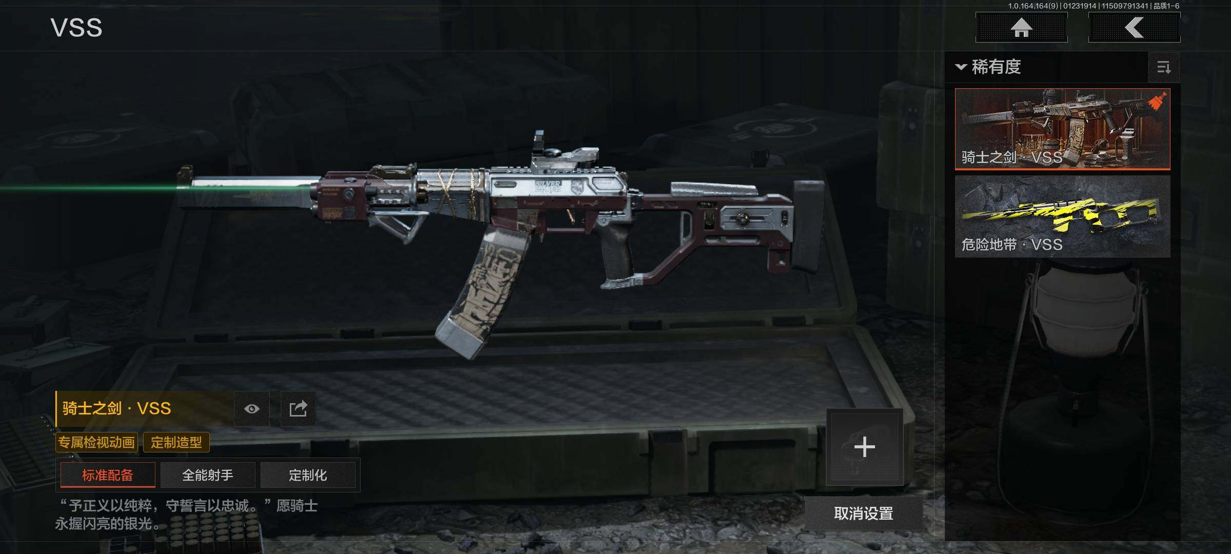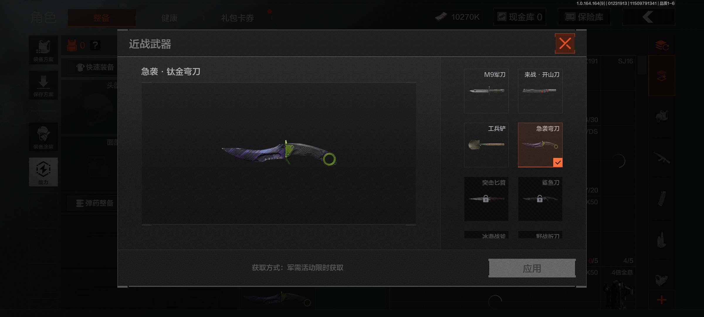 【C262245372】【AQZG1056】等级:30/段位:专家/仓库价值(百万):17/柯恩币:10000000/急袭弯刀/工兵铲/来战·开山刀/钢铁真理QBZ191/骑士之剑AX50/骑士之剑VSS