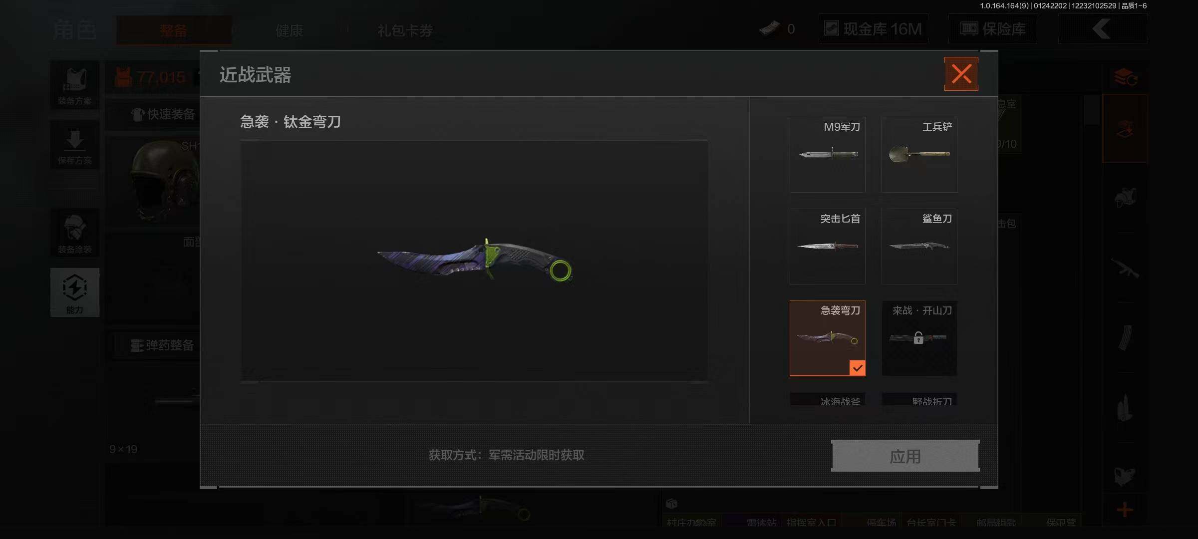 【C262420012】【AQZG1055】等级:30/段位:新锐/仓库价值(百万):46.8/柯恩币:16999420/鲨鱼刀/突击匕首/急袭弯刀/工兵铲