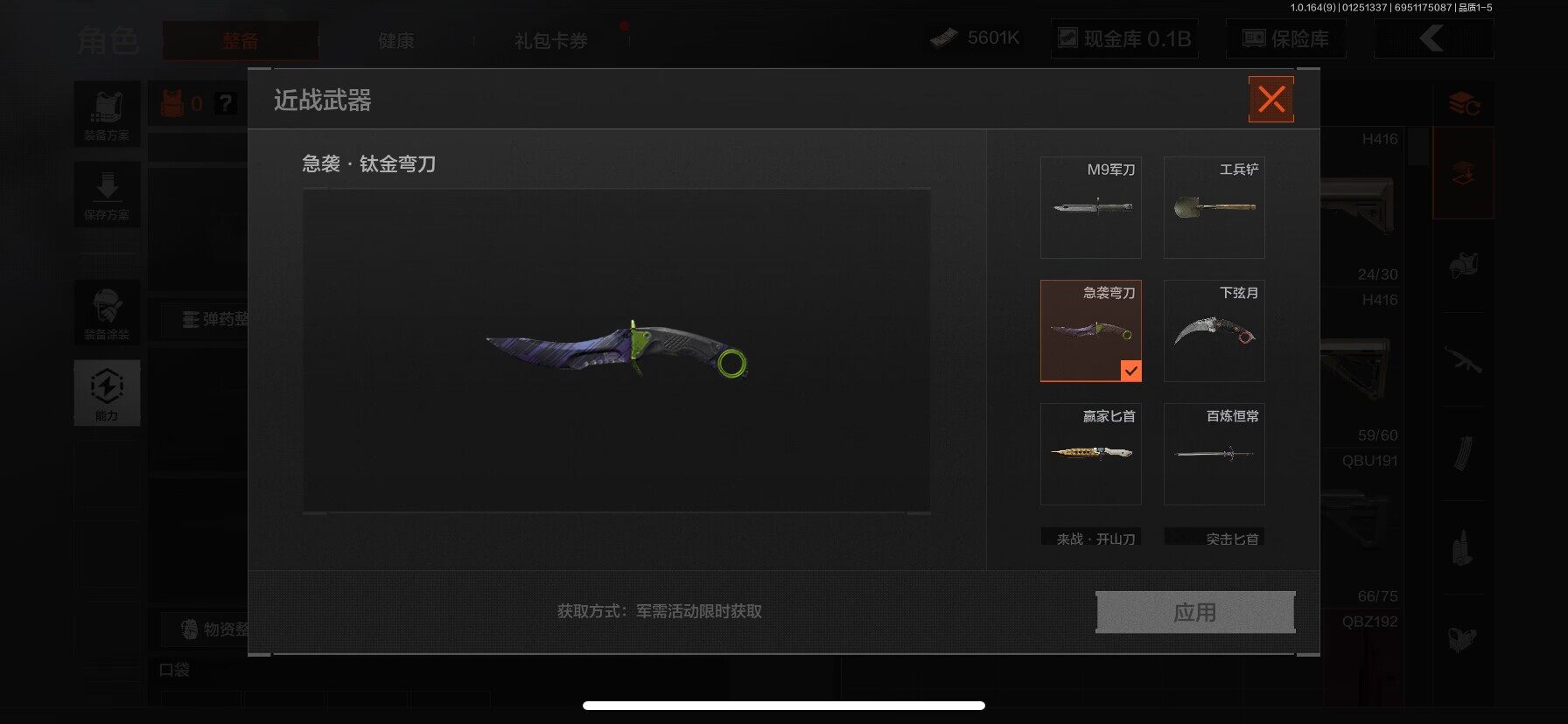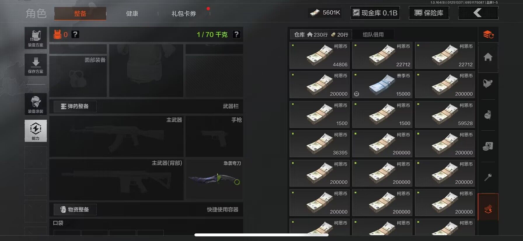 【C262427888】【AQZG1073】等级:30/段位:暗区传说/仓库价值(百万):187.9/柯恩币:100000000/急袭弯刀/赢家匕首/百炼恒常/下弦月/冥河/深潜行者II/使徒欧瑞恩/骑士典范艾尔熙德