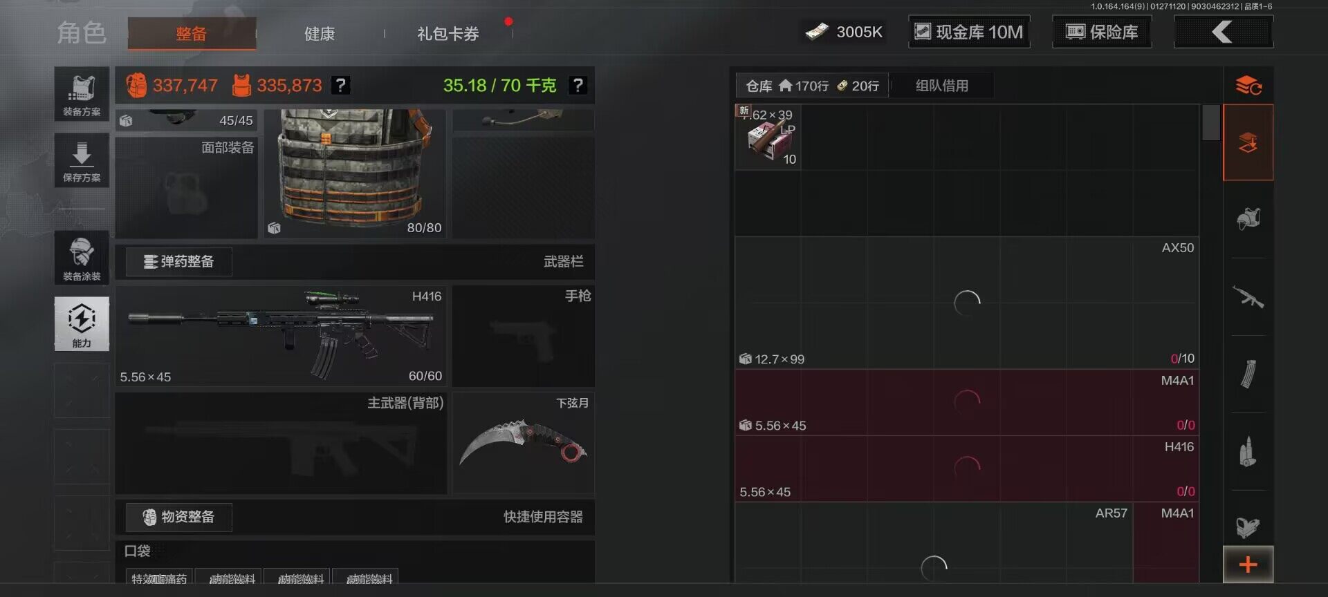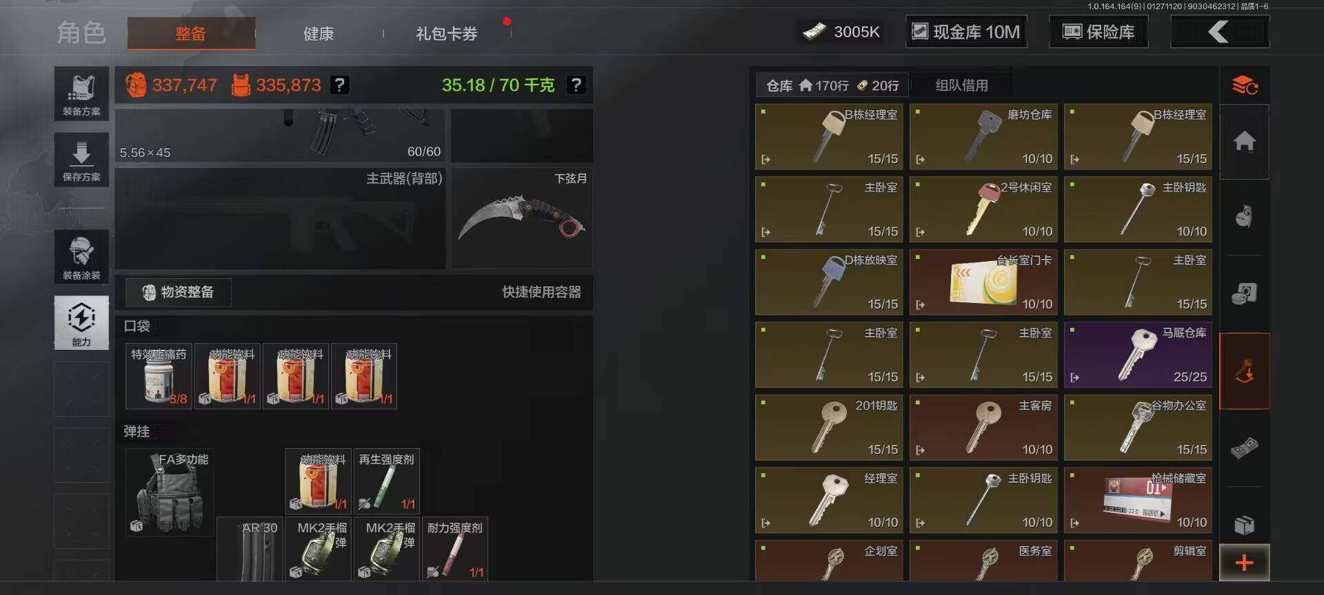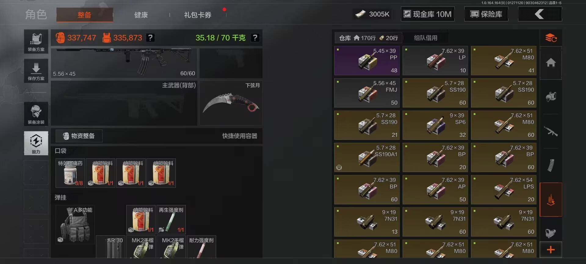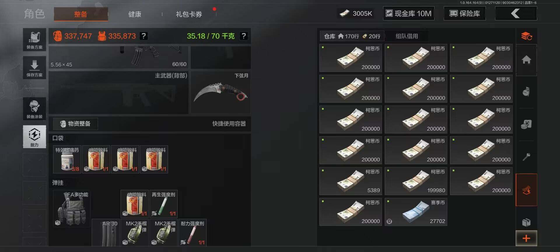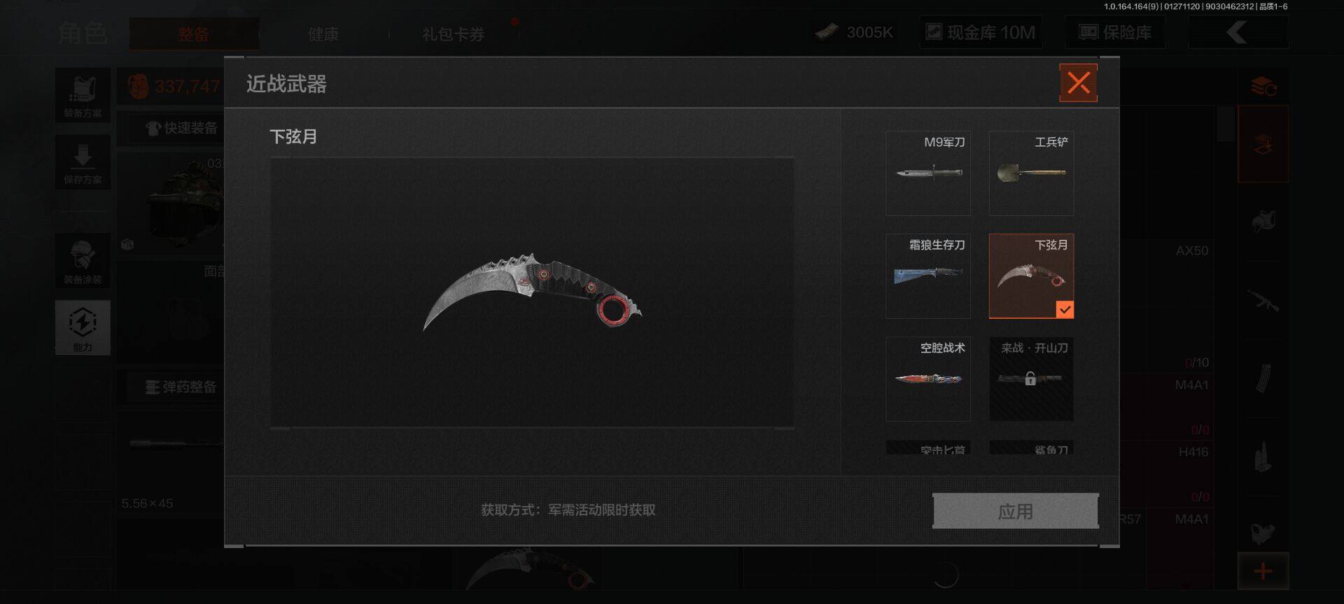 【C262646468】【AQZG1086】等级:30/段位:王牌/仓库价值(百万):33.7/柯恩币:10000000/下弦月/霜狼生存刀/空腔战术/冥河/深潜行者II