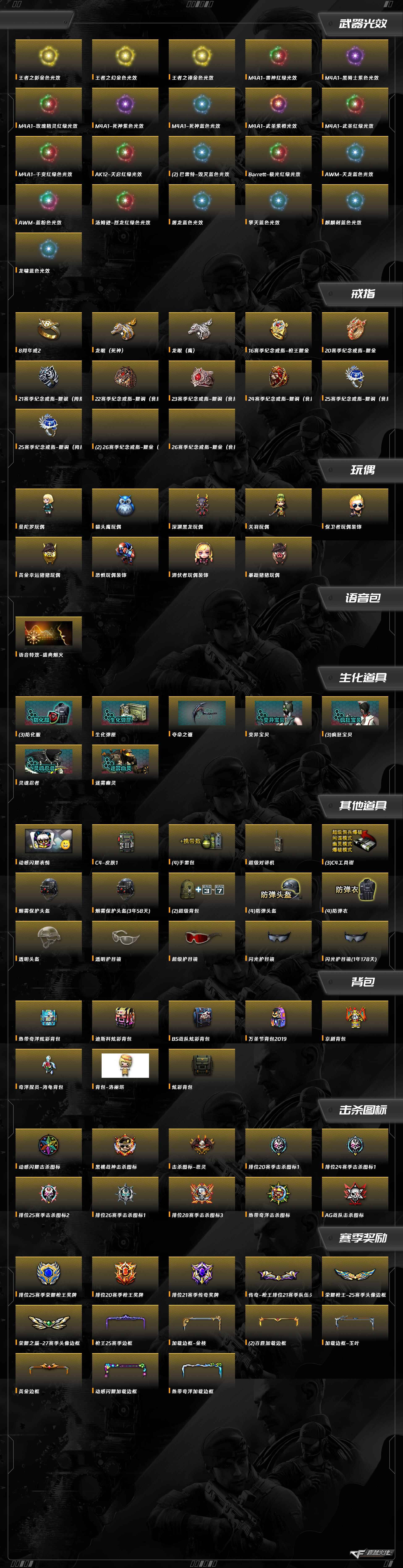 Barrett-极光,斩神刀-雷暴,擎天,麒麟刺,龙啸,屠龙,沙鹰-天神,USP-雷暴,沙鹰-修罗,汤姆逊-烈龙,QBZ03-金色蔷薇,HK417-朱雀,AK12-天启,AWM-天龙,Barrett-暗月传说,M200-幻神,Barrett-毁灭,M4A1-玫瑰精灵,M4A1-猎神,M4A1-武圣,M4A1-死神,M4A1-黑骑士,M4A1-雷神,AK-47-猩红传说,AK47-B-战士,AK47-雷暴,AK47-火麒麟,天神-动感闪耀,屠龙-动感闪耀,烈火-动感闪耀