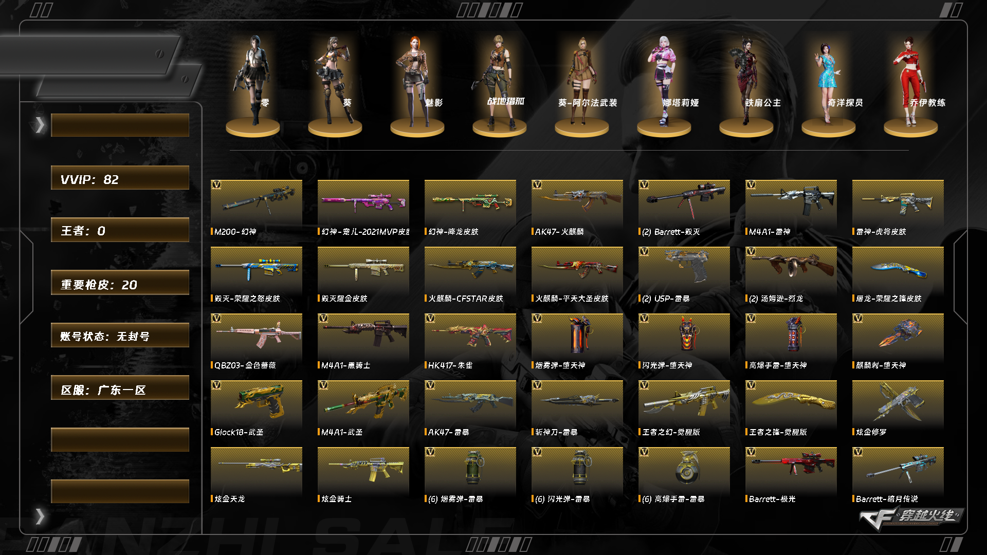 【C262841929】[16178109]TD9882/南部/广东一区/钱包注销/可排位/可二次/81V/掌火ID:218606601/幻神/幻神宠儿/幻神降龙/USP雷暴/雷暴套/朱雀/QBZ金色蔷薇/天龙/毁灭/毁灭音效卡/毁灭荣耀之怒/极光/黑骑士/雷神/火麒麟/死神/天启/6修罗/【小人枪】/天龙乔伊教练/KAC锯式机枪黑桃战神/【角色】/葵/零/魅影/零纪元/战地猎狐/葵阿尔法武装/奇洋探员/乔伊教练/永久AC/细节看图
