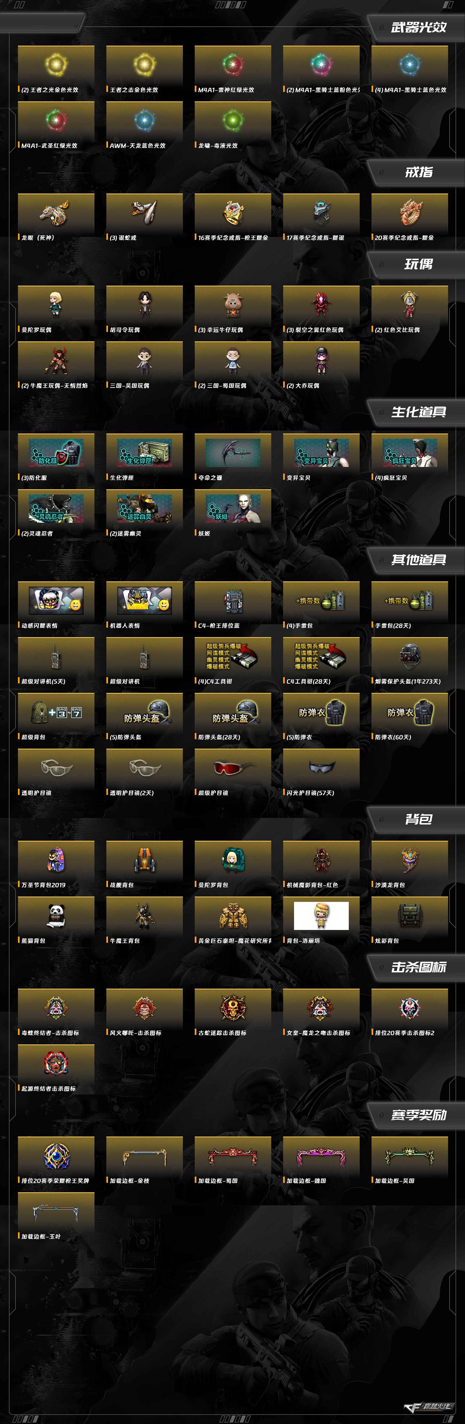 M4A1-千变,擎天,麒麟刺,龙啸,屠龙,沙鹰-天神,沙鹰-修罗,加特林-炼狱,汤姆逊-烈龙,RPK-盘龙,AWM-裁决,AWM-天龙,Barrett-暗月传说,Barrett-极光,Barrett-毁灭,M4A1-猎神,M200-幻神,M4A1-堕天神,M4A1-武圣,M4A1-黑龙,M4A1-死神,黑骑士-海王,M4A1-黑骑士,M4A1-雷神,AK47-B-常胜将军,AK47-B-战神,AK-47-猩红传说,AK47-B-战士,AK47-黑武士,AK47-火麒麟,AK47-无影