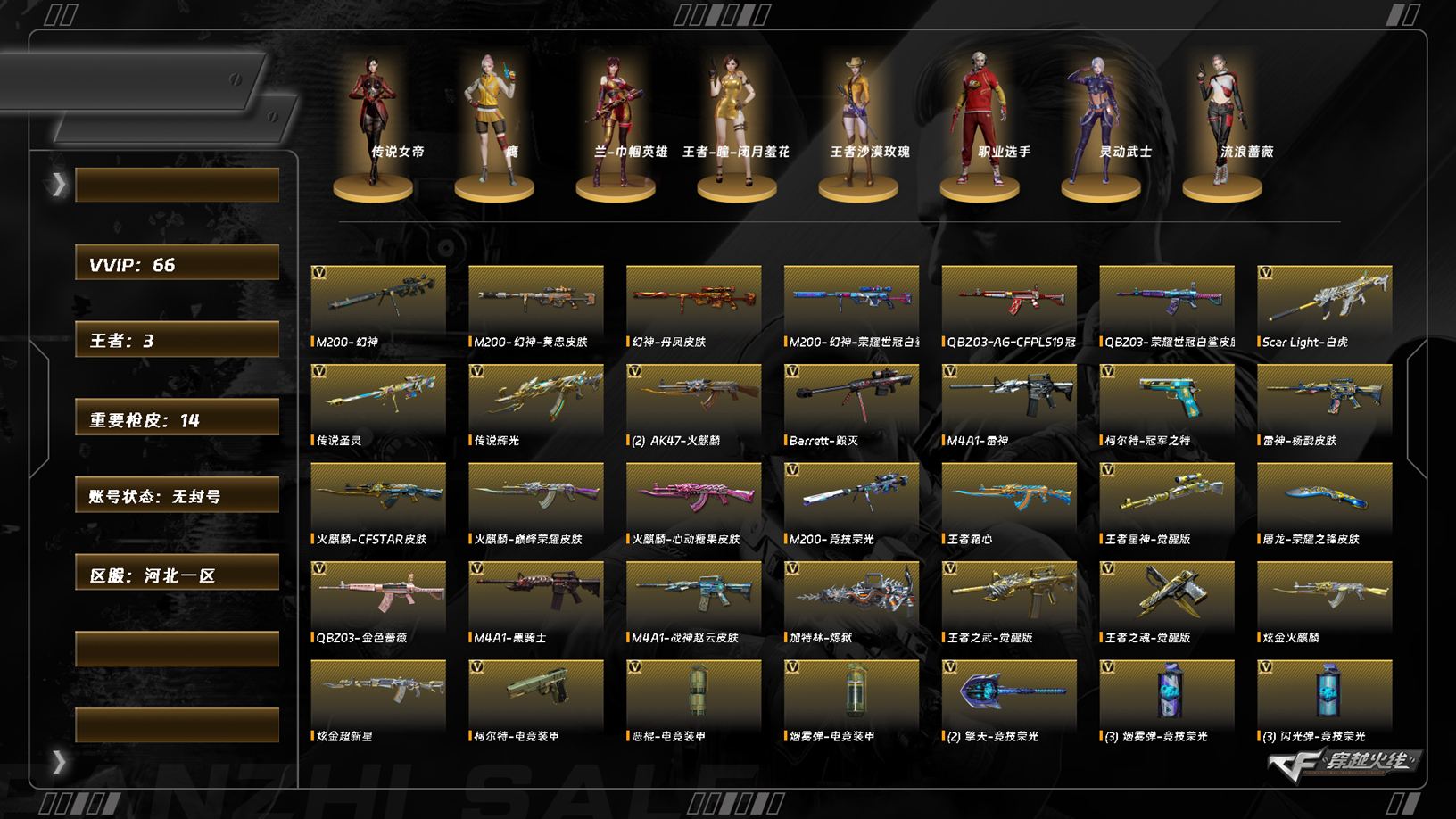 【C263159108】[16289073]LC8156/北部/河北一区/可排位/67v/3传说/【三防传说角色/传说女帝/】/传说辉光/传说圣灵/【幻神三件套/幻神/幻神黄忠/幻神丹凤/幻神荣耀世冠白鲨/幻神音效卡/】/【金色蔷薇套装/QBZ金色蔷薇/QBZAGCFPLS19冠军/QBZ荣耀世冠白鲨/QBZ金色蔷薇音效卡/】/LC200竞技荣光/王者星神/觉醒版/白虎/白虎大汉风骨/白虎电玩蓝兔/玄武/LCA神工天巧/柯尔特电竞装甲/柯尔特冠军之特/炽芒蝶刃/【四防角色/王者沙漠玫瑰/】/【角色】/兰巾帼英雄/鹰/王者瞳闭月羞花/【枪皮】/火麒麟巅峰荣耀/火麒麟心动糖果/雷神杨戬/王者武器/王者霜心/王者之武/王者之魂/炫金武器/炫金火麒麟/炫金超新星/【小人枪/天龙曼陀罗/COP旗袍/】/永久AC/找回包赔