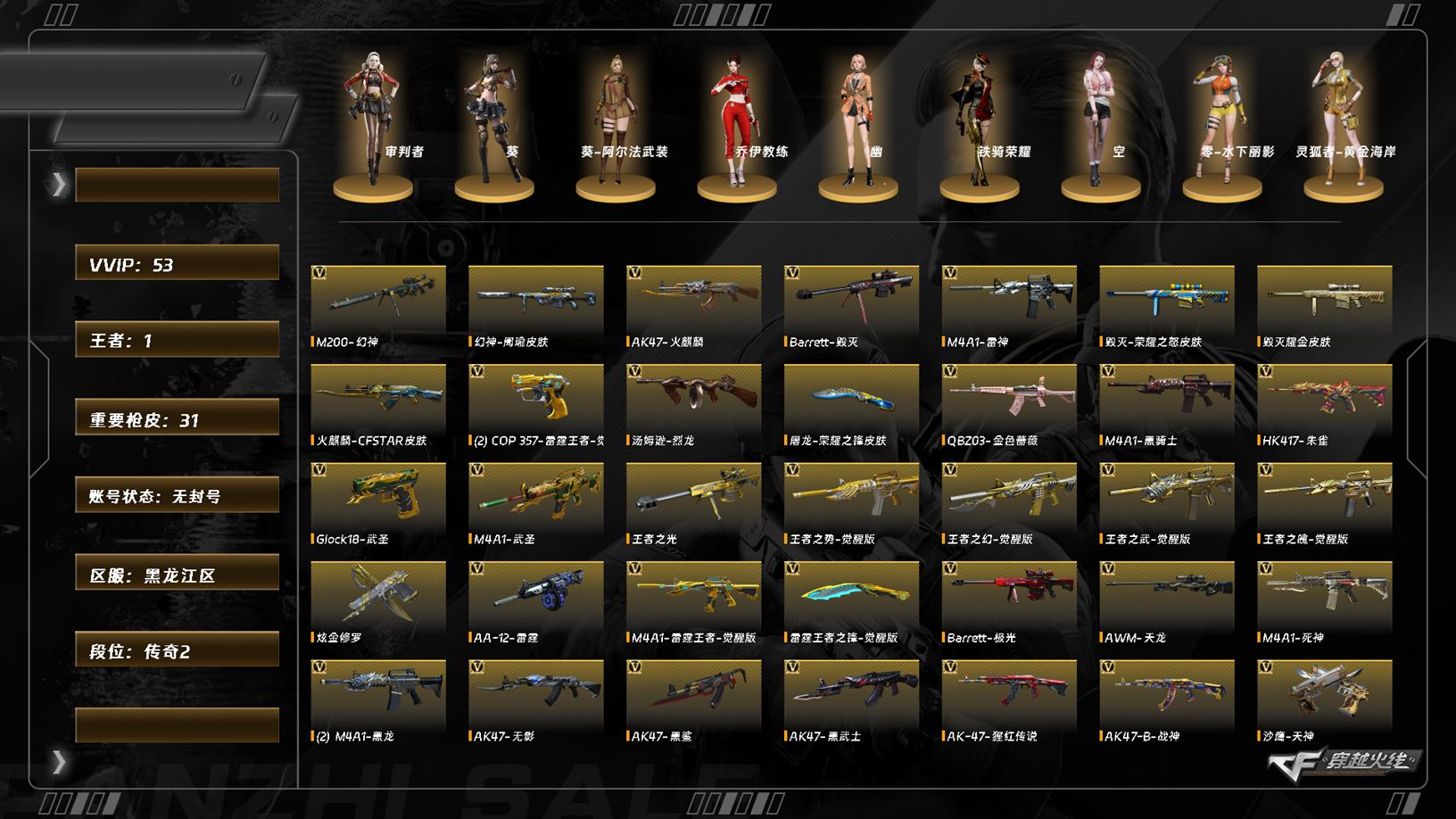 【C263192523】[16289191]LC8162/北部/黑龙江区/可排位/53v/幻神/幻神周瑜/雷霆王者套装/LCA雷霆王者/COP雷霆王者/*2/QBZ金色蔷薇/朱雀/朱雀电竞之星/【角色】/葵/审判者/不败狙神/幻面灵狐/葵阿尔法武装/乔伊教练/【音效卡/黑骑士音效卡/火麒麟音效卡/毁灭音效卡/屠龙电竞之星竞星跃动音效卡/雷神音效卡/朱雀电竞之星竞星跃动音效卡/竞魂超新星音效/极光音效卡/炼狱百战金芒庆典舞曲音效卡/】/【枪皮】/黑骑士白马银枪/黑骑士破浪10年/火麒麟雷神/黑骑士电玩青兔/雷神白鲨CFPLS14冠军/裁决胜者为王/王者武器/王者之幻/王者之魄/王者之势/王者之武/王者之光/炫金武器/炫金修罗/【小人枪/水枪不败狙神/LC37葵/】/永久AC/有过十年记录/找回包赔