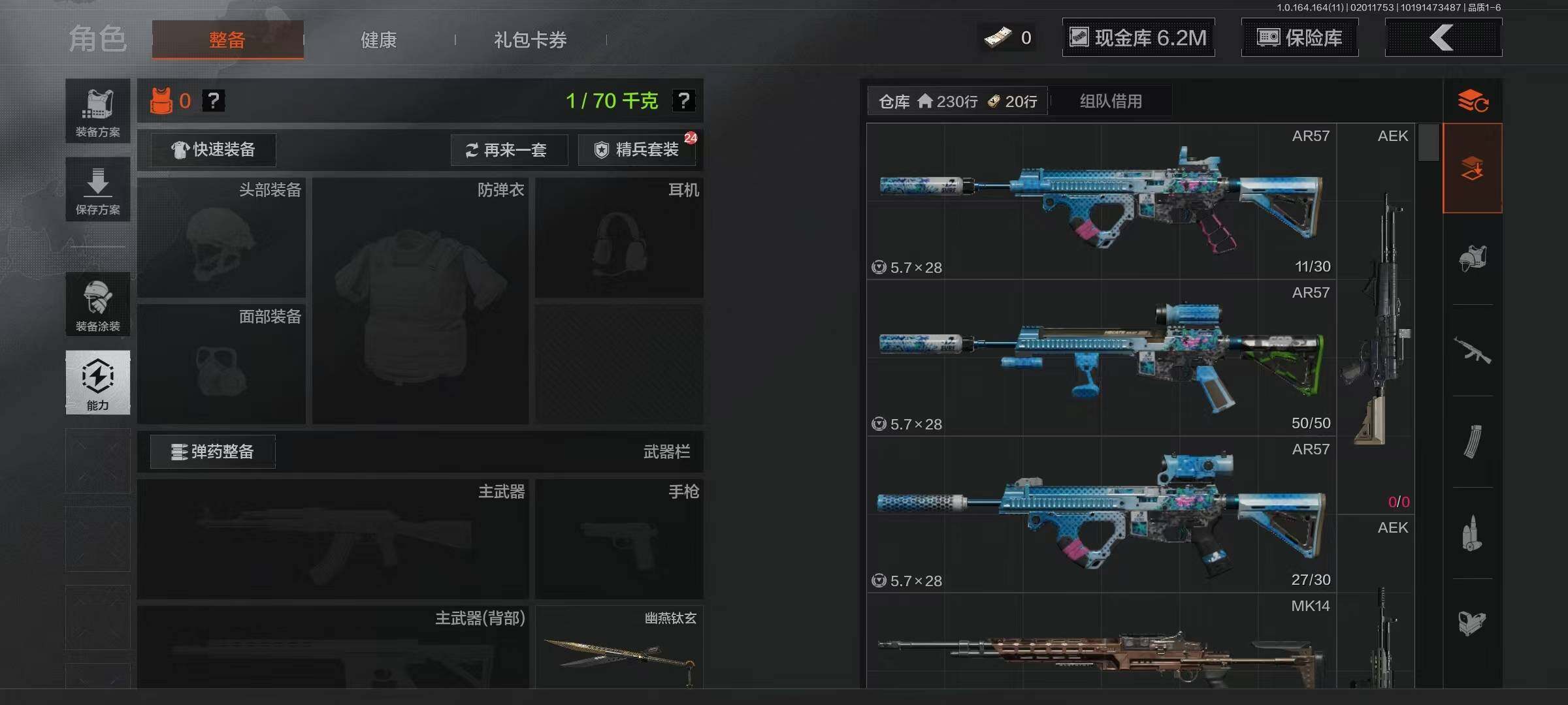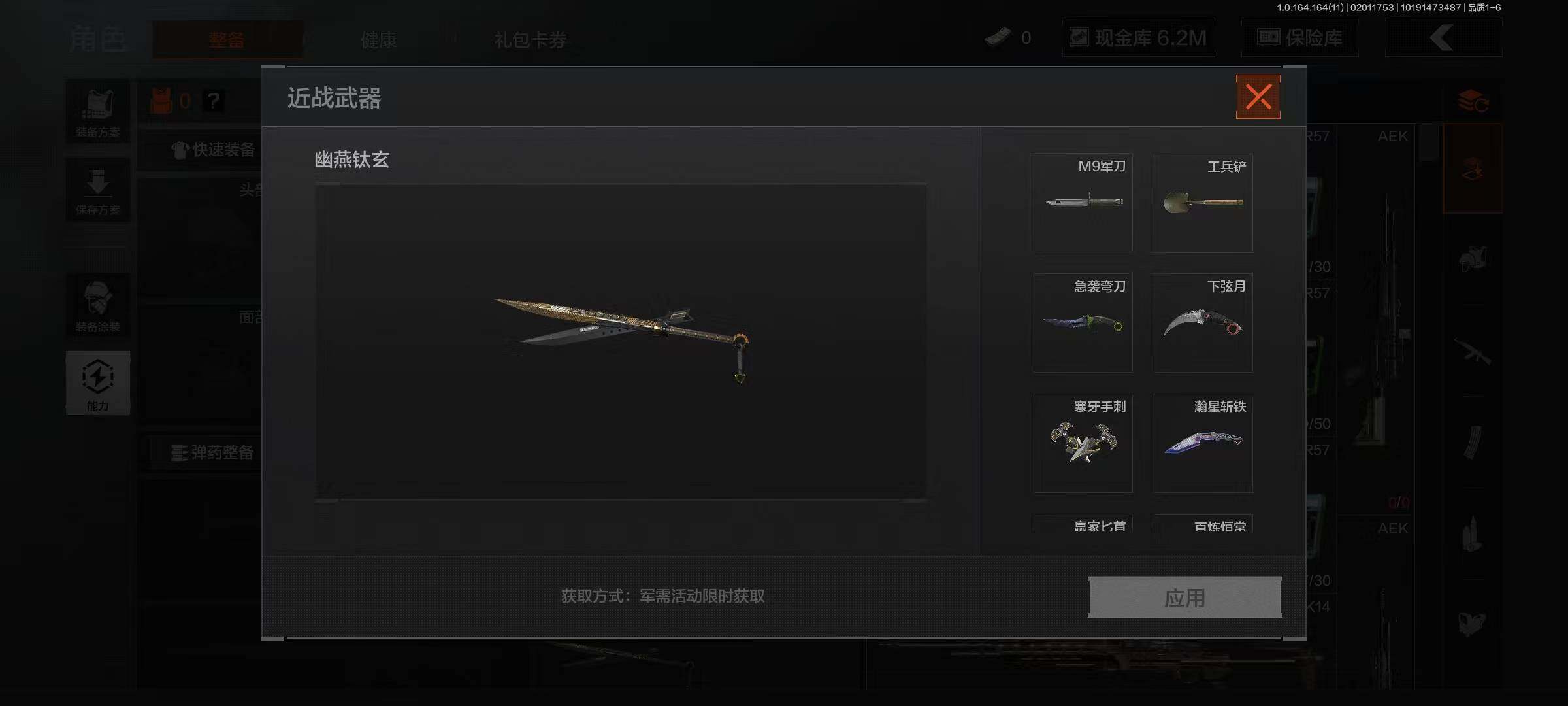 【C263130874】【AQZG1137】等级:30/段位:王牌/仓库价值(百万):78.4/柯恩币:6222871/幽燕钛玄/百炼恒常/赢家匕首/瀚星斩铁/寒牙手刺/下弦月/急袭弯刀/工兵铲/白蔷薇斯黛拉/黑卡蒂/冥河/危崖魅影作战服/深潜行者II/竞技FAL/告丧夜曲AR57/旗帜AEK/玉擎天工AN94/玉擎天工MP5/骑士之剑VSS/棱光裂变QBU191/骑士之剑AX50/近卫荣誉RPK16/清影