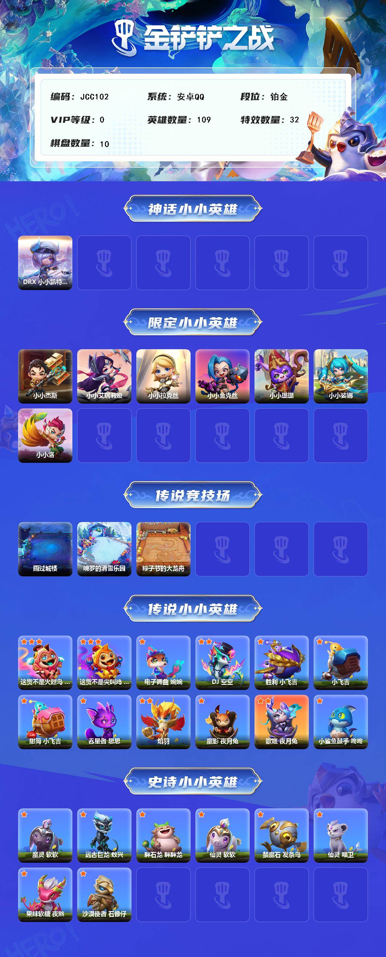 【C263255479】【JCC102】1神话/109小小英雄/10棋盘/DRX 小小凯特琳/小小杰斯/小小艾瑞莉娅/小小拉克丝/小小金克丝/小小璐璐/小小娑娜/小小洛/雨过城楼/魄罗的滑雪乐园/粽子节的大龙舟/这货不是火烈鸟 咚咚/这货不是尖叫鸡 咚咚/电子舞曲 婉婉/DJ 空空/胜利 小飞吉/小飞吉/甜筒 小飞吉/吞星者 思思/焰羽/魔影 夜月兔/歌姬 夜月兔/小鲨鱼鼓手 咚咚/魔灵 软软/远古巨龙 敖兴/胖石龙 胖胖龙/仙灵 软软/禁魔石 发条鸟/仙灵 喵卫/果味软糖 夜煞/沙漠使者 石像仔