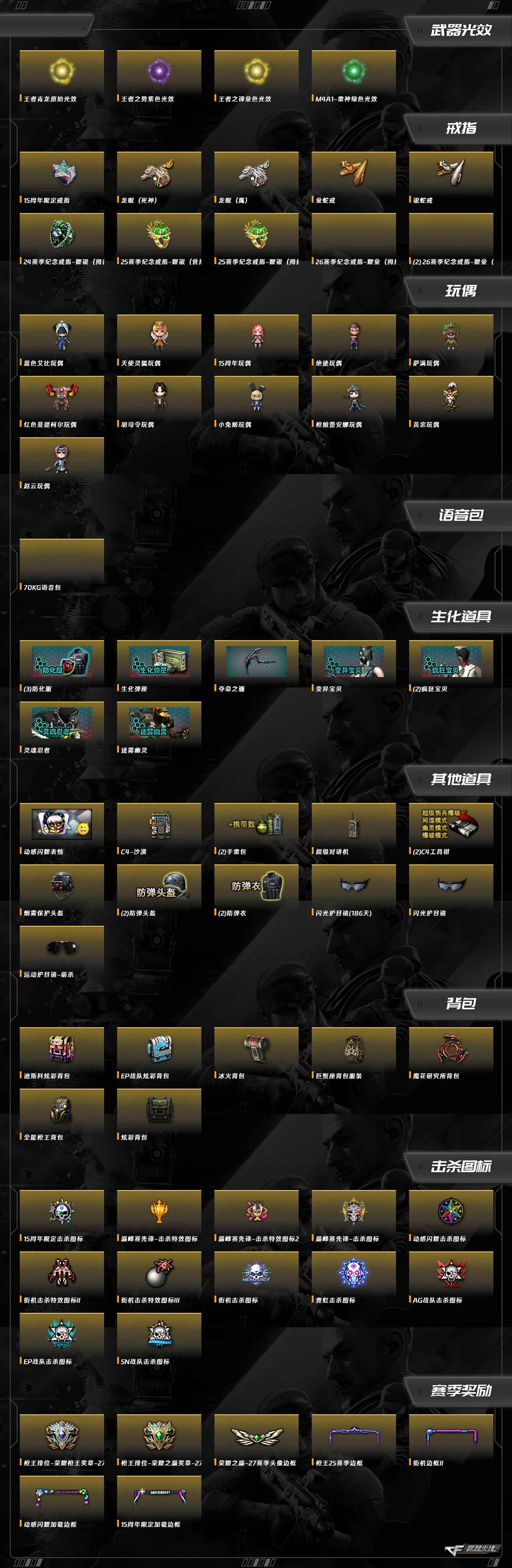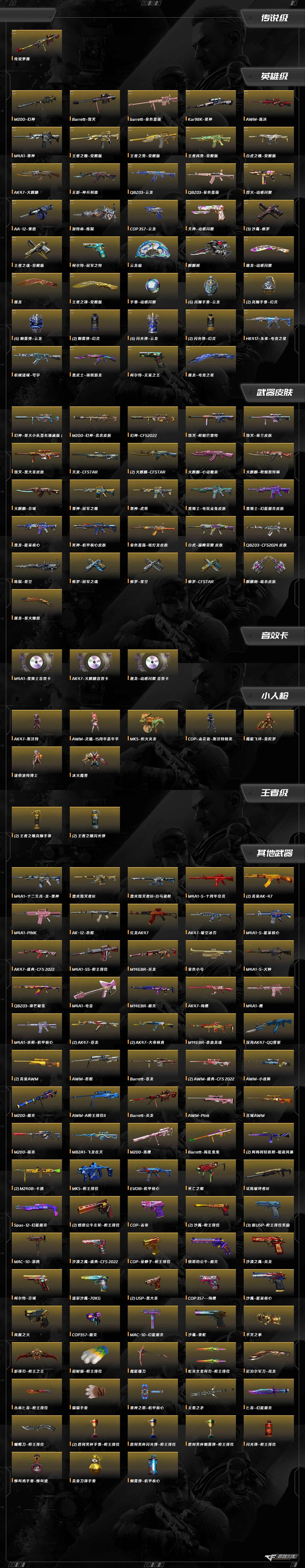 M4A1-雷神,麒麟刺,屠龙,沙鹰-修罗,加特林-炼狱,QBZ03-金色蔷薇,AA-12-雷霆,AWM-裁决,Barrett-毁灭,M200-幻神,AK47-火麒麟,Kar98k-星神,传说梦魇,天神-动感闪耀,屠龙-动感闪耀,烈火-动感闪耀,柯尔特-冠军之特