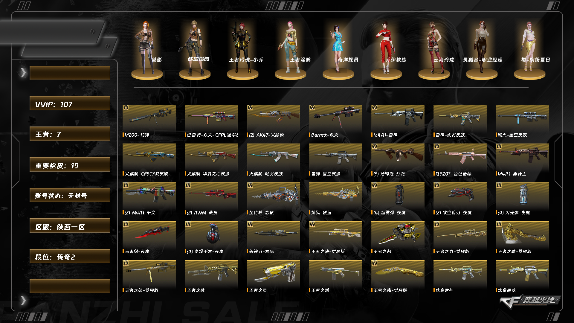 【C263618088】[16473084]XH5242/西部/陕西一区/可排位【一万点卷】【传奇2】【Lv.100 大元帅】/107V/幻神/幻神音效卡/QBZ金色蔷薇/黑骑士/雷神/裁决/火麒麟/6烈龙/6修罗/炼狱/*2/斯泰尔蝴蝶【音效卡】/雷神音效卡/黑骑士音效卡/火麒麟音效卡/毁灭音效卡/极光音效卡/【枪皮】毁灭英雄计划/毁灭星空/火麒麟AG/火麒麟华夏之心/火麒麟轻羽/雷神虎将/雷神星空/黑龙能量核心/【角色】/魅影/战地猎狐/王者玲珑小乔/王者涂鸦/奇洋探员/云海玲珑/灵狐者职业经理/灵狐者黄金海岸/【玩偶武器】/雷神精英刀锋/火麒麟绝迹/朱雀蛇隐综/C.A.T/【道具】//超级背包/各种戒指/各种光效/各种玩偶/永久AC/永久雷包/细节看图/【此账号封过十年已解】/