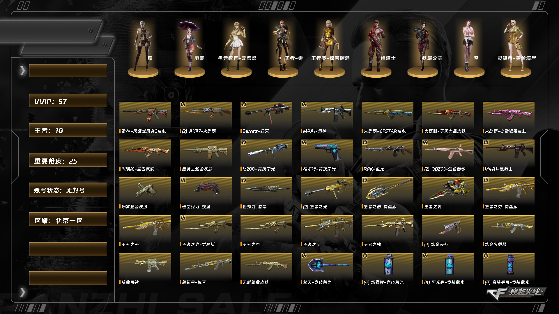 【C263605919】[16473498]XH5249/北部/北京一区/可排位【钱包已递交强制】【Lv.96 上将3】/57V/M200竞技荣光套/QBZ金色蔷薇/*2/朱雀电竞之星/无影神兵利器/黑骑士海王/雷神/黑骑士/AK无影/AK黑武士/AK黑鲨/修罗/*2/柯尔特竞技荣光/4套竞技荣光雷/【挑战】毁灭征服者超越6/乱世超越4/【音效卡】火麒麟音效卡/【枪皮】毁灭暗月/毁灭风暴/极光能量核心/天龙秘银/火麒麟AG/火麒麟平天大圣/火麒麟心动糖果/火麒麟盘古/雷神荣耀世冠AG/雷神白鲨/【四防】电竞教官云悠悠/王者葵惊若翩鸿/【角色】瞳/雨堂/修道士/空/灵狐者黄金海岸/【道具】//护目镜/各种戒指/各种光效/各种玩偶/永久AC/永久雷包/细节看图/【此账号未被封过十年】