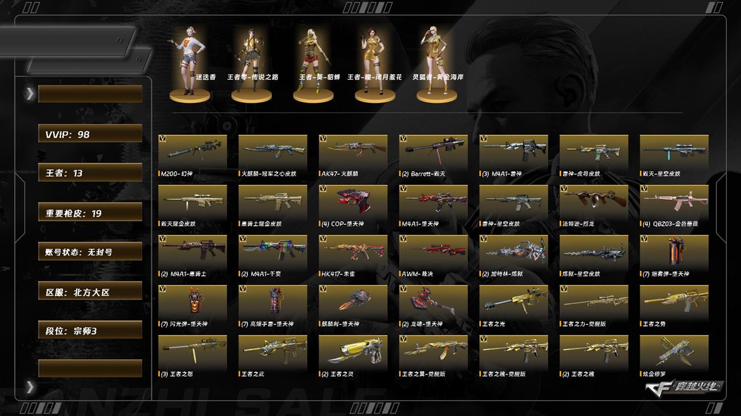 【C264544156】[16857619]LC8086/北部/北方大区/可排位/96v/幻神/QBZ金色蔷薇/*4/朱雀/朱雀电竞之星/堕天神套装/COP堕天神/*4/【四防角色/王者葵貂蝉/】/【角色】/迷迭香/幻面灵狐/王者瞳闭月羞花/【音效卡/屠龙电竞之星竞星跃动音效卡/毁灭音效卡/朱雀电竞之星竞星跃动音效卡/柯尔特电竞之星竞星跃动音效卡/黑骑士音效卡/】/【枪皮】/雷神白鲨CFPLS14冠军/雷神星空/毁灭音效卡/王者武器/王者之翼/王者之魄/王者之势/王者之武/王者之光/王者之力/王者之怒/王者之灵/炫金武器/炫金无影/炫金雷神/炫金千变/炫金毁灭/炫金修罗/【小人枪/火麒麟灵狐/巴雷特零水下丽影/*3/CAT猫锋/】/永久AC/有过十年记录/找回包赔