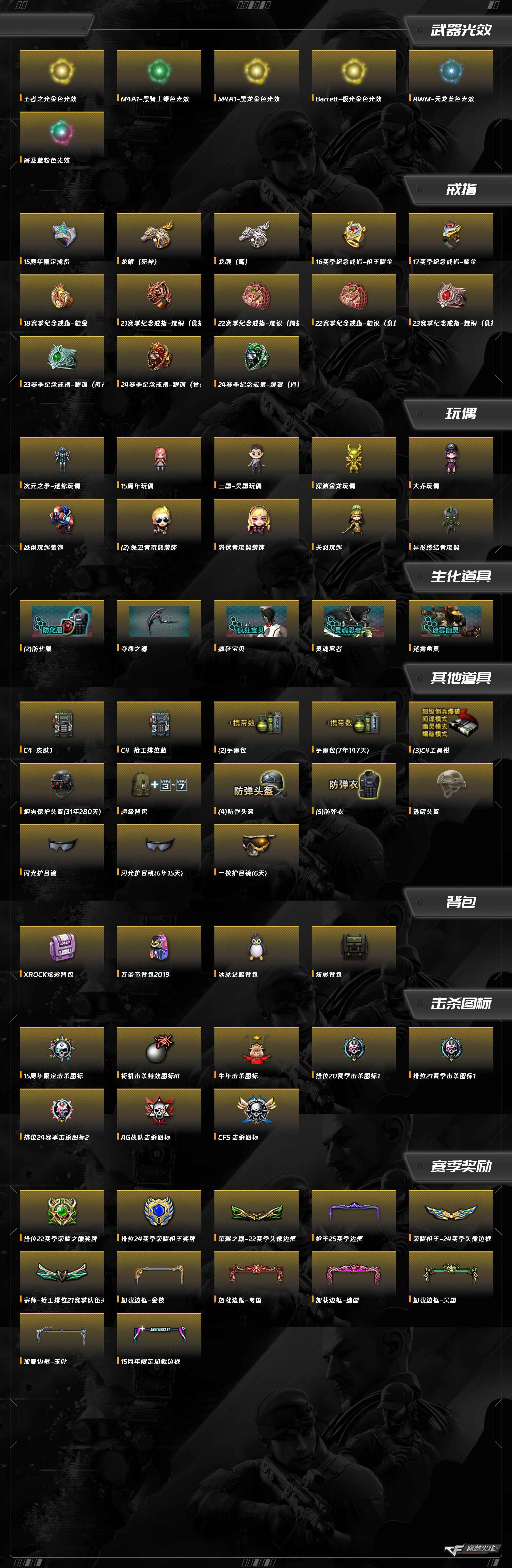Barrett-毁灭,擎天,屠龙,沙鹰-天神,沙鹰-修罗,加特林-炼狱,汤姆逊-烈龙,RPK-盘龙,9A91-烈火,QBZ03-金色蔷薇,HK417-朱雀,AA-12-雷霆,AWM-裁决,AWM-天龙,Barrett-极光,M200-幻神,M4A1-青龙,M4A1-龙血,M4A1-黑龙,黑骑士-海王,M4A1-黑骑士,M4A1-雷神,AK47-B-常胜将军,AK47-B-战神,AK-47-猩红传说,AK47-B-战士,AK47-黑武士,AK47-黑鲨,AK47-火麒麟,传说圣灵