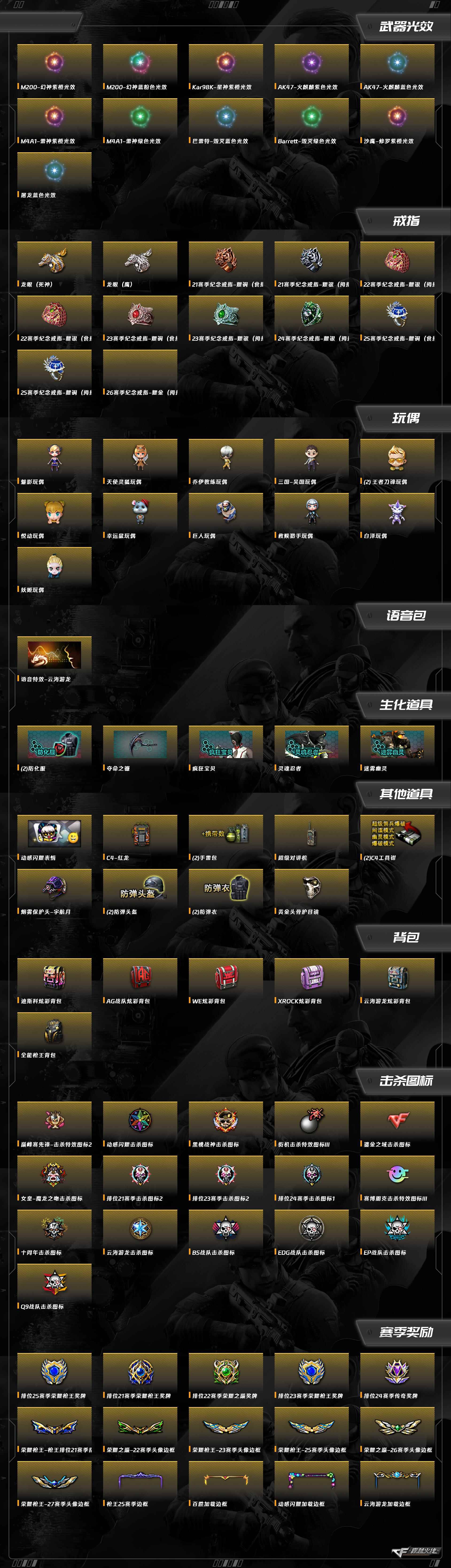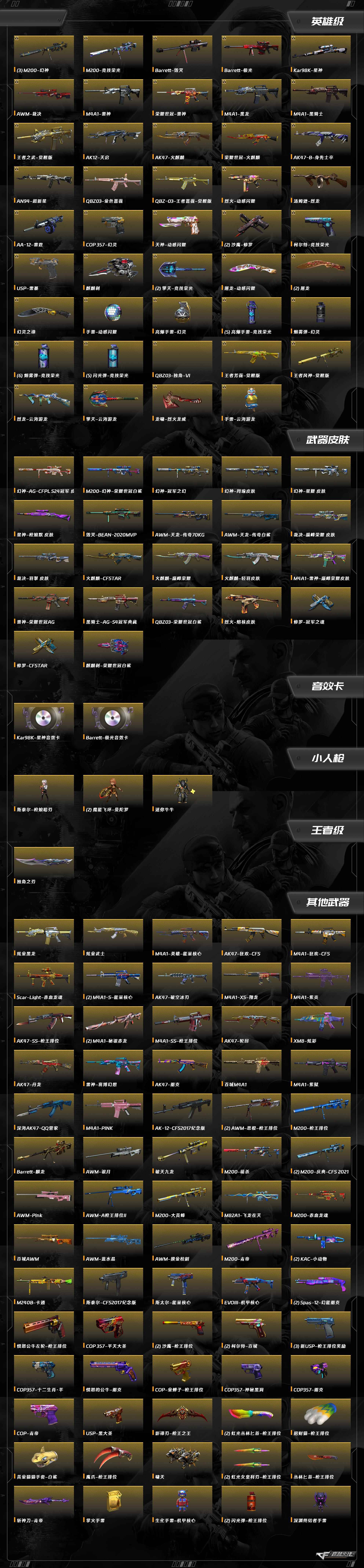 Barrett-毁灭,幻灵之锋,麒麟刺,屠龙,柯尔特-竞技荣光,USP-雷暴,擎天-竞技荣光,沙鹰-修罗,汤姆逊-烈龙,QBZ03-金色蔷薇,AN94-超新星,AK12-天启,AA-12-雷霆,AWM-裁决,Barrett-极光,擎天-云海游龙,M4A1-黑龙,M4A1-黑骑士,M4A1-雷神,AK47-火麒麟,火麒麟-荣耀世冠,雷神-荣耀世冠,Kar98k-星神,M200-竞技荣光,龙啸-烈火龙威,天神-动感闪耀,屠龙-动感闪耀,烈火-动感闪耀,M200-幻神
