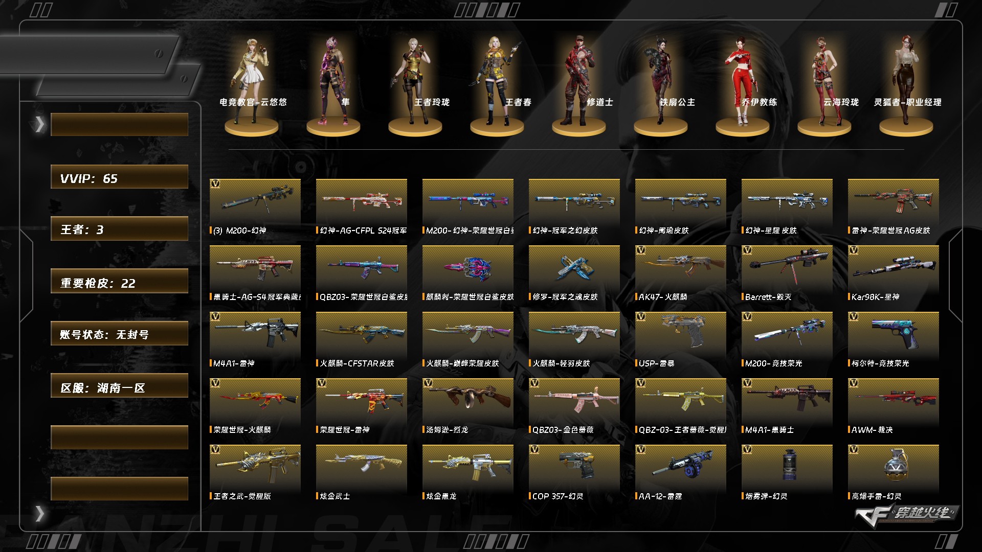 【C265385581】[17065670]XH5611/南部/湖南一区/可排位/【Lv.100 元帅】/VIP6/61V/幻神/*3/幻神冠军之幻/幻神荣耀世冠白鲨/幻神周瑜/幻神星耀/幻神AGCFPLS24/【星神三件套】/星神/星神音效卡/星神枪娘默/王者风神/M200竞技荣光套/QBZ金色蔷薇/QBZ荣耀世冠白鲨/QBZ王者蔷薇/王者芳薇/QBZ独角VI/AN94超新星/COP幻灵/柯尔特竞技荣光/USP雷暴/独角之刃/五套竞技荣光雷/【音效卡】/极光音效卡/【枪皮】/天龙传奇白鲨/火麒麟巅峰荣耀/火麒麟轻羽/雷神巅峰荣耀/雷神荣耀世冠AG/黑骑士AGS4冠军典藏/【四防角色】/电竞教官云悠悠/隼/王者春/【角色】/王者玲珑/修道士/云海玲珑/灵狐者职业经理/乔伊教练/【小人枪】/斯泰尔枪娘暗刃/魔能飞环曼陀罗/【道具】/永久烟雾头/护目镜/各种戒指/各种光效/各种玩偶/永久AC/永久雷包/细节看图/【此账号未被封过十年】