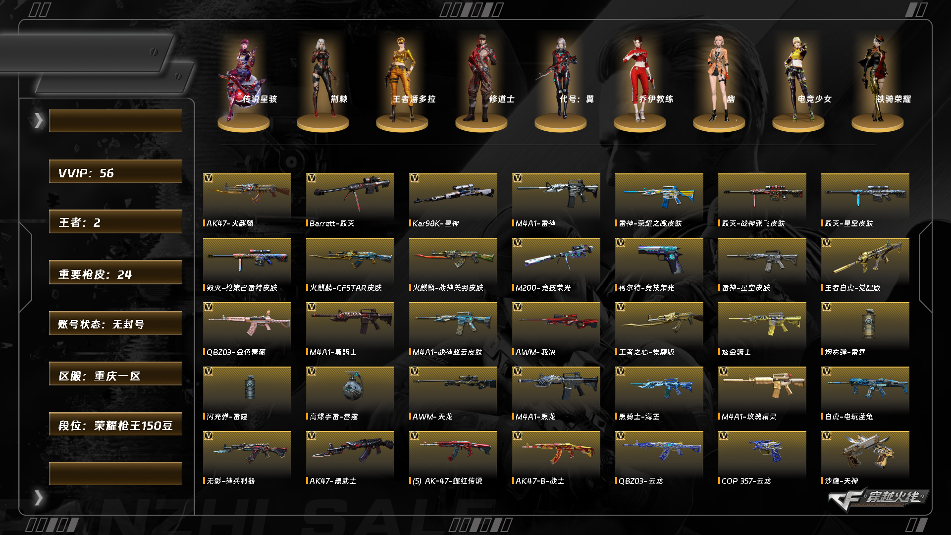 【C265398028】[17065756]XH5614/西部/重庆一区/可排位/【荣耀枪王150豆】/【Lv.102 荣耀元帅】/VIP6/54V/【四防传说】/传说星骇/星神/M200竞技荣光/QBZ金色蔷薇/QBZ云龙套/金色蔷薇古蛇迷踪/白虎电玩蓝兔/王者白虎/【裁决三件套】/裁决/裁决音效卡/裁决运输船/裁决叶芒苍灵/柯尔特竞技荣光/COP云龙/USP冥王/修罗/*3//炽芒蝶刃/【音效卡】/黑骑士音效卡/火麒麟音效卡/Barrett碧霄极光音效卡【枪皮】/毁灭战神张飞/毁灭星空/天龙传奇白鲨/火麒麟战神关羽/雷神宇航兔/雷神星空/M4A1战神赵云/【四防角色】/王者潘多拉/【角色】/荆棘/修道士/代号翼/幽/铁骑荣耀/电竞少女/【小人枪】/火麒麟零纪元/火麒麟灵狐/【道具】/永久烟雾头/护目镜/超级背包/各种戒指/各种光效/各种玩偶/永久AC/永久雷包/细节看图/【此账号未被封过十年】