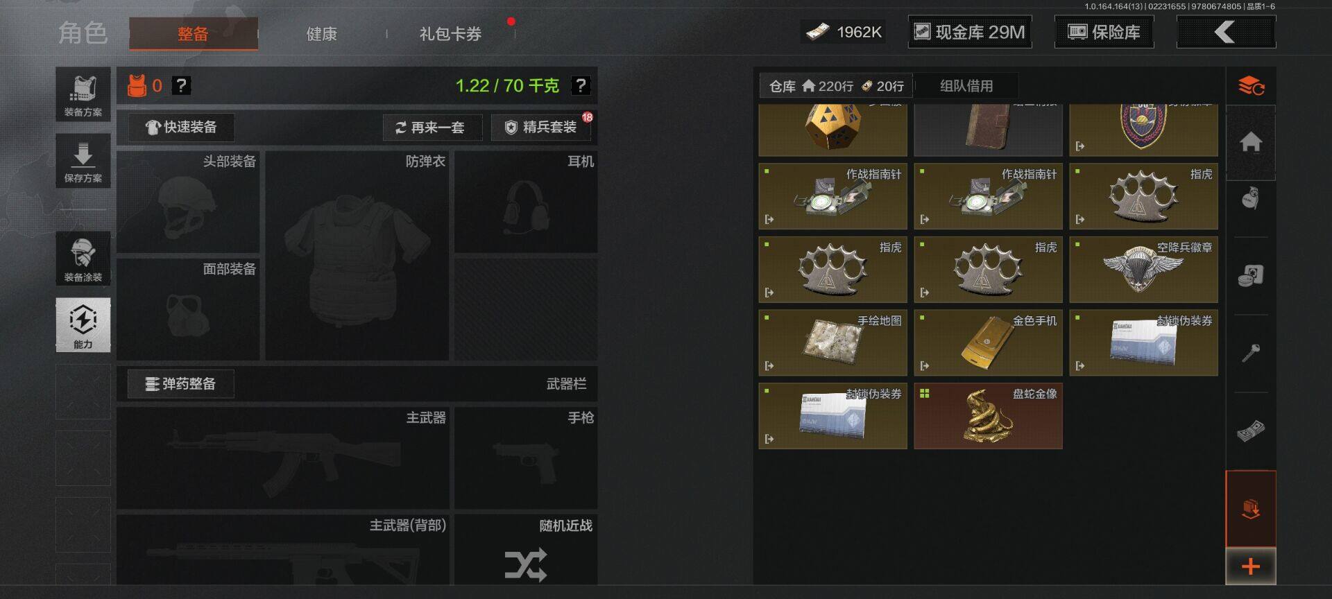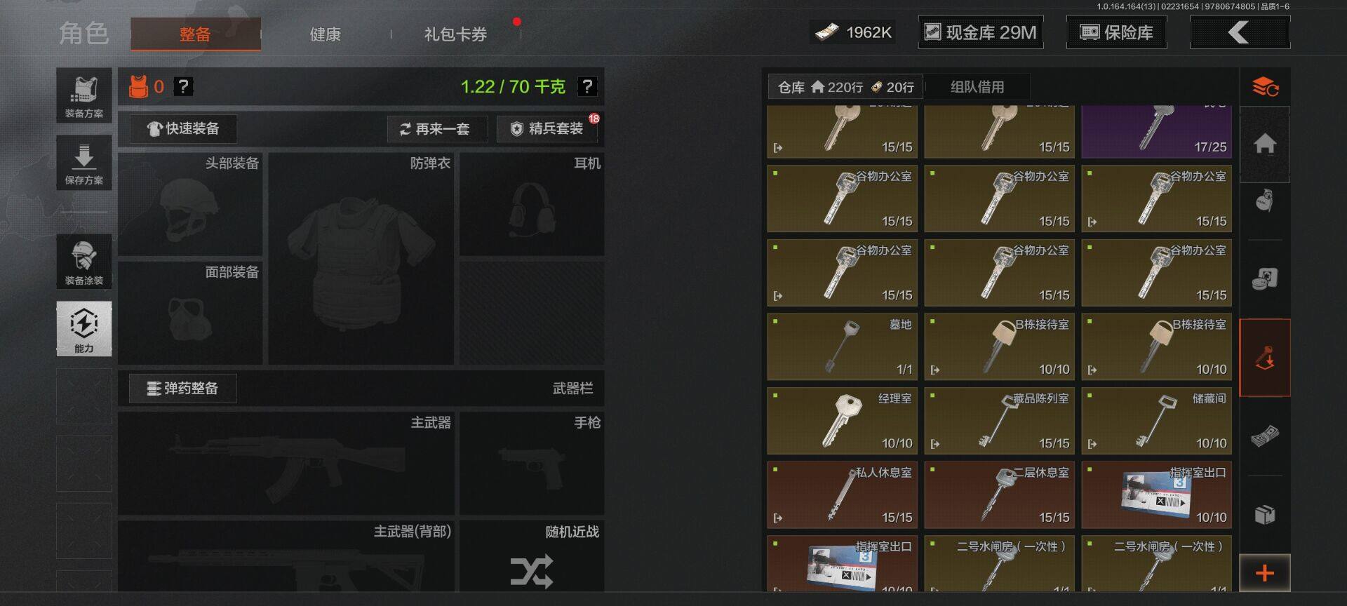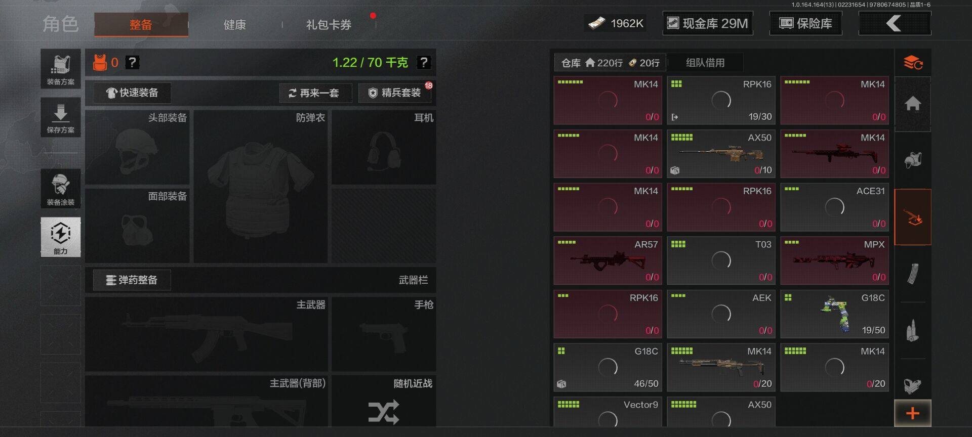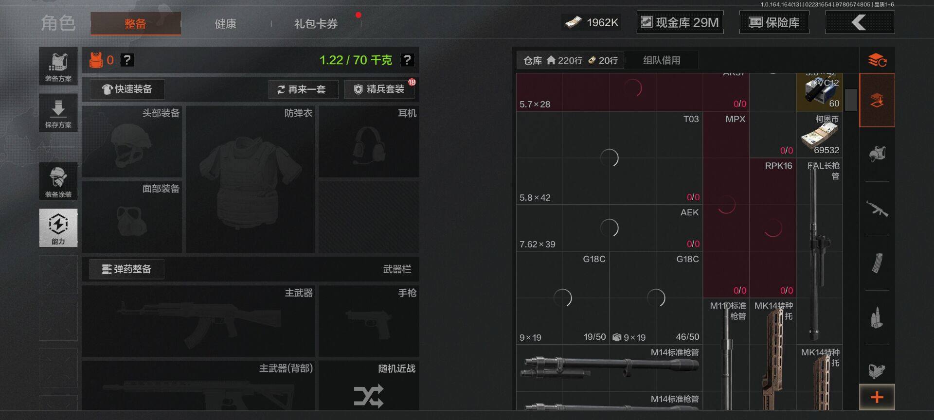 【C265394709】【AQZG1445】等级:30/段位:精英/仓库价值(百万):80.8/柯恩币:1962000/工兵铲/胜利军刀/来战·开山刀/下弦月/告丧夜曲AUG