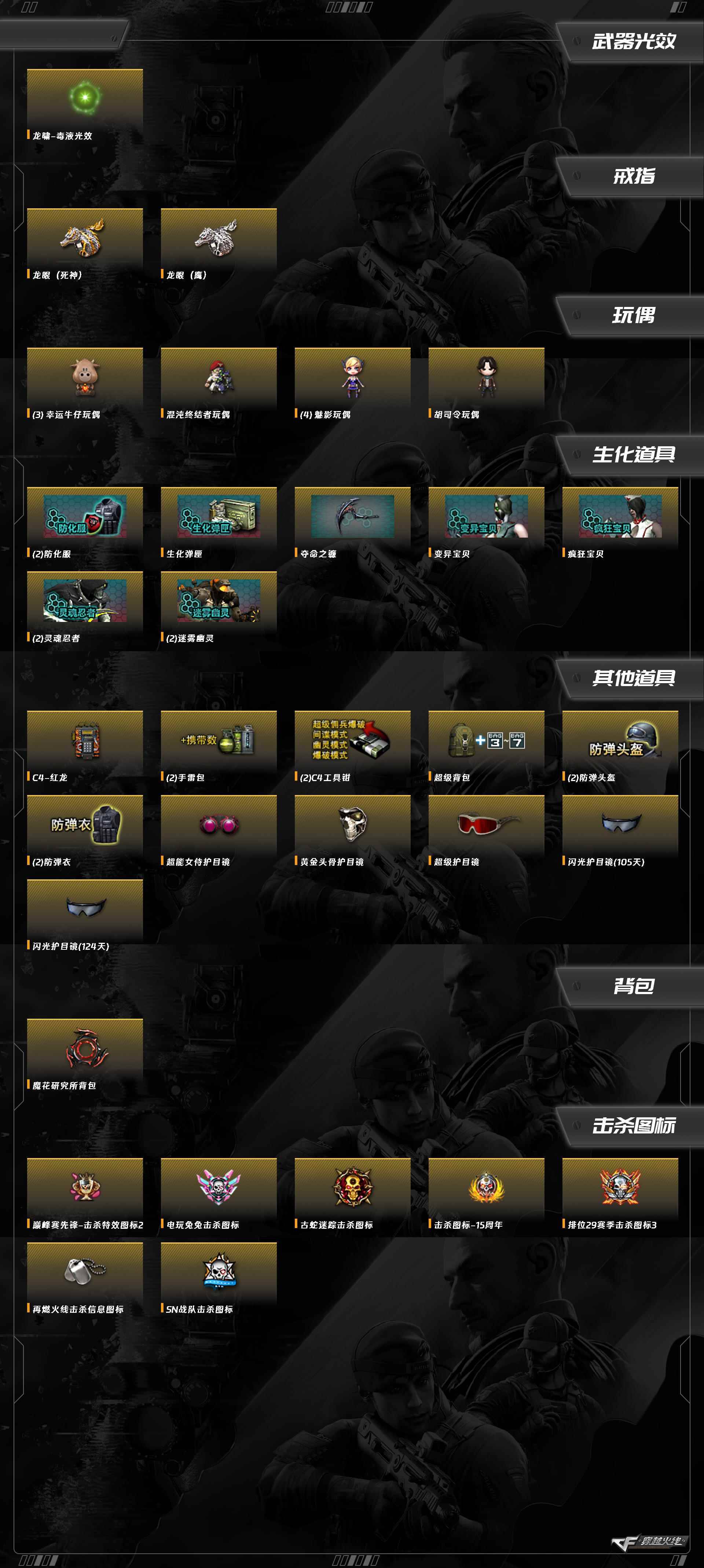 炽芒蝶刃,M200-竞技荣光,AK47-无影,AK-47-猩红传说,AK47-B-战神,AK47-B-常胜将军,M4A1-雷神,黑骑士-海王,Barrett-暗月传说,AWM-裁决,QBZ03-金色蔷薇,擎天-竞技荣光,柯尔特-竞技荣光,屠龙,麒麟刺