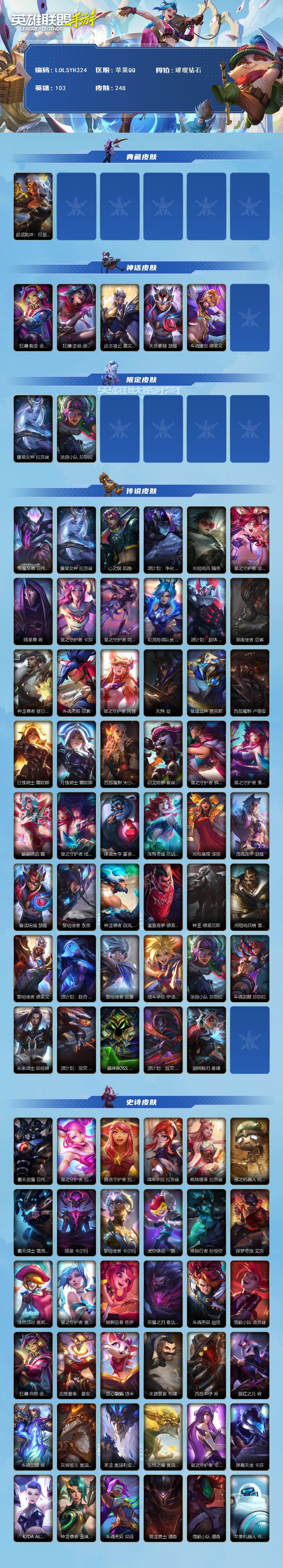 【C265689032】【LOLSYH324】103英雄/248皮肤/璀璨钻石/超武乾坤:征服 莎弥拉/狂潮·裂变 金克丝/狂潮·逆焰 金克丝/此志凌云 嘉文四世/天命豪赌 瑟提/斗魂耀世 德莱文/耀星女神拉克丝/涂鸦小队莎弥拉/海魔至尊 亚托克斯/心之钢 凯隐/源计划: 净化/光明哨兵薇恩/星之守护者 金克丝/暗星尊/星之守护者 卡莎/星之守护者 阿卡丽/幻灵特战队长 菲奥娜/源计划:超体 莫德凯撒/黑夜使者亚索/神龙尊者 昼日真龙 亚索/斗魂无双 亚索/星之守护者阿狸/天煞劫/星域武神 贾克斯/西部魔影卢锡安/日蚀骑士蕾欧娜/月蚀骑士蕾欧娜/西部魔影 大小姐 蕾欧娜/驯龙炮手/星之守护者 辉/星之守护者 落/翩翩绣蕊 霞/星之守护者 陨/律政大亨/深海奇域 厄运小姐/光电璀璨 泽丽/灵魂莲华 瑟提/奋武昭威 瑟提/黎明使者 永恩/神龙尊者 驭风啸龙/灌篮高手/神王诺手/光明哨兵格雷福斯/黎明使者 德莱文/源计划: 联合/黎明使者瑞文/战斗学院ez/斗魂觉醒 莎弥拉/未来战士 凯特琳/源计划:泯灭 雷克顿/最终BOSS维迦/源计划:毁灭 派克/凝辉黯刃 泰隆/霸天剑魔 亚托克斯/星之守护者拉克丝/睡衣守护者拉克丝/战斗学院拉克丝/桃映暖春 拉克丝/殇之机器人/霸天战士狮子狗/暗星 卡尔玛/黎明使者卡尔玛/太空律动 “舞林双子” 努努和威朗普/地狱行者猴子/探梦奇旅 艾克/泳池派对发条/星之守护者发条/焕影迎春佐伊/恶魔之刃/斗魂无双 赵信/清剿小队金克斯/狂潮·异想 金克丝/蕊雪盈春:晏安 赫卡里姆/觅心猫猫/末路管家/西部牛仔/腥红之月烬/斗魂觉醒 烬/灰烬领主/圣龙/东恒之曜 奥瑞利安·索尔/星之守护者 辛德拉/弹幕天使/K/DA ALL OUT卡莎/神龙尊者玉境灵龙/斗魂无双 尼菈/猎龙勇士潘森/清剿小队潘森/苹果机器人/星之守护者萨勒芬妮/海之歌萨勒芬妮/歌手?不!是主唱! 萨勒芬妮/源计划:风/灵魂莲华亚索/电玩女神阿狸/灵能特工天使/未来战士卢锡安/欧米伽小队 魔鬼伞兵/我,羽饰骑士 崔丝塔娜/灵机慧谋 提莫/电玩女神琴女/驯龙女巫/寒冬精灵/永恒之森 霞/翼翼飞花 洛/星域审判官/暗星皇子/柯基/奈落之炎 凯南/赤影磷火 蒙多医生/星之守护者女枪/魅惑女巫女枪/龙腾虎跃腕豪/心之钢 瑟提/灵魂莲华永恩/心之钢 永恩/玉剑传说 风仙子/灵魂收割者 德莱文/破败军团德莱文/斗魂无双 德莱文/神龙尊者 苍龙/海之歌寒冰/冰川巨兽石头人/暗星 墨菲特/欧米伽小队 鬼影蛙人/涂鸦小队 古拉加斯/黑夜使者 弗拉基米尔/玉剑传说 武剑仙/白色死神维鲁斯/觅心射手/源计划:天眼 韦鲁斯/金玉贺吉 艾瑞莉娅/死亡善约卡特/战斗学院卡特/冬境仙灵 索拉卡/源代码索拉卡/星之守护者EZ/心之钢 伊泽瑞尔/地狱火加里奥/战斗学院 杰斯/抵抗军雷神 杰斯/星之守护者COS 厄加特/灵能特工莎弥拉/西部魔影 持枪女巫 莎弥拉/猎龙勇士奥拉夫/光明哨兵奥拉夫/山海绘卷 克格莫/泳池派对女警/灵魂烈焰/神龙尊者 魔龙/欧米伽小队 天雷爆破手 维迦/真实伤害赛娜/怨之砂/绝代智将斯维因/神龙尊者 钢铁之龙 锤石/盗梦暗影 锤石/光灵永燃 锤石/古神狼人/源计划:末日 沃里克/宇航员/星之吞噬者 费德提克/青衫烁锋 卡莉丝塔/灵魂莲华莉莉娅/黑夜使者莉莉娅/红帽迷影 薇古丝/s7绯金战斧/s10王牌上将/s11王牌司令/s12龙冕先锋/s15龙冕异士/s16冠翎飞行员/s17冠翎御风使/S18冠翎巨神像/S19冠翎征服者/海上霸主/暗黑武土狮子狗/光明骑士卡尔玛/斗战胜佛/苍穹之光薇恩/猎龙勇士薇恩/时之砂/国王/秘密特工/龙冕先锋 赵信/死亡绽放/双城之战金克斯/龙冕异士 烬/逍遥赌侠/探戈灵魂崔斯特/冠翎征服者 尼菈/钢铁意志/银色之牙/超武乾坤:暗影 阿卡丽/擂台皇帝/免宝宝布里茨/冰霜烈焰/“你看见过我的熊猫吗?” 安妮/西部牛仔亚索/腥红之月亚索/偶像歌手/焰尾妖狐/宗师级钓鱼训练师/光明骑士贾克斯/末世天使/免宝宝提莫/声威黠影 提莫/甜心宝贝琴女/缪斯女神/邪恶女巫/冰霜亚龙/黯黑魔龙龙女/女警官/双城之战蔚/双城之战:破枷 蔚/王牌上将 嘉文四世/海牛骑士/冠翎飞行员 库奇/超级英雄/超武乾坤:电弧/战争血统/熔火之心/制胜金球/创世魔神/女帝/抵抗军战姬/暗影/末路教父/黑暗骑士男枪/冠翎御风使 迦娜/金牌主播/德莱德莱/绯金战斧 (可升级)/黑暗骑士 艾希/王牌司令 艾希/哞利斯塔/黑暗骑士牛头/无畏号/免宝宝菲兹/免宝宝炸弹人/飞车暴走族/河水之灵/苍穹之光 韦鲁斯/迅剑/冰霜之刀/抵抗军玫瑰/风执事/冠翎巨神像 加里奥/蔷薇绅士 杰斯/铁血狙击手/腥红之月 鬼武者/黑暗骑士布兰德/鳄霸/穿着正装的恶魔/战争机器/南瓜头 费德提克/兔宝宝 莉莉娅/兔宝宝 薇古丝