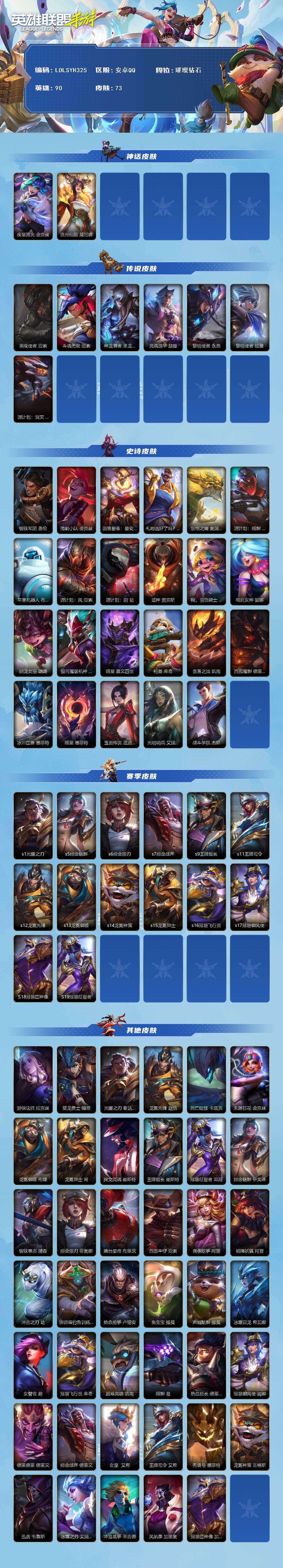 【C265642040】【LOLSYH325】90英雄/73皮肤/璀璨钻石/夜星流火 金克丝/流光仙韵 莫甘娜/黑夜使者亚索/斗魂无双 亚索/神龙尊者 圣龙 李青/灵魂莲华 瑟提/黎明使者 永恩/黎明使者瑞文/源计划:泯灭 雷克顿/钢铁军团/清剿小队金克斯/蕊雪盈春:晏安 赫卡里姆/礼物选好了吗? 布隆/东恒之曜 奥瑞利安·索尔/源计划: 暗影/苹果机器人/源计划:风/源计划: 阴/武神/我,羽饰骑士 崔丝塔娜/电玩女神琴女/驯龙女巫/银河魔装机神龙女/暗星皇子/柯基/奈落之炎 凯南/西部魔影诺手/冰川巨兽石头人/暗星 墨菲特/玉剑传说 武剑仙/光明哨兵刀妹/战斗学院 杰斯/s1光耀之刃/s5绯金魅影/s6绯金丽刃/s7绯金战斧/s9王牌舰长/s11王牌司令/s12龙冕先锋/s13龙冕御盾/s14龙冕神策/s15龙冕异士/s16冠翎飞行员/s17冠翎御风使/S18冠翎巨神像/S19冠翎征服者/游侠法师/猎龙勇士薇恩/光耀之刃蛮王/龙冕先锋 赵信/死亡绽放/末路狂花/龙冕御盾 布隆/龙冕异士 烬/探戈灵魂崔斯特/王牌舰长/冠翎征服者 尼菈/绯金魅影 (可升级)/钢铁意志/绯金丽刃(可升级)/擂台皇帝/西部牛仔亚索/偶像歌手/焰尾妖狐/冲击之刃劫/宗师级钓鱼训练师/绝命抢手/免宝宝提莫/声威黠影 提莫/冰霜亚龙/女警官/冠翎飞行员 库奇/超级英雄/暗影/热血班长/冠翎御风使 迦娜/德莱德莱/绯金战斧 (可升级)/女皇/王牌司令 艾希/无畏号/龙冕神策 吉格斯/迅剑/冰霜之刀/冲浪高手/风执事/冠翎巨神像 加里奥