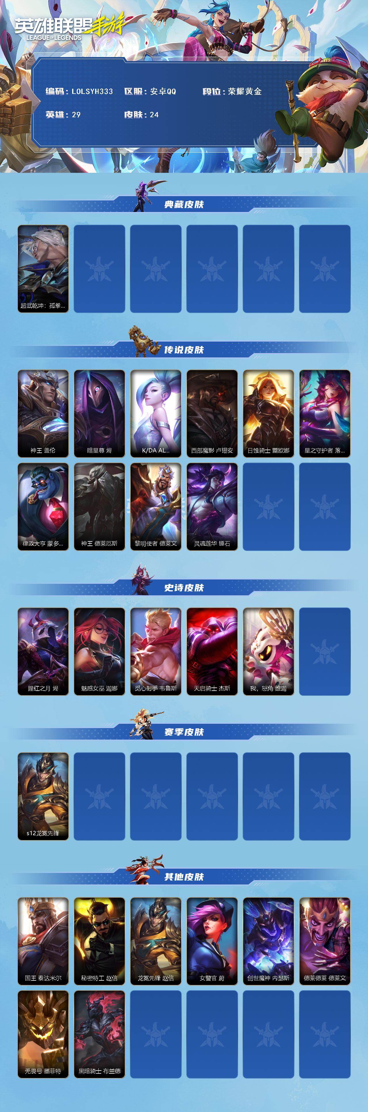 【C266082753】【LOLSYH333】29英雄/24皮肤/1典藏/荣耀黄金/超武乾坤:孤拳 瑟提/神王盖伦/暗星尊/K/DA ALLOUT萨勒芬妮/西部魔影卢锡安/日蚀骑士蕾欧娜/星之守护者 落/律政大亨/神王诺手/黎明使者 德莱文/灵魂莲华锤石/腥红之月烬/魅惑女巫风女/觅心射手/天启骑士/我,怒角/s12龙冕先锋/国王/秘密特工/龙冕先锋 赵信/女警官/创世魔神/德莱德莱/无畏号/黑暗骑士布兰德