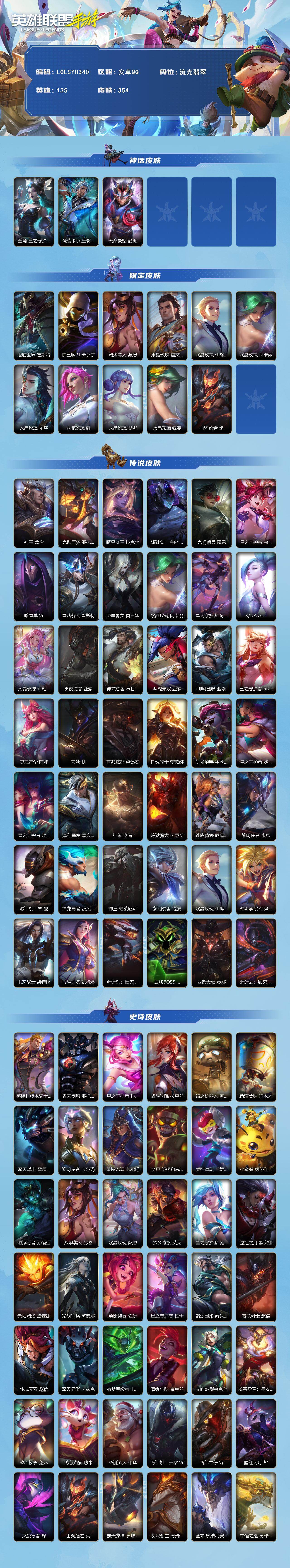【C266261447】【LOLSYH340】135英雄/354皮肤/3神话/42传说/流光翡翠/至臻 星之守护者 辛德拉/臻藏 御风墨影 亚索/天命豪赌 瑟提/地底世界 崔斯特/掠星魔刃卡萨丁/烈焰美人 薇恩/水晶玫瑰皇子/水晶玫瑰 伊泽瑞尔/水晶玫瑰阿卡丽/水晶玫瑰永恩/水晶玫瑰蔚/水晶玫瑰琴女/水晶玫瑰 锐雯/山海绘卷 烬/神王盖伦/光影巨翼 亚托克斯/暗星女王拉克丝/源计划: 净化/光明哨兵薇恩/星之守护者 金克丝/暗星尊/星域游侠卡牌/至尊魔女 莫甘娜/星之守护者 阿卡丽/K/DA ALLOUT萨勒芬妮/水晶玫瑰 萨勒芬妮/黑夜使者亚索/神龙尊者 昼日真龙 亚索/斗魂无双 亚索/御风墨影 亚索/星之守护者阿狸/灵魂莲华 阿狸/天煞劫/西部魔影卢锡安/日蚀骑士蕾欧娜/驯龙炮手/星之守护者 辉/星之守护者 陨/淳和墨意 嘉文四世/神拳盲僧/炼狱魔犬/跳跳倩影 厄运小姐/黎明使者 永恩/源计划:林 易/神龙尊者 驭风啸龙/神王诺手/黎明使者瑞文/水晶玫瑰EZ/战斗学院ez/未来战士 凯特琳/战斗学院 凯特琳/源计划:泯灭 雷克顿/最终BOSS维迦/西部天使赛娜/源计划:毁灭 派克/整装!旋木骑士 盖伦/霸天剑魔 亚托克斯/星之守护者拉克丝/战斗学院拉克丝/殇之机器人/劲道美味 阿木木/霸天战士狮子狗/黎明使者卡尔玛/星域先知(可升级)/丧尸 努努和威朗普/太空律动 “舞林双子” 努努和威朗普/小蜜蜂 努努和威朗普/地狱行者猴子/烈焰美人薇恩/水晶玫瑰 薇恩/探梦奇旅 艾克/星之守护者发条/腥红之月皎月/无限烈焰/光明哨兵戴安娜/焕影迎春佐伊/星之守护者 佐伊/端劲墨印 泰达米尔/猎龙勇士赵信/斗魂无双 赵信/霸天异形螳螂/猎梦吞噬者 卡兹克/清剿小队金克斯/喵喵魅影金克丝/蕊雪盈春:晏安 赫卡里姆/战斗校长猫咪/觅心猫猫/圣诞老人/源计划: 升华/西部牛仔/腥红之月烬/灭迹行者 烬/霸天龙神龙王/灰烬领主/圣龙/东恒之曜 奥瑞利安·索尔/星之守护者 辛德拉/弹幕天使/电玩女神卡莎/斗魂无双 尼菈/魅惑女巫 莫甘娜/K/DA ALL OUT寡妇/猎龙勇士潘森/清剿小队潘森/K/DA ALL OUT阿卡丽/源计划: 暗影/苹果机器人/战场之王机器人/星之守护者萨勒芬妮/海之歌萨勒芬妮/福牛守护者安妮/源计划:风/战场之王亚索/灵魂莲华亚索/K/DA ALL OUT阿狸/幻梦甜心 阿狸/源计划: 阴/死亡哲约劫/灵能特工劫/秘旅探索者贾克斯/灵能特工天使/屠龙勇士 凯尔/源计划: 雷/未来战士卢锡安/源计划: 山/战斗学院蕾欧娜/欧米伽小队 魔鬼伞兵/小恶魔/我,羽饰骑士 崔丝塔娜/大魔王/小蜜蜂 提莫/寒冬精灵/破败军团龙女/源计划: 裁决/燎原烈焰蔚/秀逸墨羽 霞/永恒之森 洛/欧米伽小队 毒针狙击手 图奇/太空律动“百万调音”/水晶玫瑰 格温/星域审判官/暗星皇子/福牛守护者皇子/泳池派对盲僧/地下拳王/电玩上校/奈落之炎 凯南/光源盛放 婕拉/盗梦者/NOVA天赋觉醒狗头/北辰之威 内瑟斯/星之守护者女枪/电玩女神女枪/魅惑女巫女枪/破败军团女枪/源计划: 燃/神龙尊者 炎龙 瑟提/灵魂莲华永恩/心之钢 永恩/持胡萝卜的雪人/玉剑传说 无极 易/西部魔影诺手/福牛守护者诺手/泳池派对男枪/战斗教授男枪/绝命机甲男枪/星之守护者风女/玉剑传说 风仙子/魅惑女巫风女/温雅墨曲 迦娜/灵魂收割者 德莱文/破败军团德莱文/海之歌寒冰/霸天巨兽石头人/暗星 墨菲特/虚空海灵/柚子软糖 菲兹/战场之王炸弹人/黑夜使者 弗拉基米尔/电玩勇者 锐雯/光明哨兵锐雯/暗星维鲁斯/源计划:天眼 韦鲁斯/玉剑传说 舞剑仙 艾瑞莉娅/西部天使/光明哨兵刀妹/斗魂无双 艾瑞莉娅/源计划: 雄心/战斗学院卡特/西部魔影 执行人 卡特琳娜/星之守护者 索拉卡/冬境仙灵 索拉卡/源代码索拉卡/星域学者/电玩勇者/星之守护者EZ/地狱火加里奥/霸天战鹰 加里奥/黎明使者 阿克尚/天启骑士/神奇先驱杰斯/水晶玫瑰 杰斯/西部魔影厄加特/星之守护者COS 厄加特/西部魔影 持枪女巫 莎弥拉/猎龙勇士奥拉夫/泉眼永不干涸! 丽桑卓/踏春来女警/奈落之炎/苍穹之光火男/灵魂烈焰/神龙尊者 魔龙/泳池派对鳄鱼/黯晶巨鳄 雷克顿/欧米伽小队 天雷爆破手 维迦/冰糖葫芦 维迦/真实伤害赛娜/星之守护者赛娜/怨之砂/西部魔影 猎天使恶魔 泰隆/星域秘刃 泰隆/未来战士锤石/盗梦暗影 锤石/古神狼人/灵魂莲华莉莉娅/黑夜使者莉莉娅/雷霆领主 奥恩/星域巫灵 薇古丝/s1光耀之刃/s2光耀之芒/s3光耀之灵/s4光耀之心/s5绯金魅影/s6绯金丽刃/s7绯金战斧/s8绯金皎灵/s9王牌舰长/s10王牌上将/S11王牌勇将/s11王牌司令/s12龙冕先锋/s13龙冕御盾/s14龙冕神策/s15龙冕异士/s16冠翎飞行员/s17冠翎御风使/S18冠翎巨神像/S19冠翎征服者/死亡骑士/海上霸主/游侠法师/小小骑士/暗黑武土狮子狗/光明骑士卡尔玛/脏兮兮/三味真火/斗战胜佛/苍穹之光薇恩/猎龙勇士薇恩/哥特女仆/光耀之心发条/暗黑女武神皎月/国王/光耀之刃蛮王/兄弟已百暴! 泰达米尔/秘密特工/龙冕先锋 赵信/死亡绽放/末路狂花/光耀之芒金克斯/猎龙勇士布隆/狮心 布隆/龙冕御盾 布隆/龙冕异士 烬/地底世界/逍遥赌侠/探戈灵魂崔斯特/王牌舰长/冠翎征服者 尼菈/探戈灵魂寡妇/绯金魅影 (可升级)/钢铁意志/银色之牙/超武乾坤:暗影 阿卡丽/皇家守卫/绯金丽刃(可升级)/擂台皇帝/免宝宝布里茨/小红帽/西部牛仔亚索/腥红之月亚索/偶像歌手/焰尾妖狐/冲击之刃劫/宗师级钓鱼训练师/光明骑士贾克斯/末世天使/绝命抢手/烧烤女神/游击队员/熊猫/五连摇滚键盘手/缪