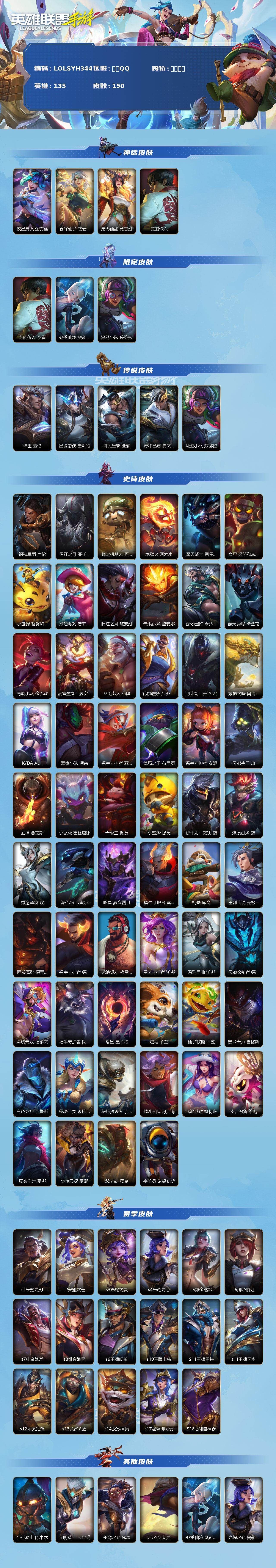 【C266397581】【LOLSYH344】135英雄/150皮肤/华贵铂金/夜星流火 金克丝/春晖仙子 苍云缥缈 卡莎/流光仙韵 莫甘娜/龙的传人盲僧/冬季仙境发条/涂鸦小队莎弥拉/神王盖伦/星域游侠卡牌/御风墨影 亚索/淳和墨意 嘉文四世/钢铁军团/腥红之月剑魔/殇之机器人/地狱火阿木木/霸天战士狮子狗/丧尸 努努和威朗普/小蜜蜂 努努和威朗普/泳池派对发条/腥红之月皎月/无限烈焰/端劲墨印 泰达米尔/霸天异形螳螂/清剿小队金克斯/蕊雪盈春:晏安 赫卡里姆/圣诞老人/礼物选好了吗? 布隆/源计划: 升华/东恒之曜 奥瑞利安·索尔/K/DA ALL OUT寡妇/清剿小队潘森/福牛守护者剑姬/战场之王机器人/福牛守护者安妮/灵能特工劫/武神/小恶魔/大魔王/小蜜蜂 提莫/源计划: 裁决/燎原烈焰蔚/秀逸墨羽 霞/源代码青钢影/暗星皇子/福牛守护者皇子/柯基/玉剑传说 无极 易/西部魔影诺手/福牛守护者诺手/泳池派对男枪/星之守护者风女/温雅墨曲 迦娜/灵魂收割者 德莱文/斗魂无双 德莱文/福牛守护者牛头/暗星 墨菲特/绒毛/柚子软糖 菲兹/奥术大师吉格斯/白色死神维鲁斯/冬境仙灵 索拉卡/秘旅探索者加里奥/战斗学院阿克尚/泳池派对女警/我,怒角/真实伤害赛娜/梦境灵探赛娜/怨之砂/宇航员/s1光耀之刃/s2光耀之芒/s3光耀之灵/s4光耀之心/s5绯金魅影/s6绯金丽刃/s7绯金战斧/s8绯金皎灵/s9王牌舰长/s10王牌上将/S11王牌勇将/s11王牌司令/s12龙冕先锋/s13龙冕御盾/s14龙冕神策/s17冠翎御风使/S18冠翎巨神像/小小骑士/光明骑士卡尔玛/苍穹之光薇恩/时之砂/光耀之心发条/暗黑女武神皎月/国王/光耀之刃蛮王/龙冕先锋 赵信/死亡绽放/末路狂花/光耀之芒金克斯/狮心 布隆/龙冕御盾 布隆/探戈灵魂崔斯特/王牌舰长/刀锋女王/探戈灵魂寡妇/绯金魅影 (可升级)/银色之牙/绯金丽刃(可升级)/擂台皇帝/小红帽/西部牛仔亚索/偶像歌手/焰尾妖狐/冲击之刃劫/末世天使/烧烤女神/游击队员/免宝宝提莫/熊猫/声威黠影 提莫/光耀之灵/冰霜亚龙/女警官/王牌上将 嘉文四世/海牛骑士/腥红之月凯南/超级英雄/战争血统/熔火之心/制胜金球/创世魔神/单身贵族/西部牛仔女枪/抵抗军战姬/热血班长/末路教父/无情重炮/暴风女神/冠翎御风使 迦娜/德莱德莱/绯金战斧 (可升级)/极地女神/王牌司令 艾希/腥红之月 基兰/哞利斯塔/无畏号/免宝宝炸弹人/龙冕神策 吉格斯/河水之灵/绯金鲛灵(可升级)/苍穹之光 韦鲁斯/迅剑/冰霜之刀/莲花之令刀妹/海贼魅影/冲浪高手/光执事EZ/冰川勇者/风执事/冠翎巨神像 加里奥/光明之锤杰斯/铁哥们儿奥拉夫/王牌勇将 奥拉夫/铁血狙击手/腥红之月 鬼武者/黑暗骑士布兰德/枯萎之壤/鳄霸/兔宝宝 薇古丝