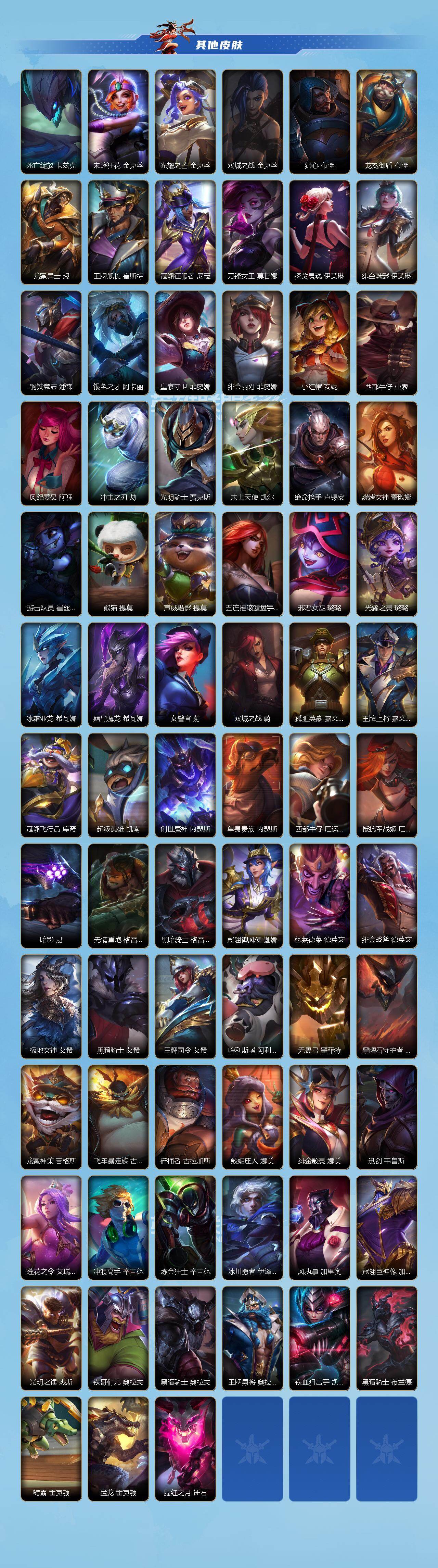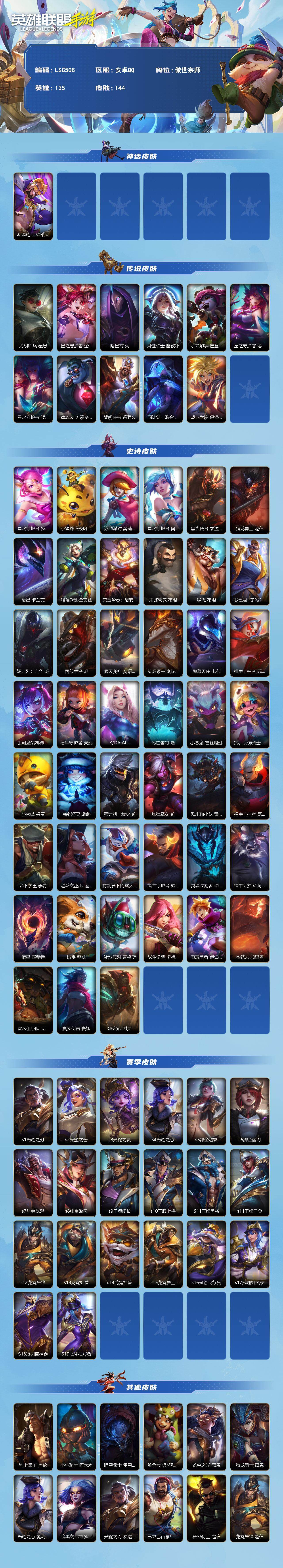 【C267296860】【LSC508】135英雄/144皮肤/1神话/11传说/45史诗/傲世宗师/斗魂耀世 德莱文/光明哨兵薇恩/星之守护者 金克丝/暗星尊/月蚀骑士蕾欧娜/驯龙炮手/星之守护者 落/星之守护者 陨/律政大亨/黎明使者 德莱文/源计划: 联合/战斗学院ez/星之守护者拉克丝/小蜜蜂 努努和威朗普/泳池派对发条/星之守护者发条/黑夜使者 泰达米尔/猎龙勇士赵信/暗星螳螂/喵喵魅影金克丝/蕊雪盈春:晏安 赫卡里姆/末路管家/猛虎布隆/礼物选好了吗? 布隆/源计划: 升华/西部牛仔/霸天龙神龙王/灰烬领主/弹幕天使/福牛守护者剑姬/银河魔装机神安妮/福牛守护者安妮/K/DA ALL OUT阿狸/死亡哲约劫/小恶魔/我,羽饰骑士 崔丝塔娜/小蜜蜂 提莫/寒冬精灵/源计划: 裁决/炼狱魔女/欧米伽小队 毒针狙击手 图奇/福牛守护者皇子/地下拳王/魅惑女巫女枪/持胡萝卜的雪人/福牛守护者诺手/灵魂收割者 德莱文/福牛守护者牛头/暗星 墨菲特/绒毛/泳池派对炸弹人/战斗学院卡特/电玩勇者/地狱火加里奥/欧米伽小队 天雷爆破手 维迦/真实伤害赛娜/怨之砂/s1光耀之刃/s2光耀之芒/s3光耀之灵/s4光耀之心/s5绯金魅影/s6绯金丽刃/s7绯金战斧/s8绯金皎灵/s9王牌舰长/s10王牌上将/S11王牌勇将/s11王牌司令/s12龙冕先锋/s13龙冕御盾/s14龙冕神策/s15龙冕异士/s16冠翎飞行员/s17冠翎御风使/S18冠翎巨神像/S19冠翎征服者/海上霸主/小小骑士/暗黑武土狮子狗/脏兮兮/苍穹之光薇恩/猎龙勇士薇恩/光耀之心发条/暗黑女武神皎月/光耀之刃蛮王/兄弟已百暴! 泰达米尔/秘密特工/龙冕先锋 赵信/死亡绽放/末路狂花/光耀之芒金克斯/双城之战金克斯/狮心 布隆/龙冕御盾 布隆/龙冕异士 烬/王牌舰长/冠翎征服者 尼菈/刀锋女王/探戈灵魂寡妇/绯金魅影 (可升级)/钢铁意志/银色之牙/皇家守卫/绯金丽刃(可升级)/小红帽/西部牛仔亚索/风纪委员/冲击之刃劫/光明骑士贾克斯/末世天使/绝命抢手/烧烤女神/游击队员/熊猫/声威黠影 提莫/五连摇滚键盘手/邪恶女巫/光耀之灵/冰霜亚龙/黯黑魔龙龙女/女警官/双城之战蔚/孤胆英豪/王牌上将 嘉文四世/冠翎飞行员 库奇/超级英雄/创世魔神/单身贵族/西部牛仔女枪/抵抗军战姬/暗影/无情重炮/黑暗骑士男枪/冠翎御风使 迦娜/德莱德莱/绯金战斧 (可升级)/极地女神/黑暗骑士 艾希/王牌司令 艾希/哞利斯塔/无畏号/黑曜石守护者/龙冕神策 吉格斯/飞车暴走族/碎桶者/鲛妮座人 娜美/绯金鲛灵(可升级)/迅剑/莲花之令刀妹/冲浪高手/炼金狂士/冰川勇者/风执事/冠翎巨神像 加里奥/光明之锤杰斯/铁哥们儿奥拉夫/黑暗骑士奥拉夫/王牌勇将 奥拉夫/铁血狙击手/黑暗骑士布兰德/鳄霸/猛龙 雷克顿/腥红之月锤石