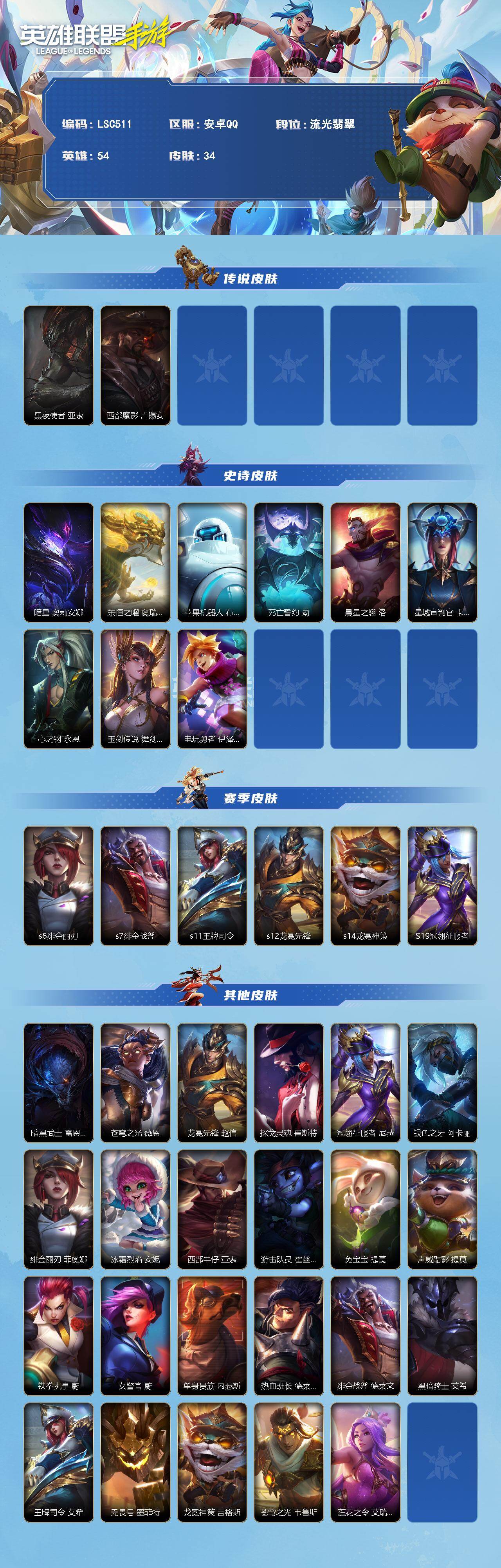 【C267378280】【LSC511】54英雄/34皮肤/2传说/流光翡翠/黑夜使者亚索/西部魔影卢锡安/暗星发条/东恒之曜 奥瑞利安·索尔/苹果机器人/死亡哲约劫/晨星之翎/星域审判官/心之钢 永恩/玉剑传说 舞剑仙 艾瑞莉娅/电玩勇者/s6绯金丽刃/s7绯金战斧/s11王牌司令/s12龙冕先锋/s14龙冕神策/S19冠翎征服者/暗黑武土狮子狗/苍穹之光薇恩/龙冕先锋 赵信/探戈灵魂崔斯特/冠翎征服者 尼菈/银色之牙/绯金丽刃(可升级)/冰霜烈焰/西部牛仔亚索/游击队员/免宝宝提莫/声威黠影 提莫/铁拳执事/女警官/单身贵族/热血班长/绯金战斧 (可升级)/黑暗骑士 艾希/王牌司令 艾希/无畏号/龙冕神策 吉格斯/苍穹之光 韦鲁斯/莲花之令刀妹