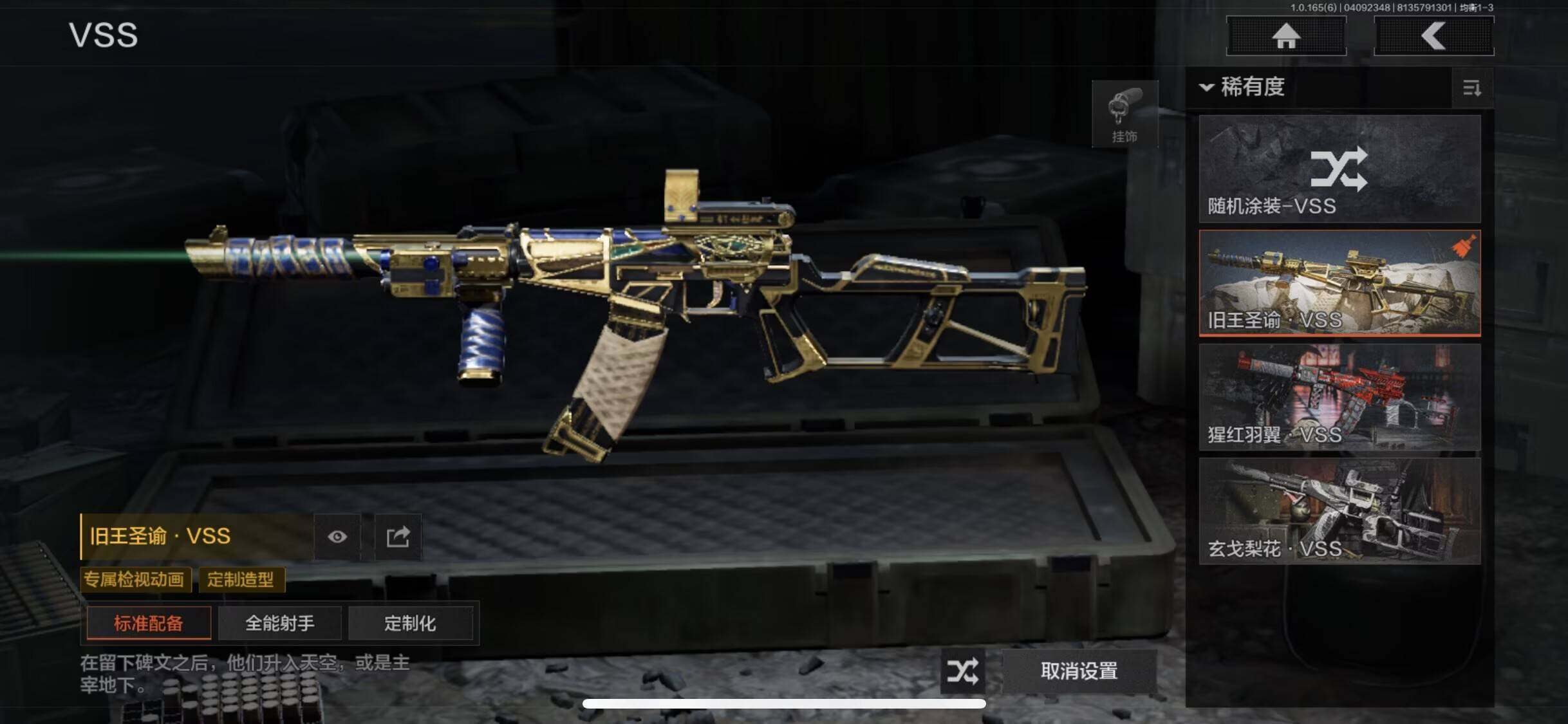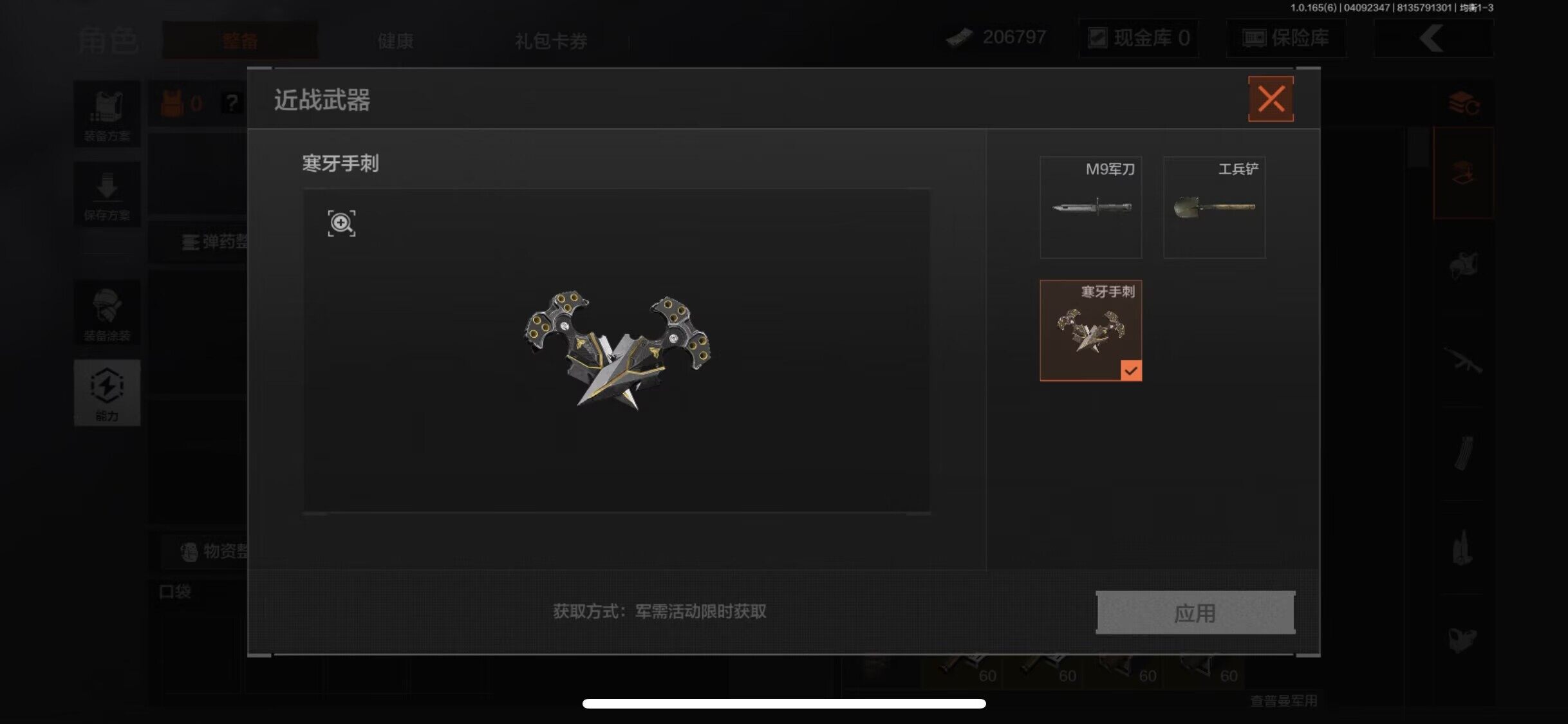 【C269920089】【AQD336】等级:30/段位:大师/仓库价值(百万):1/柯恩币:206797/寒牙手刺/使徒欧瑞恩/镀火熔金H416/旧王圣谕VSS/旧王圣谕QBZ191/告丧夜曲AUG/告丧夜曲AR57/芭斯特