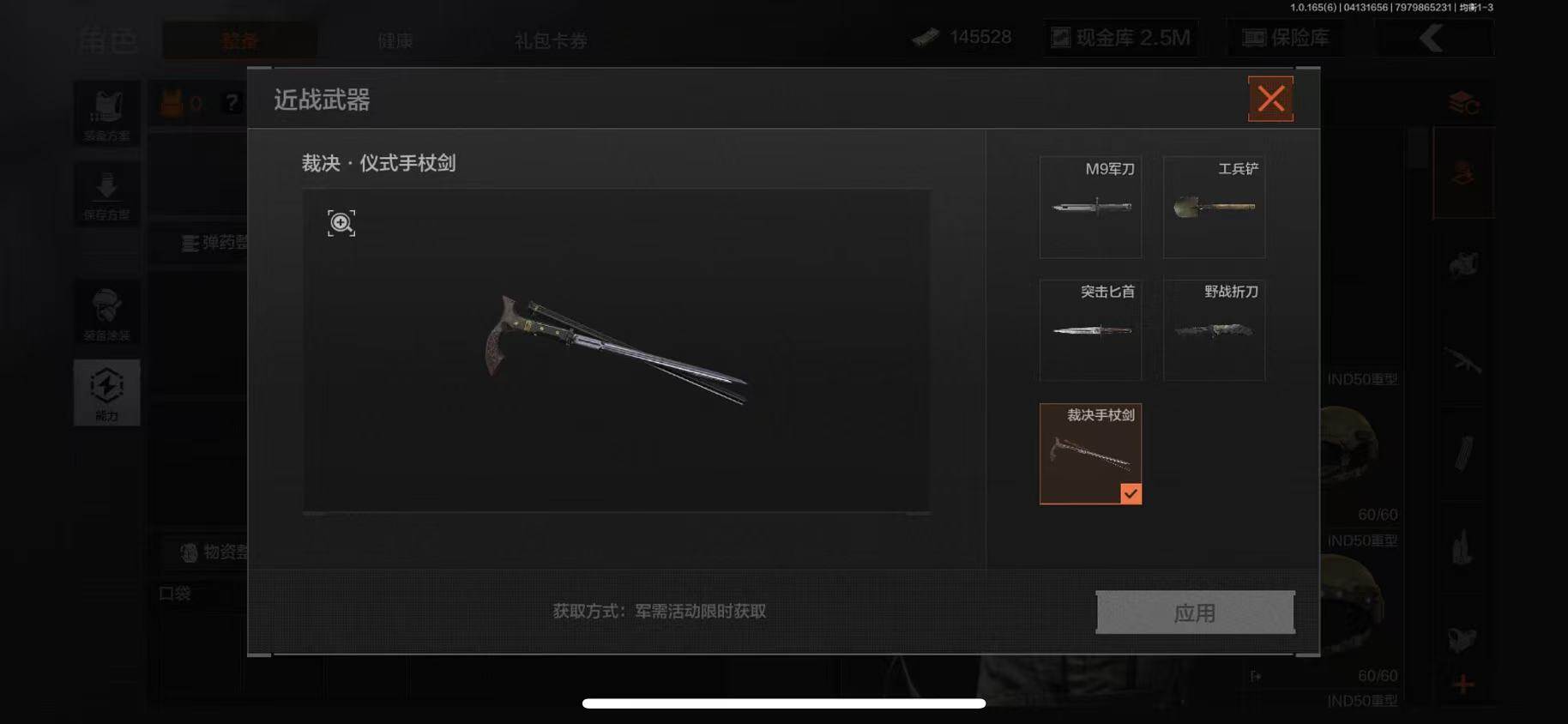 【C2610255708】【AQSA125】等级:30/段位:精英/裁决手杖剑/工兵铲/突击匕首/野战折刀