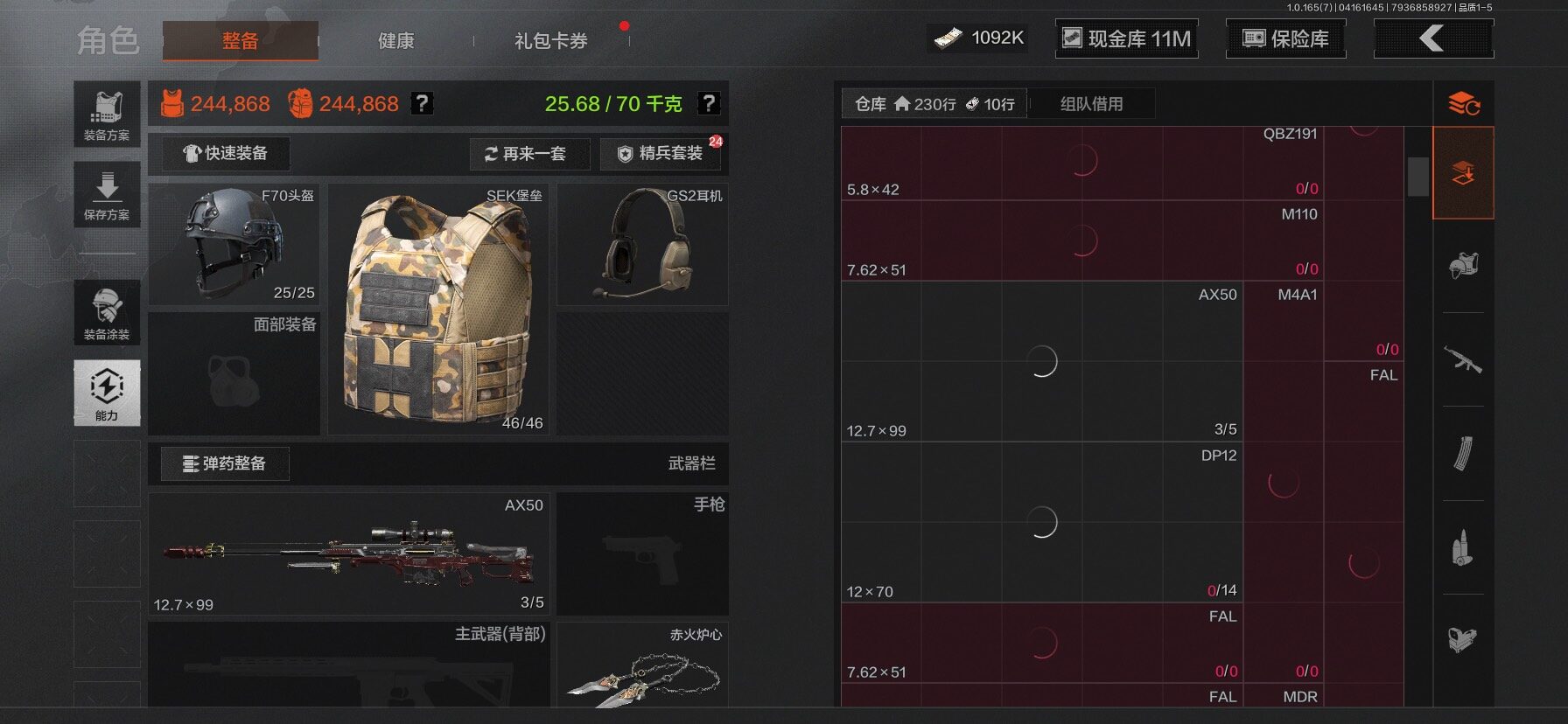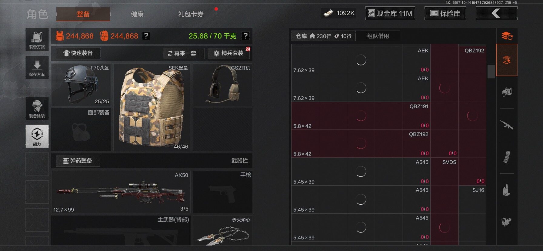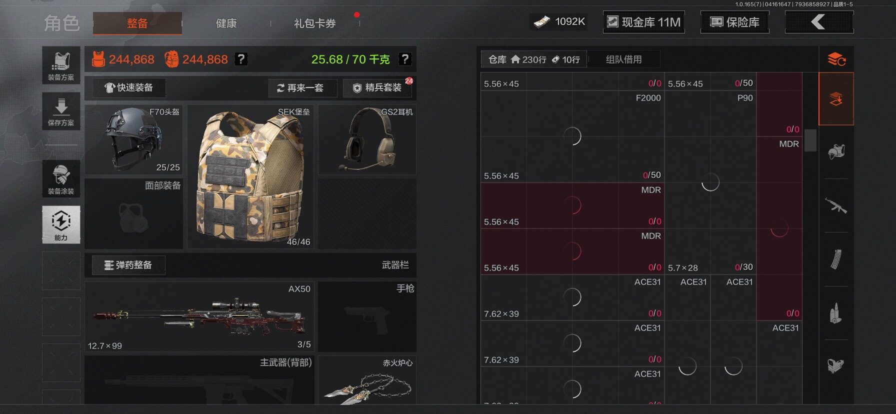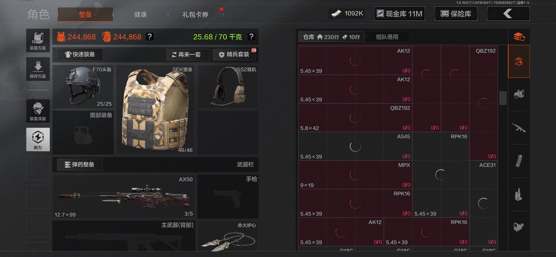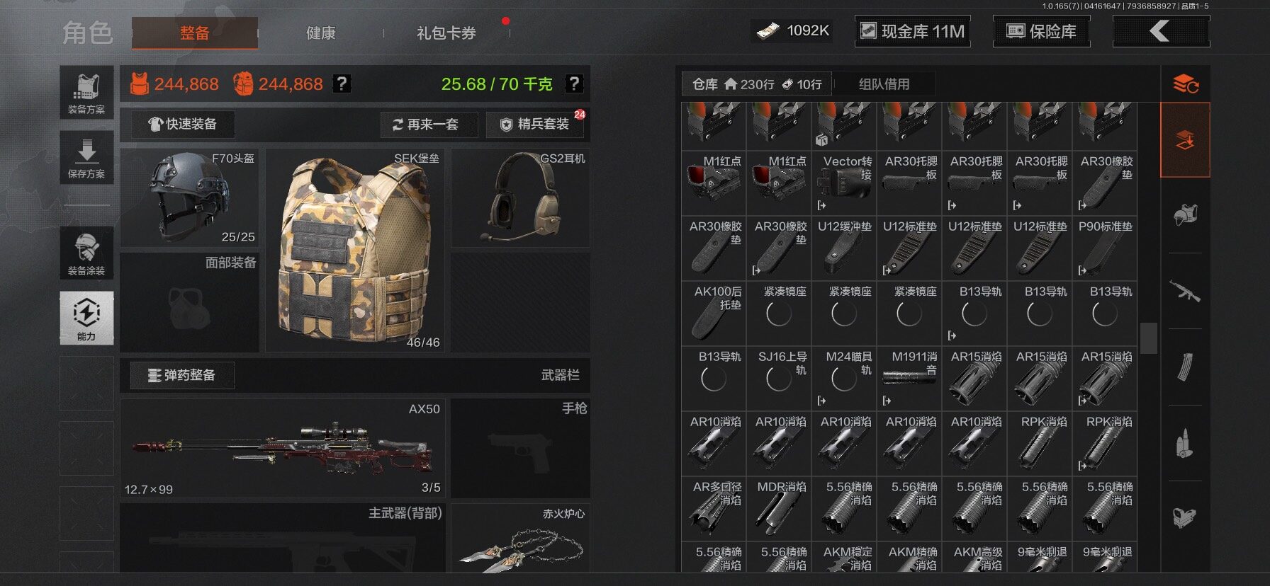 【C2610597724】【AQZG2222】等级:30/段位:新锐/仓库价值(百万):31.4/柯恩币:1092/工兵铲/百炼恒常/赤火炉心/野战折刀/蝮蛇/苍白隐者伪装服/深潜行者II/冥河/长夜千军武将