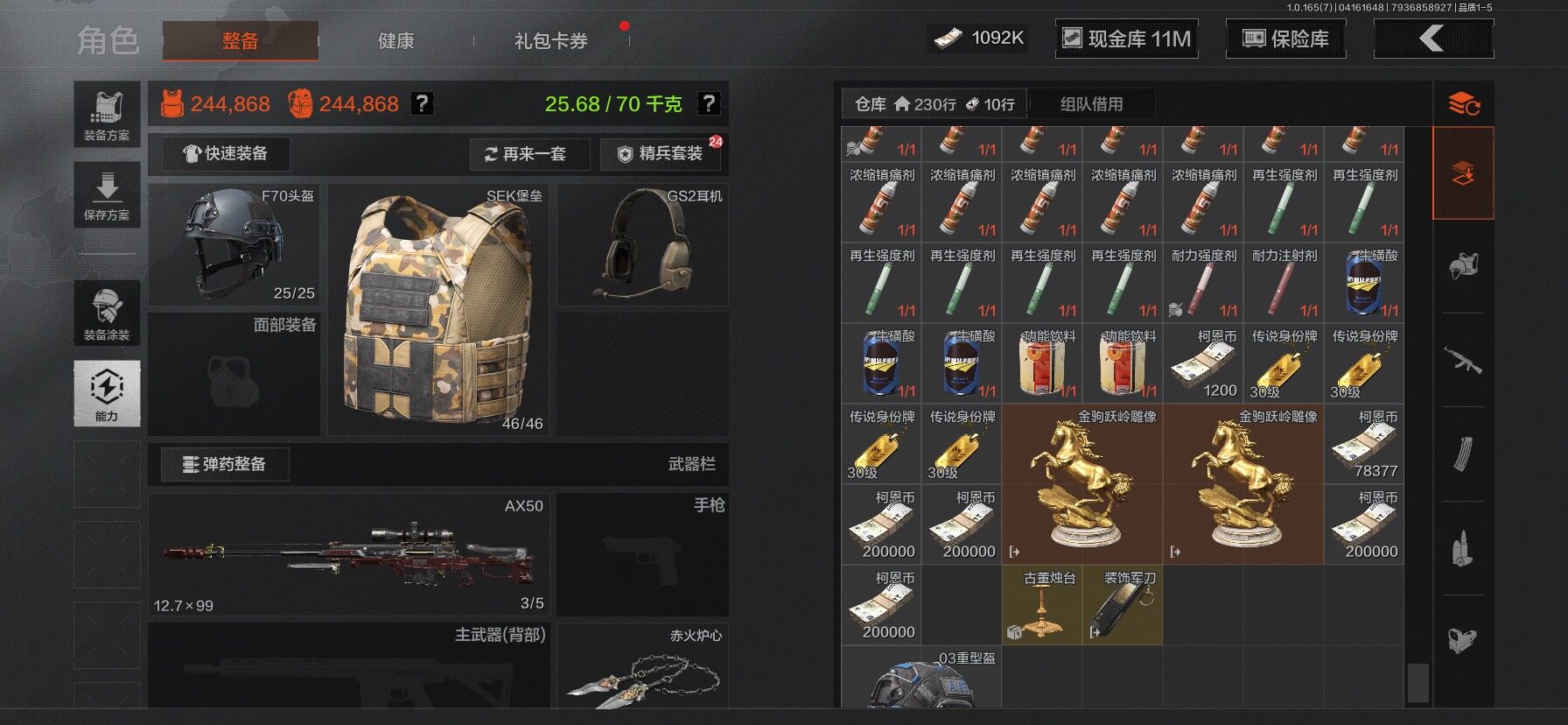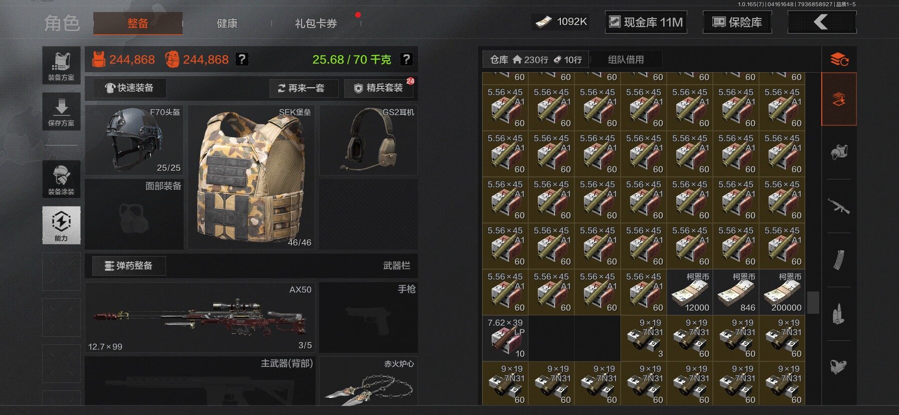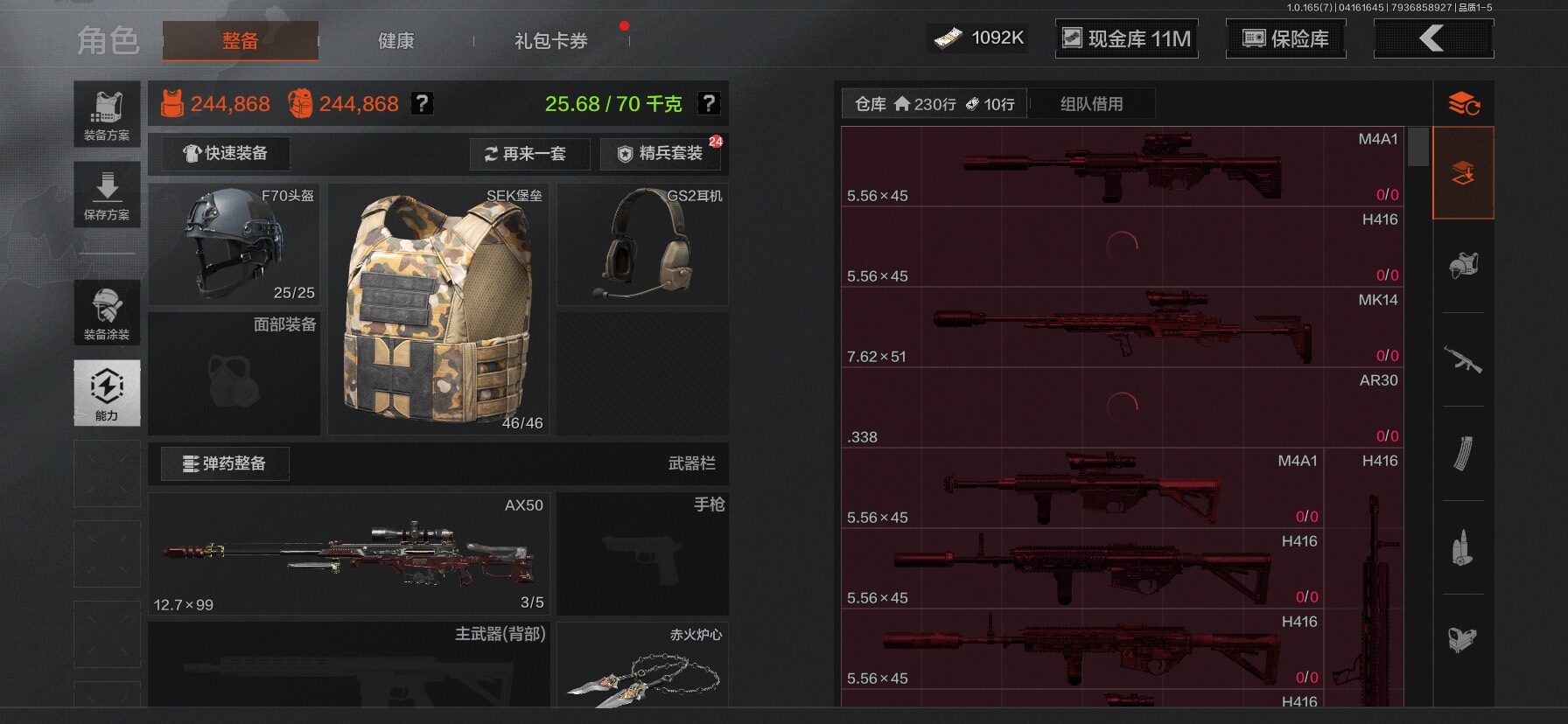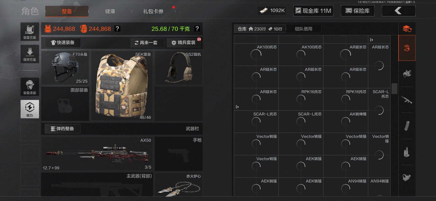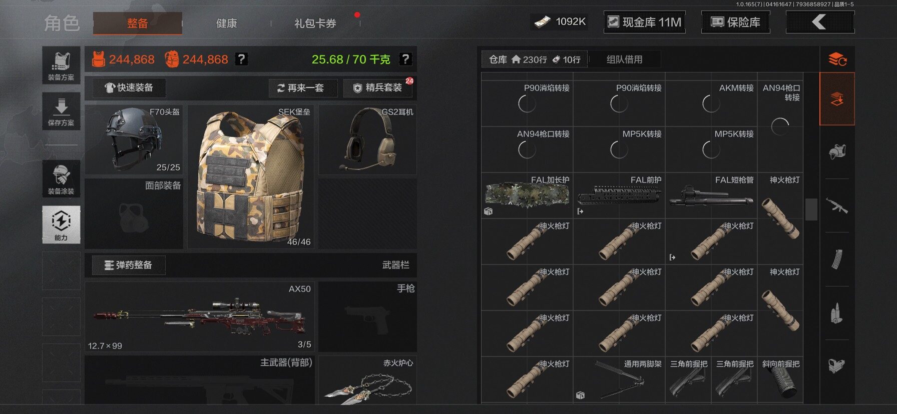 【C2610597724】【AQZG2222】等级:30/段位:新锐/仓库价值(百万):31.4/柯恩币:1092/工兵铲/百炼恒常/赤火炉心/野战折刀/蝮蛇/苍白隐者伪装服/深潜行者II/冥河/长夜千军武将