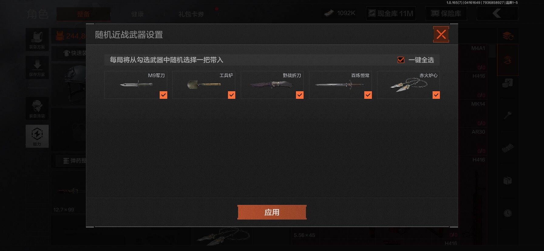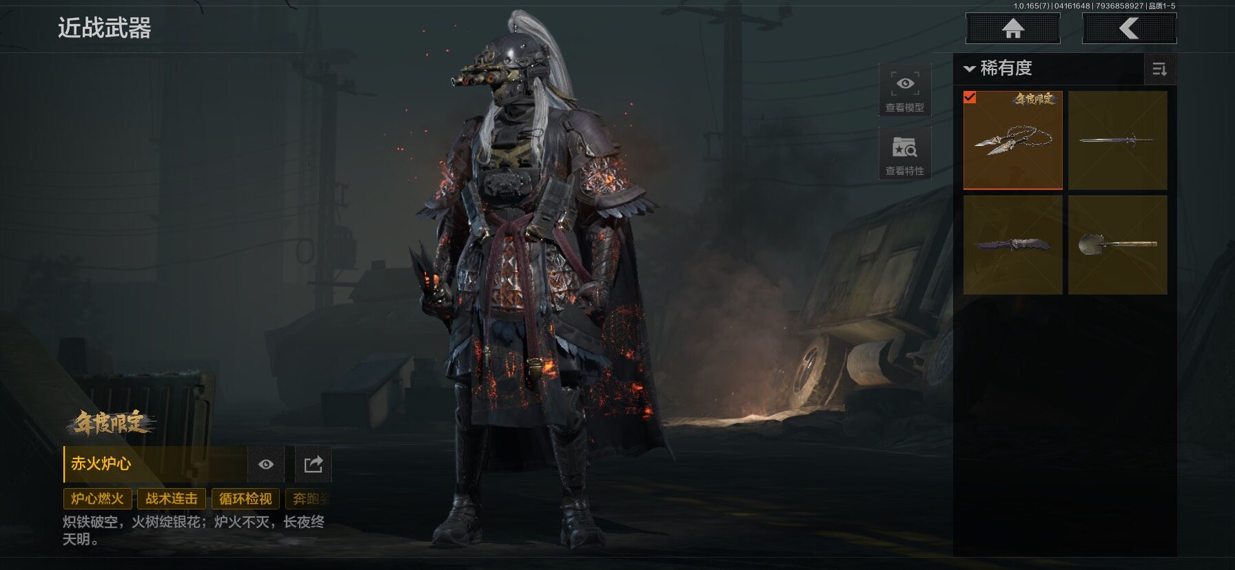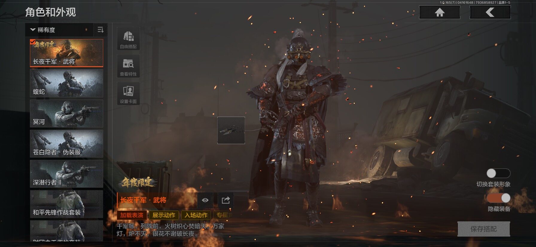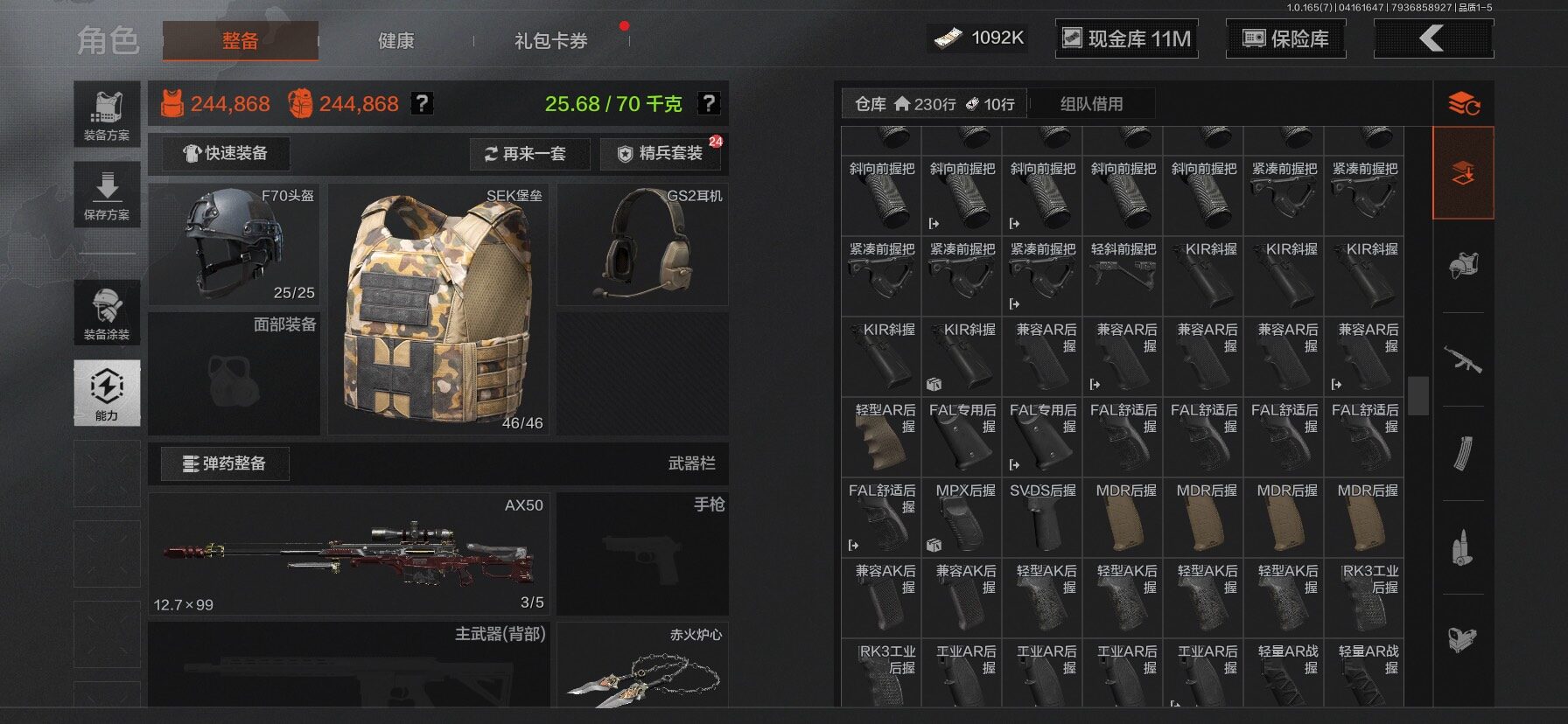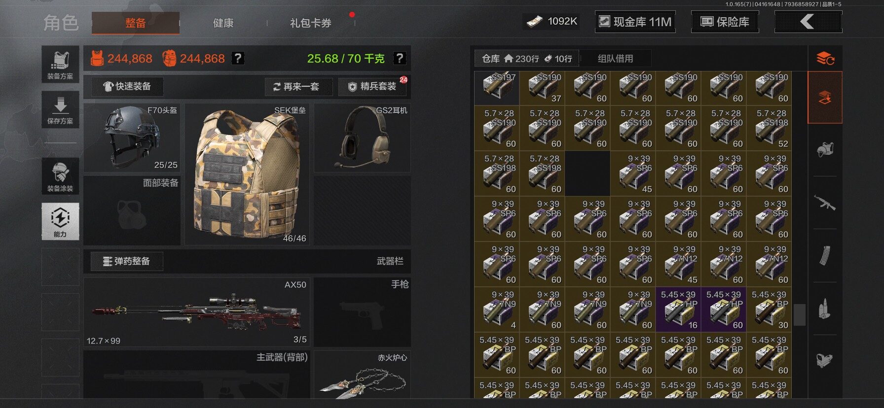 【C2610597724】【AQZG2222】等级:30/段位:新锐/仓库价值(百万):31.4/柯恩币:1092/工兵铲/百炼恒常/赤火炉心/野战折刀/蝮蛇/苍白隐者伪装服/深潜行者II/冥河/长夜千军武将